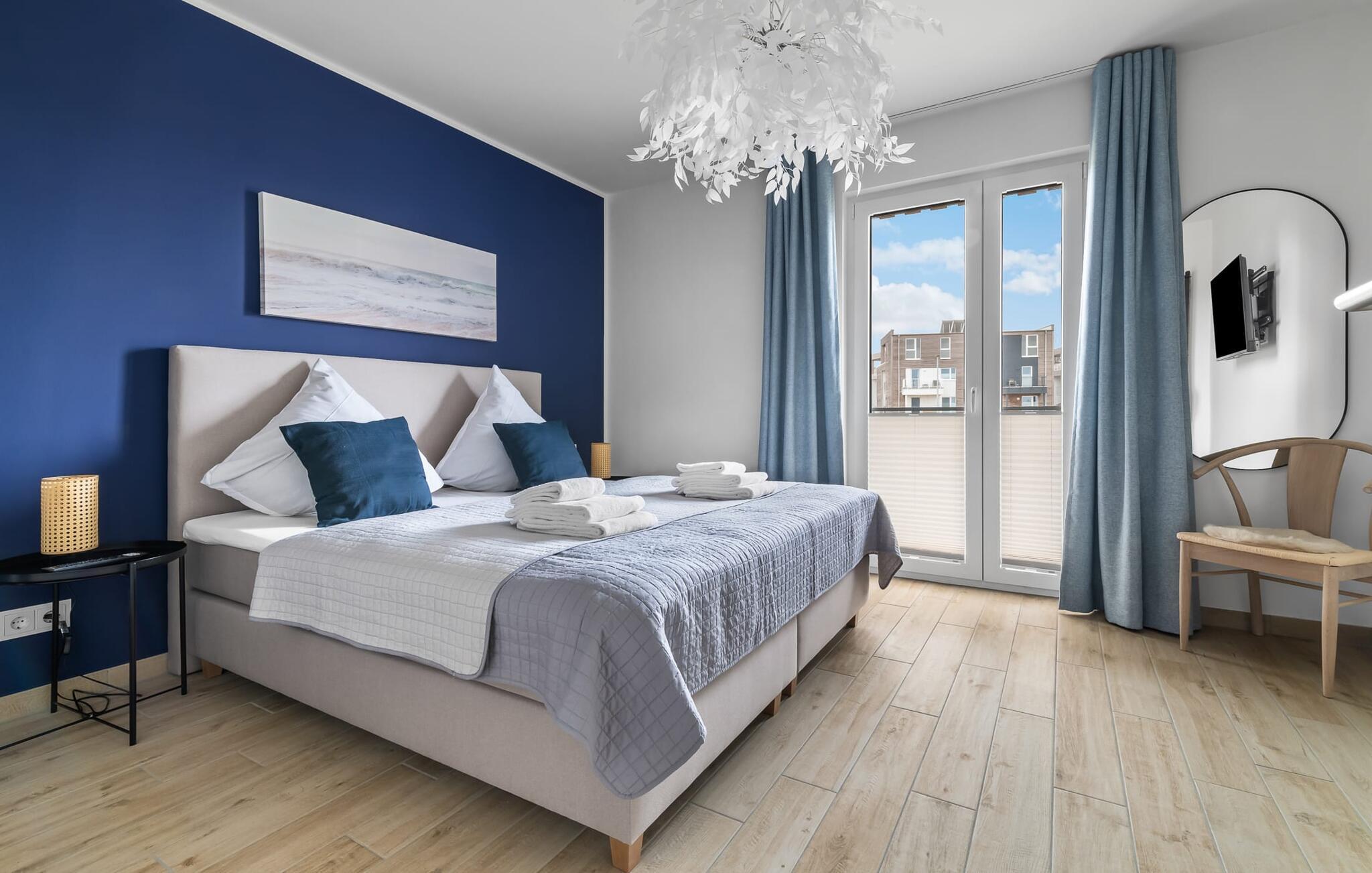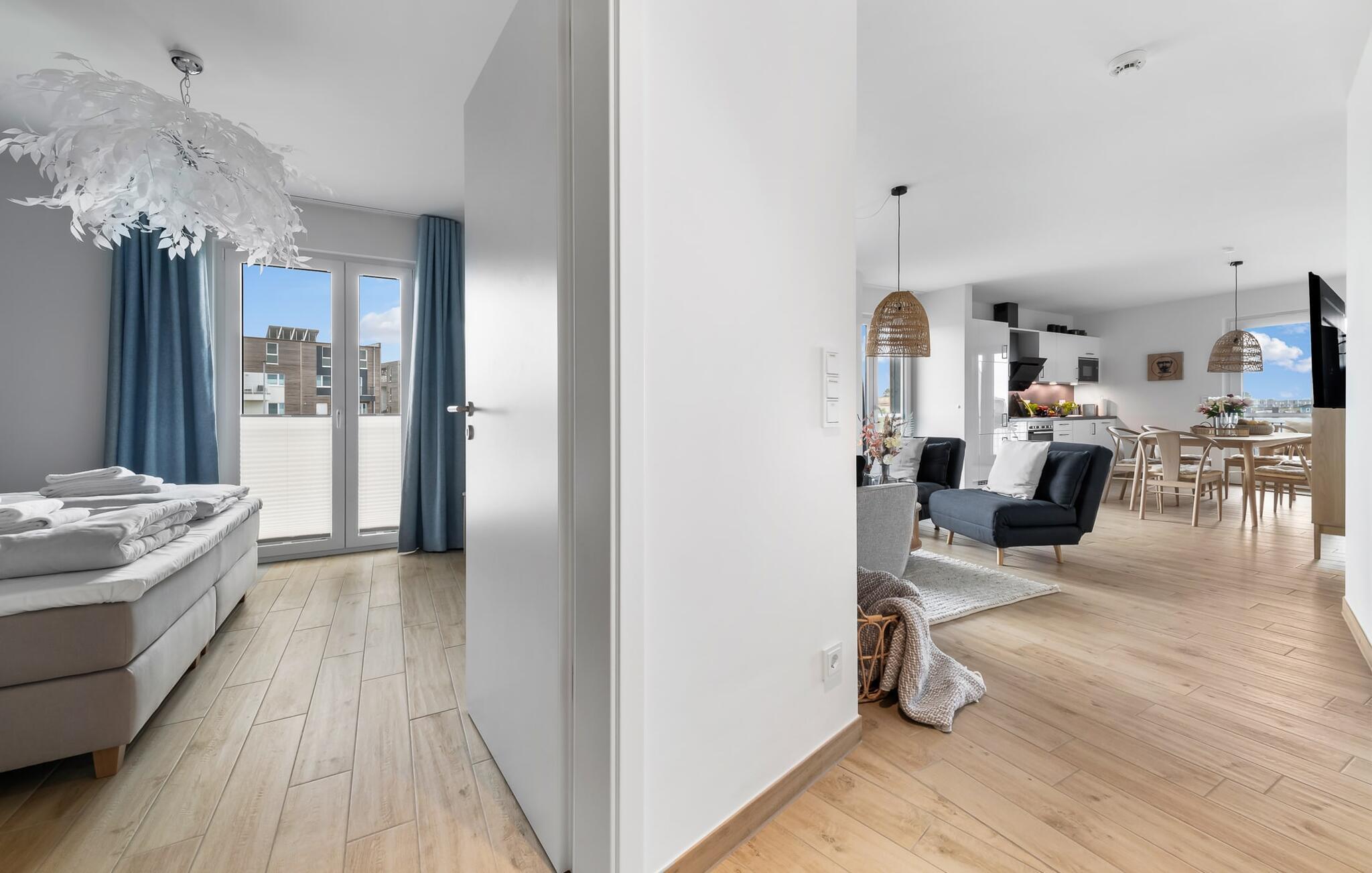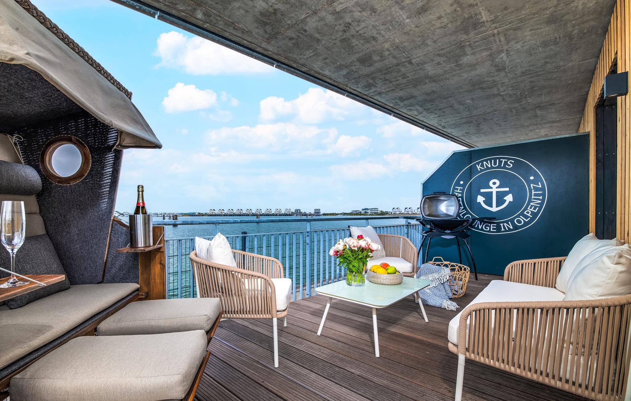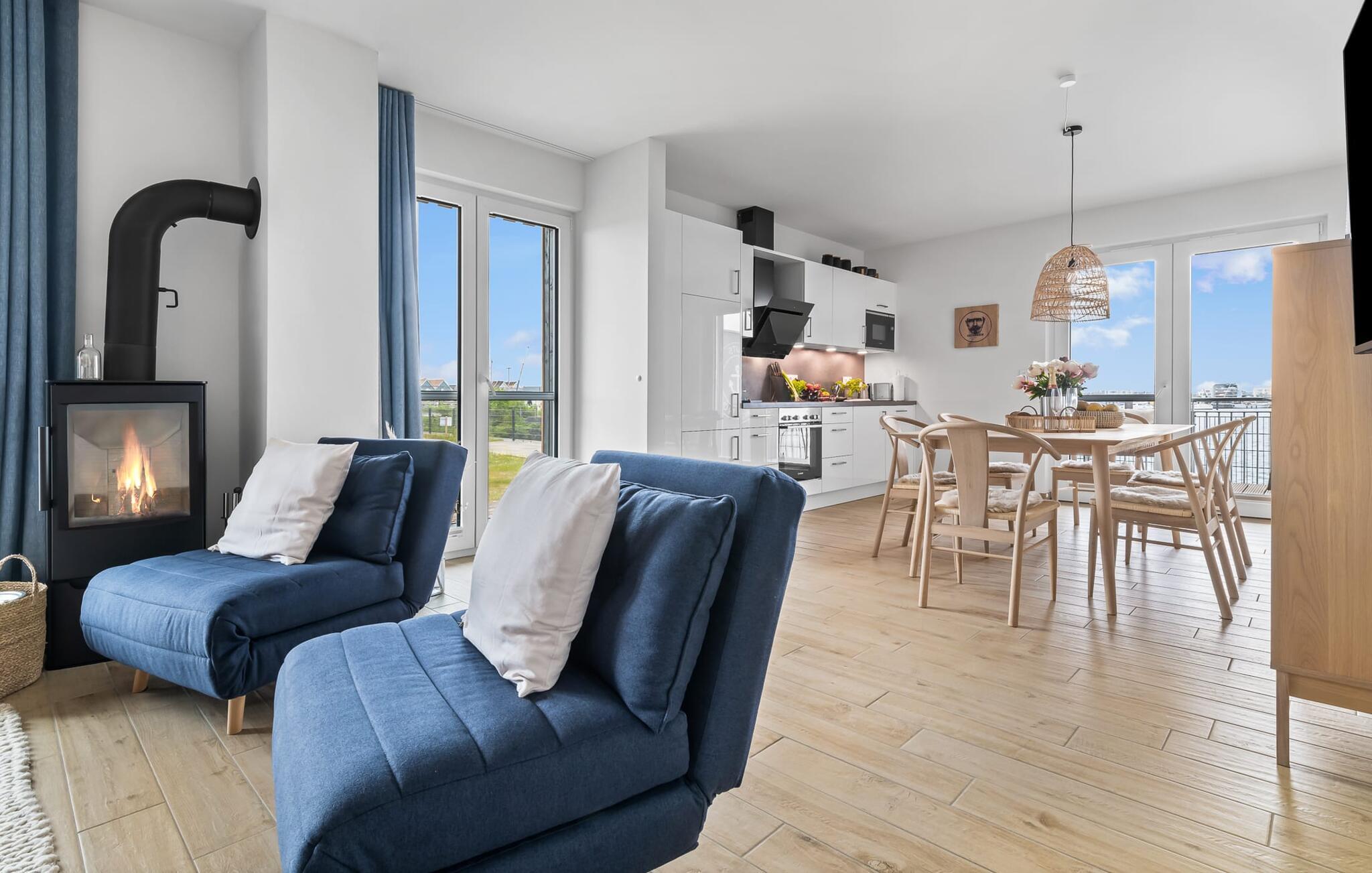 Der offene Wohn-/Essbereich mit integrierter Küche gestaltet sich aufgrund der bodentiefen Fensterfront lichtdurchflutet und sorgt mit jedem Sonnenuntergang für ein spannendes Naturspektakel direkt aus dem Wohnzimmer. Von hier hat der Gast Zugang zur großen Terrasse. Der Blick auf Hafen, Wasser und Boote vermittelt das Gefühl, für eine Weile Kapitän auf großer Fahrt zu sein. Die Terrasse erstreckt sich in verjüngender Form um die gesamte Wohnung und verstärkt das Gefühl an Deck zu sein. Stylische Outdoormöbel stehen bereit, um in dieser einmaligen Atmosphäre genussvoll zu dinieren oder einfach nur zu entspannen.
