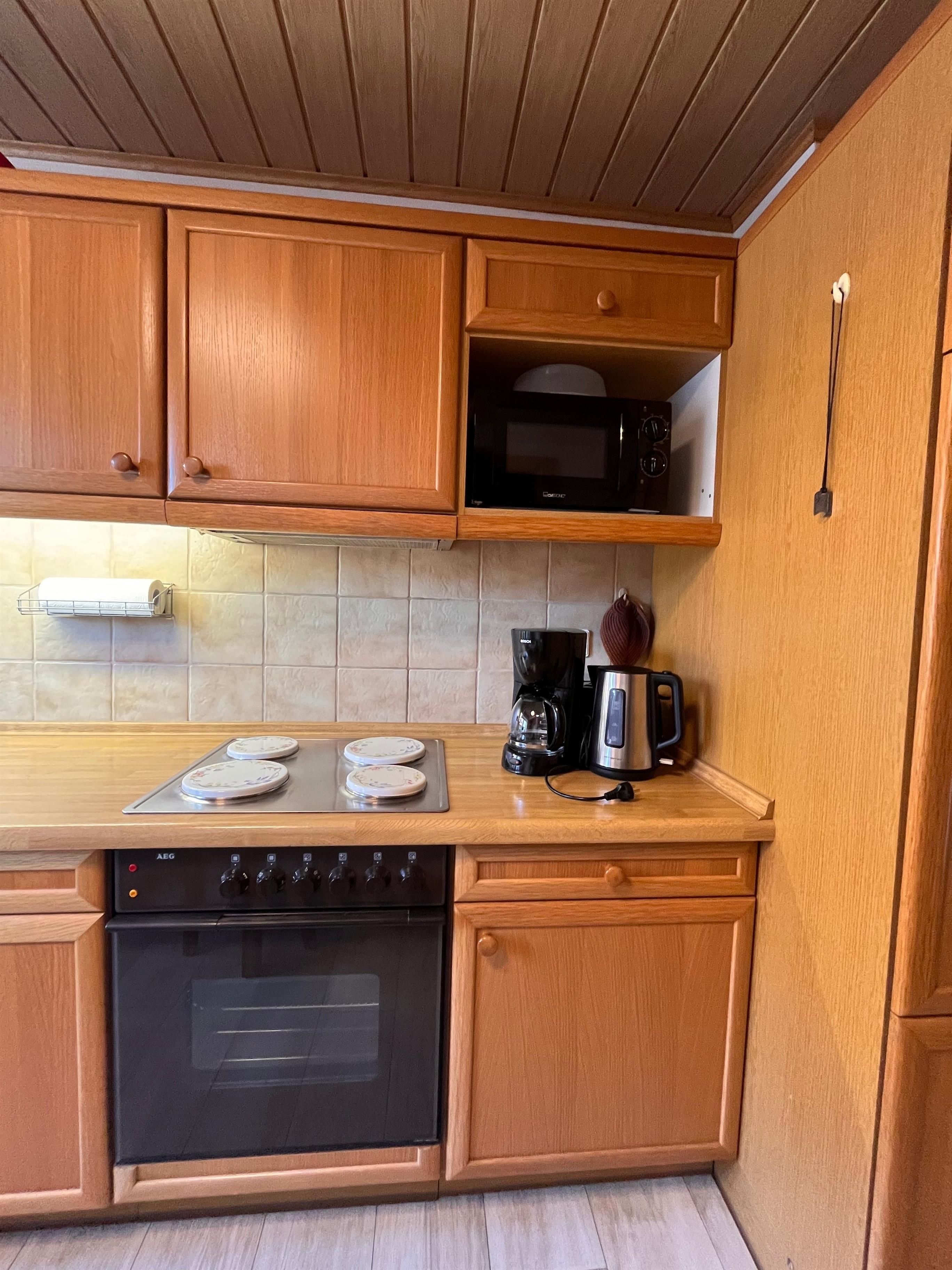 Zur Wohnung gehören auch das zweckmäßige Duschbad, sowie eine voll ausgestattete Einbauküche mit bequemer Kücheneckbank.