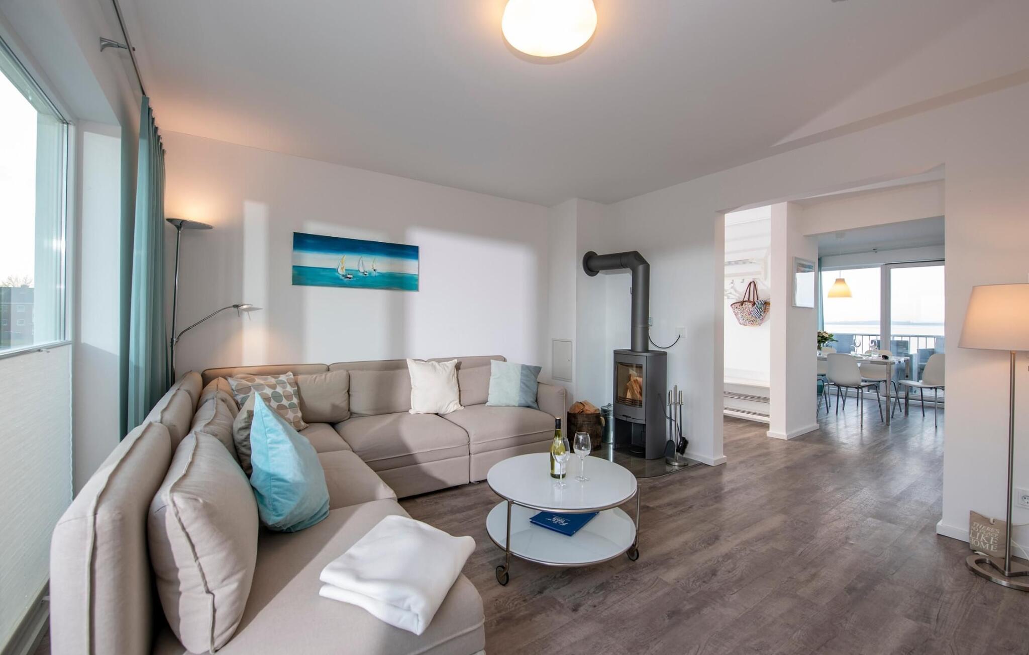 Kuschelig wird es im Wohnzimmer, denn hier lädt eine gemütliche Sitzlandschaft auch an nordischen Schietwettertagen zu einem gemütlichen Kaminabend ein. Für Indoor Entertainment sorgt außerdem der Smart TV mit DVD Player sowie diverse Gesellschaftsspiele und Bücher.