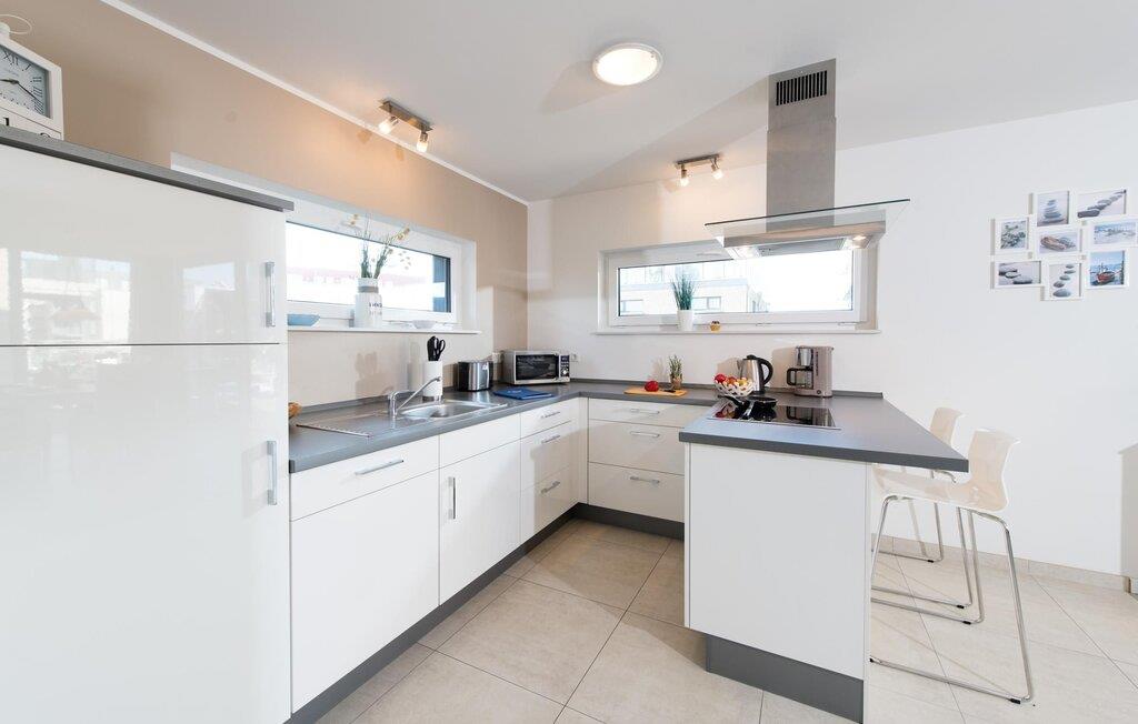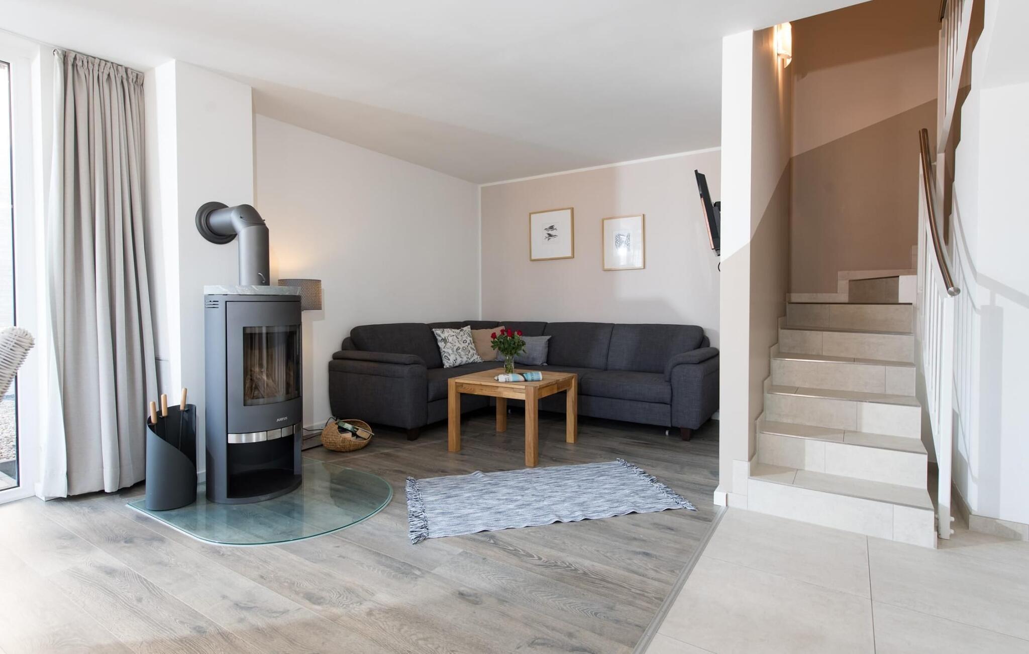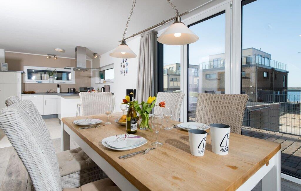 Im Erdgeschoss des Ferienhauses befindet sich der lichtdurchflutete und großzügig gestaltete Wohn- und Essbereich des Ferienhauses. Während die offene Küche mit geselligem Tresen an hochwertiger Ausstattung keine Wünsche offen lässt, lassen sich am Esstisch für sechs Personen Urlaubsmahlzeiten genießen. Von hier aus fällt der Blick über große Fensterfronten auf die anliegende Terrasse, die Richtung Marina des OstseeResort Olpenitz ausgerichtet ist und mit Südausrichtung traumhafte Sonnenstunden verspricht. Ob Grillabend oder romantisches Candle-Light-Dinner, unvergessliche Urlaubsmomente sind hier garantiert. Die komfortable Sitzlandschaft des Wohnbereichs vorm Kaminofen lädt zum Verweilen ein.