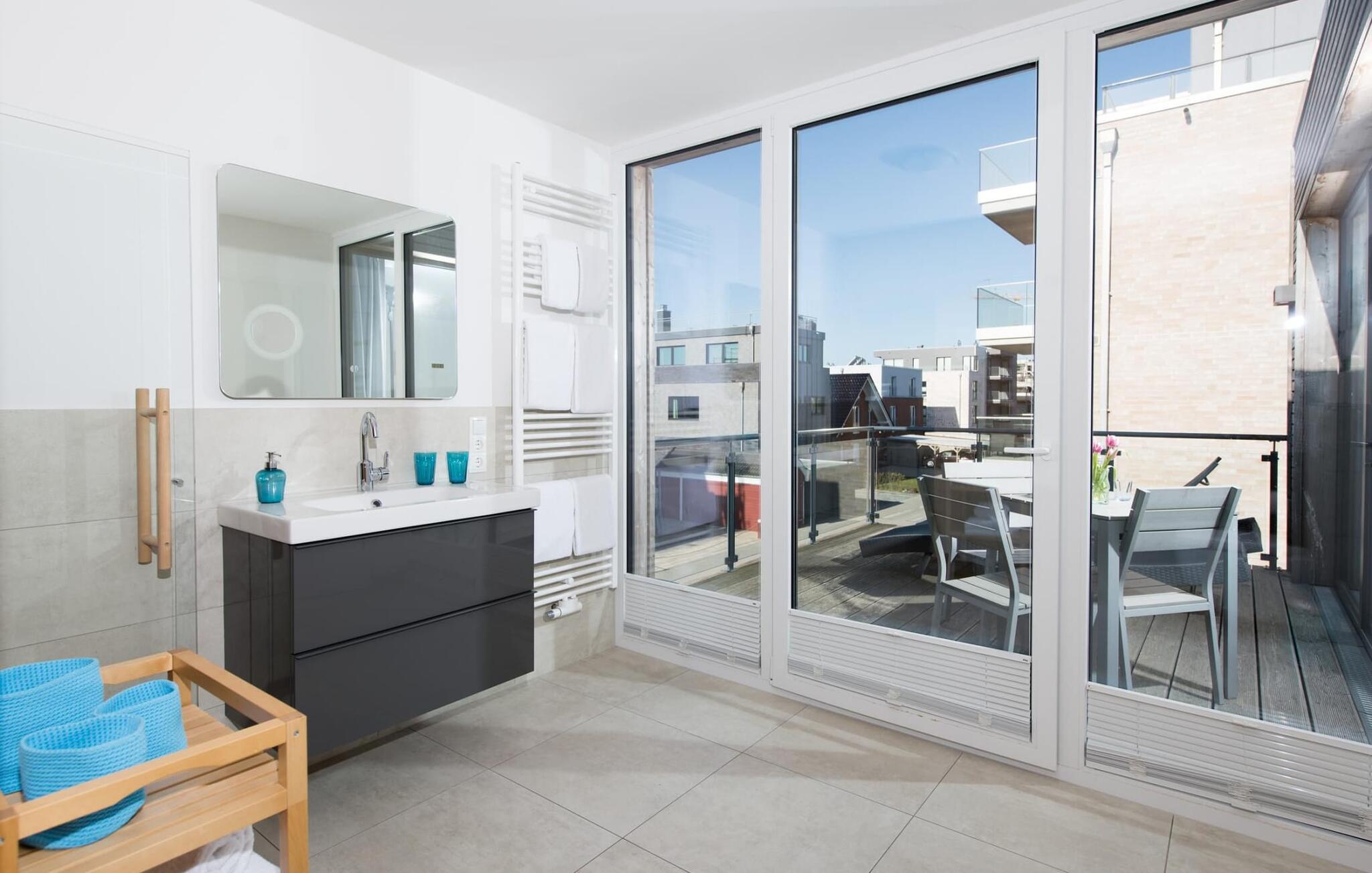 Eine zweite Sonnenterrasse verbindet Hauptschlafzimmer und Badezimmer. Sonnenliegen laden hier zum Entspannen nach dem Saunagang ein.