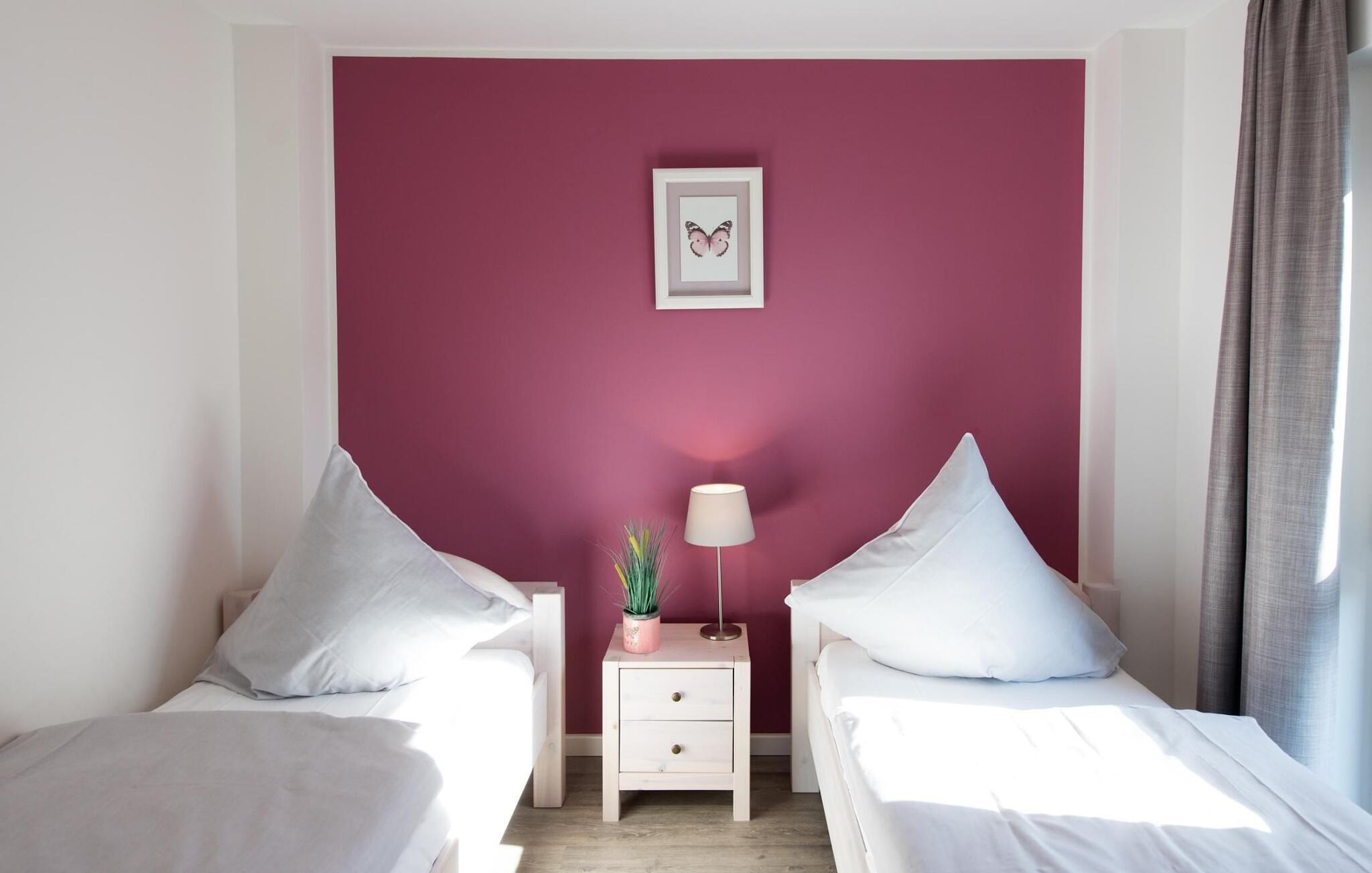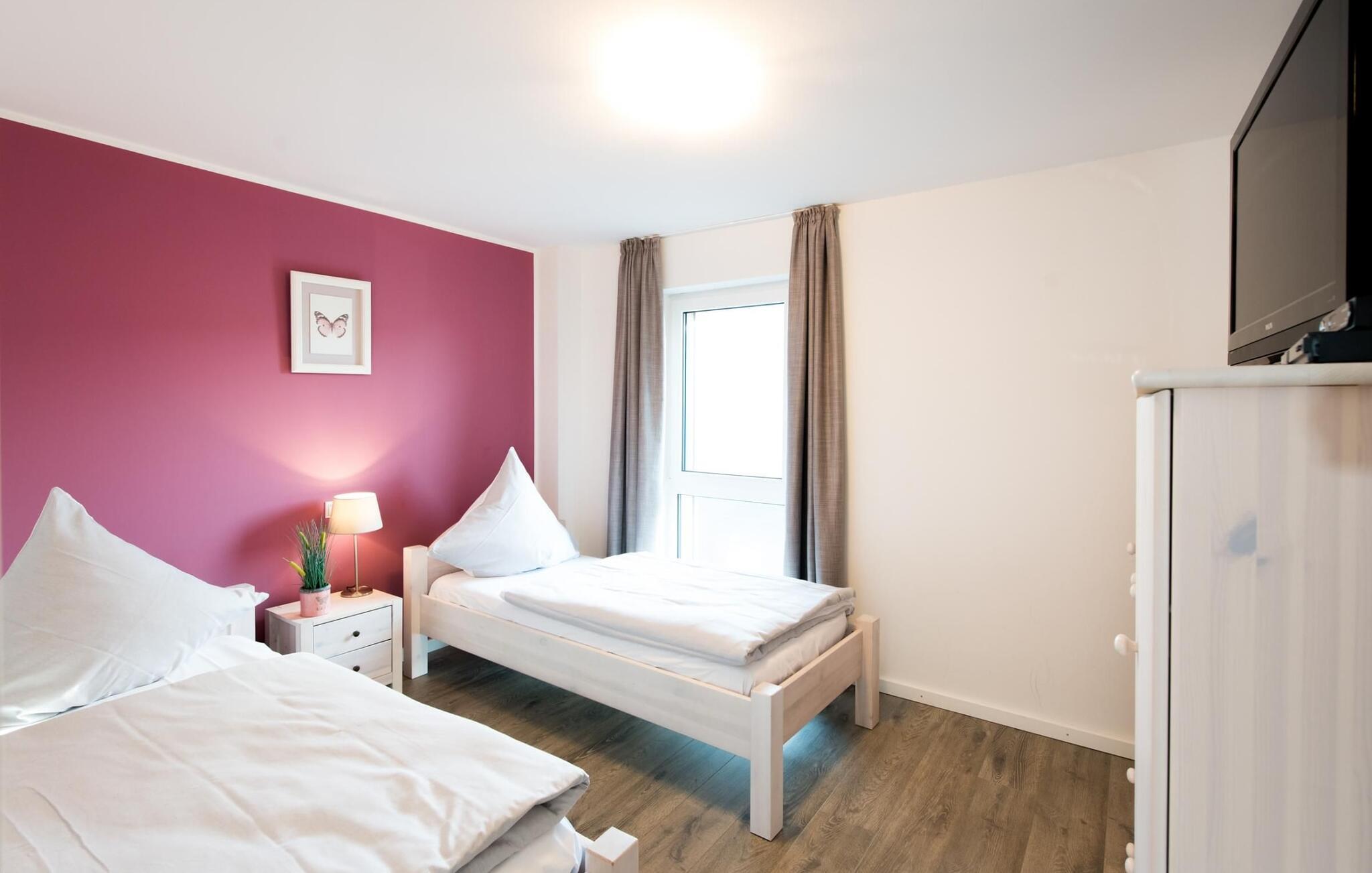 Im ersten Obergeschoss des Ferienhauses befinden sich zwei Schlafzimmer für je zwei Personen. Das Hauptschlafzimmer ist mit einem Doppelbett ausgestattet. Das zweite Schlafzimmer verfügt über zwei flexibel zusammenschiebbare Einzelbetten und verfügt über einen zusätzlichen Flatscreen-TV.