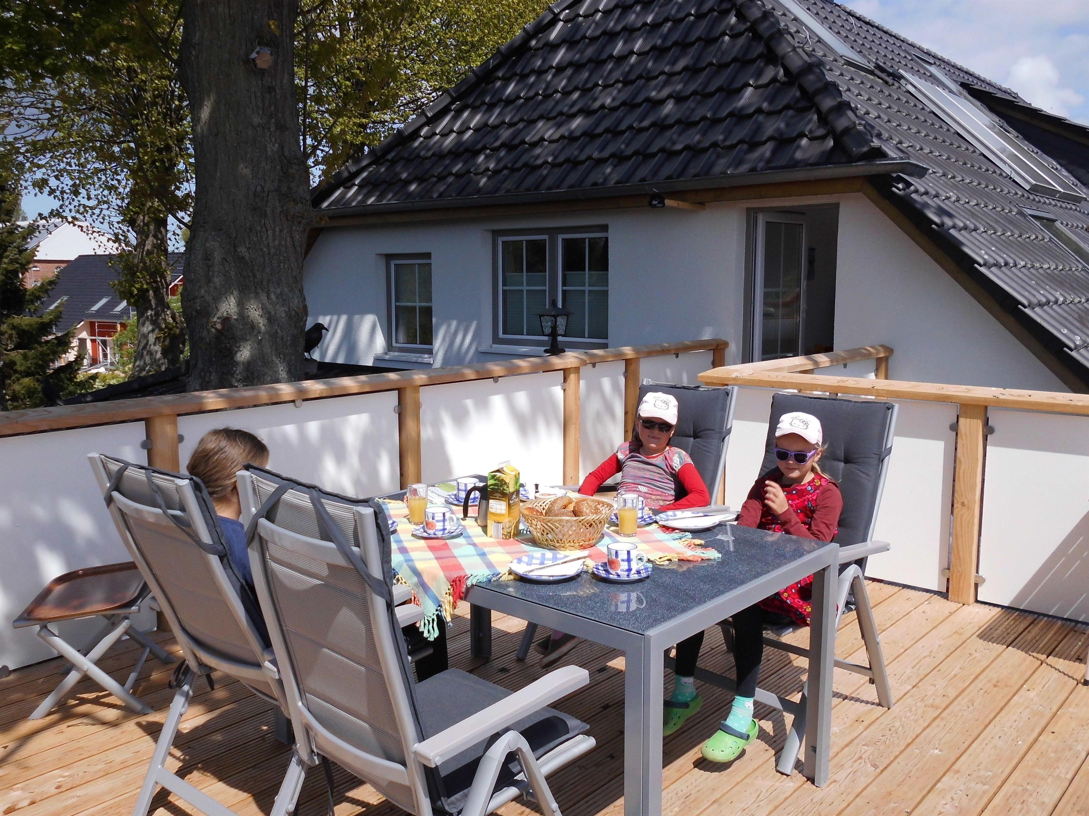 Eine große Dachterrasse mit Sitzgelegenheiten und einem herrlichen Ausblick über Fehmarn und auf den Dorfteich, lädt zum Verweilen ein.