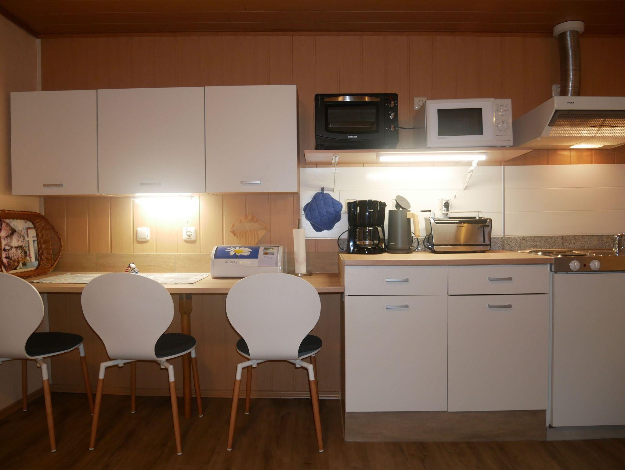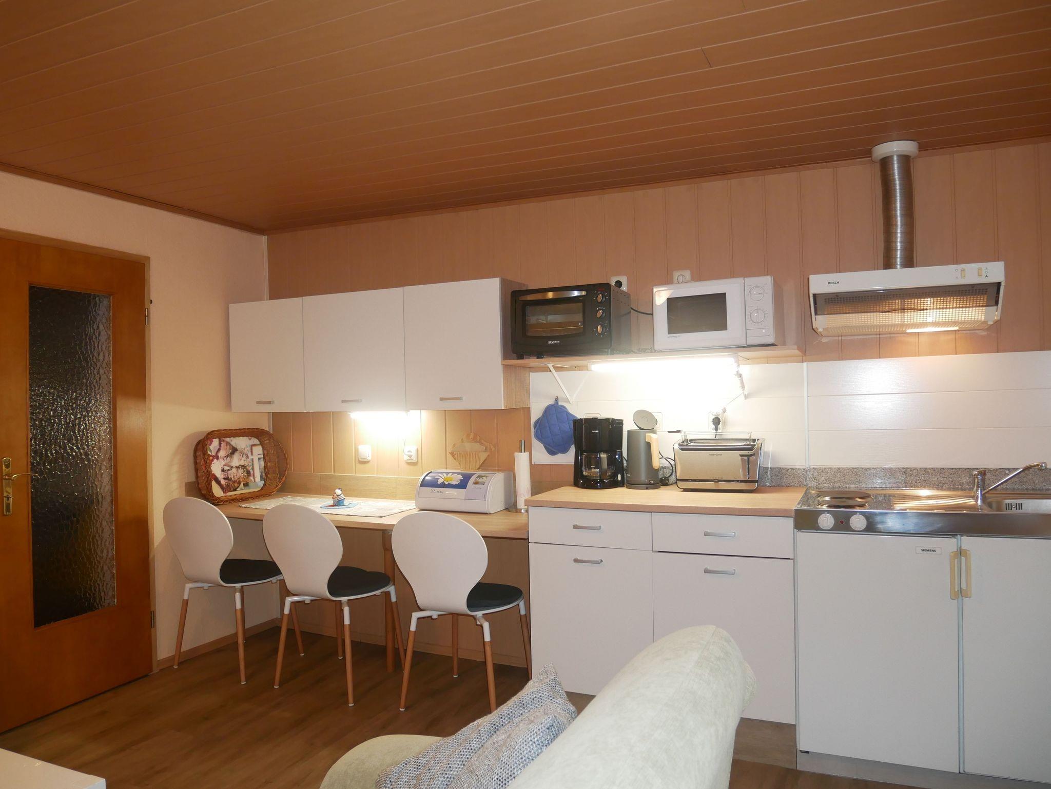 Die Ferienwohnung 1 ist ca. 40m² groß und verfügt über ein Wohnzimmer mit einem Sofa, Flat-TV und Radio. Die offene Küche ist ausgestattet mit einem Mini-Backofen, 2-Platten-Herd, Kühlschrank mit Gefrierfach, Kaffeemaschine, Toaster und Wasserkocher. Das große Schlafzimmer verfügt über ein Doppelbett und über einen Kleiderschrank. Im kleineren Schlafzimmer befindet sich ein Einzelbett. Das Badezimmer ist mit einer ebenerdigen Dusche ausgestattet. Vor der Wohnung befindet sich eine möblierte Terrasse. Zusätzlich finden Sie auf dem Grundstück eine überdachte Laube, die zum Grillen oder gemütlichen Beisammensein geeignet ist.