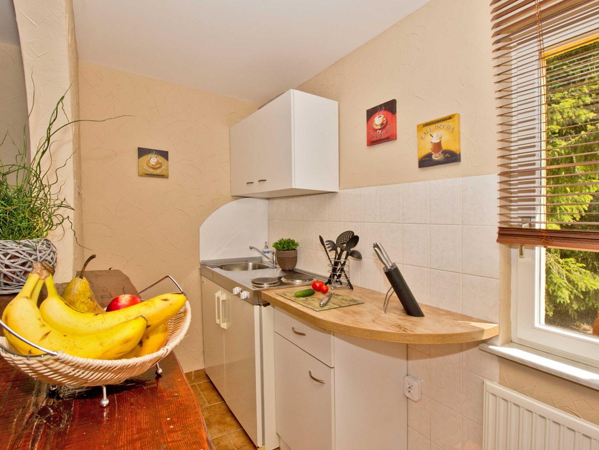 Die Ferienwohnung mit Blick auf den Hof, Garten und Golfplatz verfügt über 1 großes stilvoll und modern eingerichtetes kombiniertes Wohn- und Schlafzimmer, ausgestattet mit einem breiten Doppelbett (Breite 160 cm), Kleiderschrank, Kommode, einer gemütlichen Schlafcouch (Breite Schlaffunktion 140 cm), sowie einem LED Fernseher mit Radiofunktion. Ein eigenes Bad mit Dusche und WC ist in der Wohnung integriert. Genießen Sie Ihr Frühstück auf Ihrer eigenen Natursteinterrasse. Klein, geräumig und gut ausgestattet- die offene Küche mit einem Hochtisch zum Essen und Trinken verfügt über eine Kochstelle mit 2 Herdplatten, Spüle, Kühlschrank, Toaster, Kaffeeautomat, Wasserkocher, sowie Geschirr und Kochuntensilien.