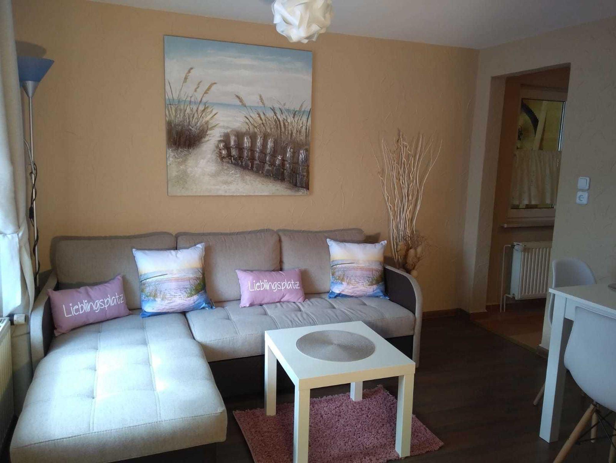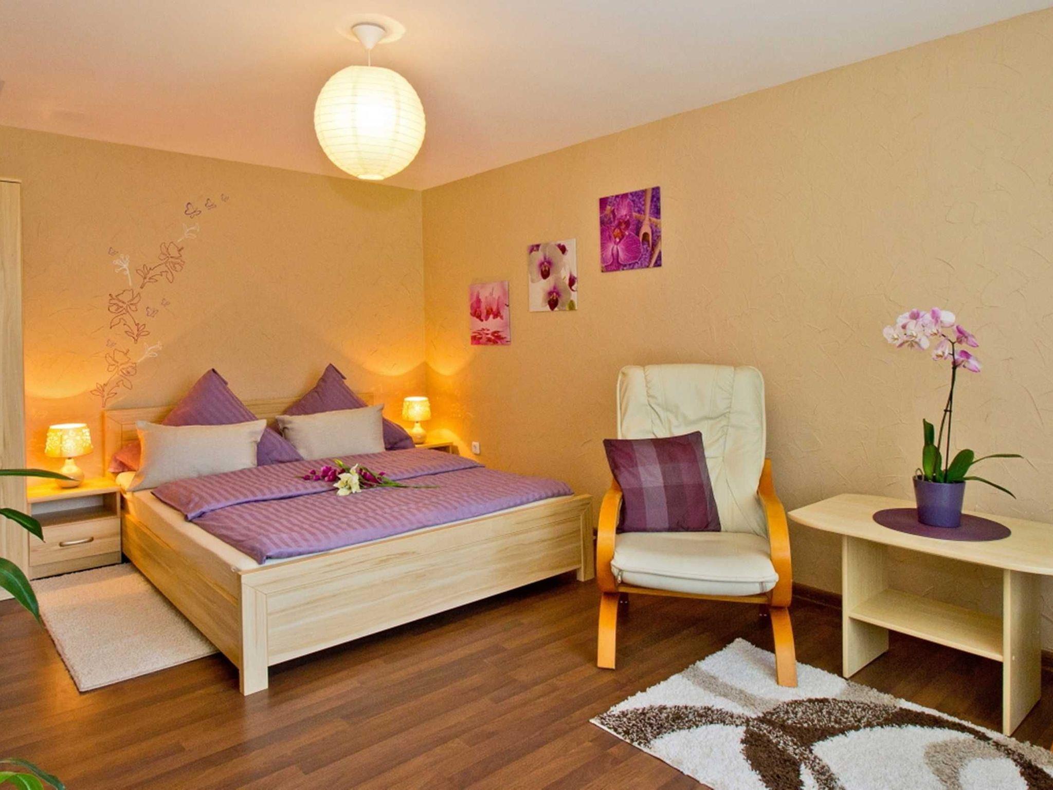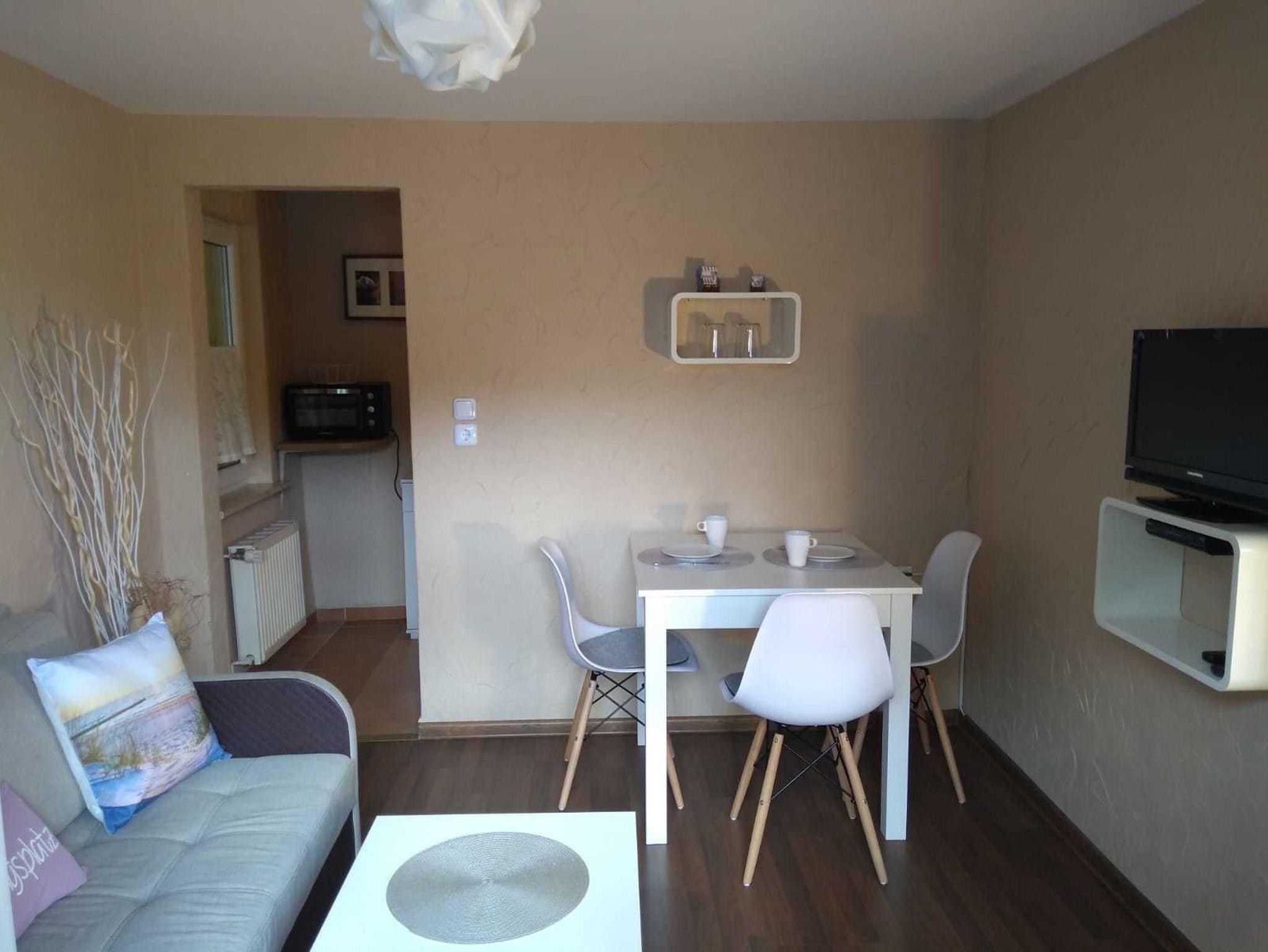 Die Ferienwohnung mit Blick auf den Hof und Garten verfügt über 2 stilvoll und modern eingerichtete Zimmer (Wohn- und Schlafzimmer), sowie ein Bad mit Dusche/WC und eine eigene Küche. Das Schlafzimmer ist mit hellen Holzmöbeln eingerichtet und verfügt über ein breites Doppelbett (Breite 160 cm), eine gemütliche Sitzecke, Kleiderschrank und Kommode. Das Wohnzimmer ist ausgestattet mit einer ausklappbaren Schlafcouch (Breite Schlaffunktion 140 cm) und einem LED Fernseher inkl. Radiofunktion. Klein, geräumig und gut ausgestattet- die Küche inkl. Sitzecke verfügt über eine Kochstelle mit 2 Herdplatten, Spüle, Kühlschrank, Toaster, Kaffeeautomat, Wasserkocher, Mikrowelle, sowie Geschirr und Kochuntensilien.