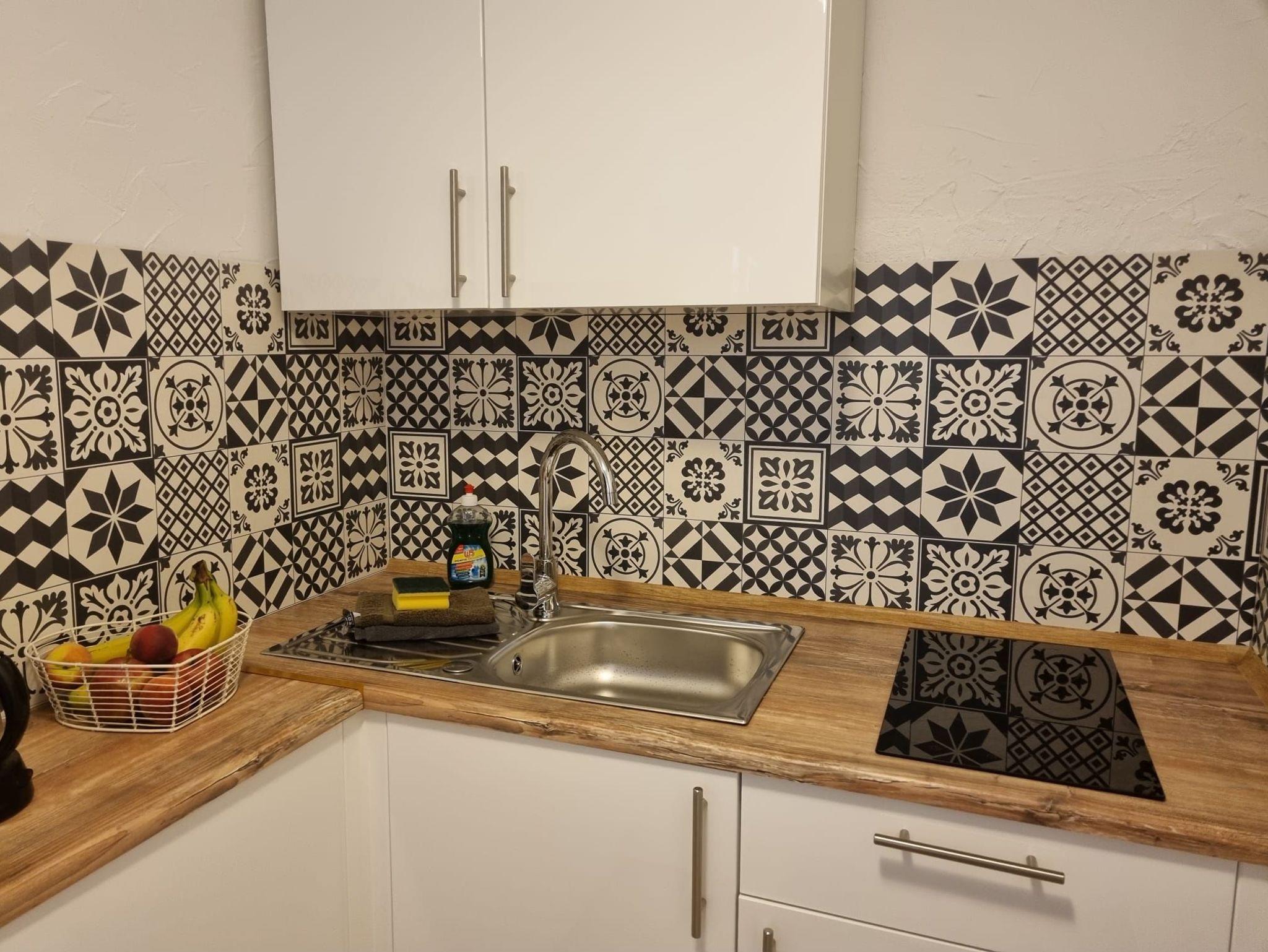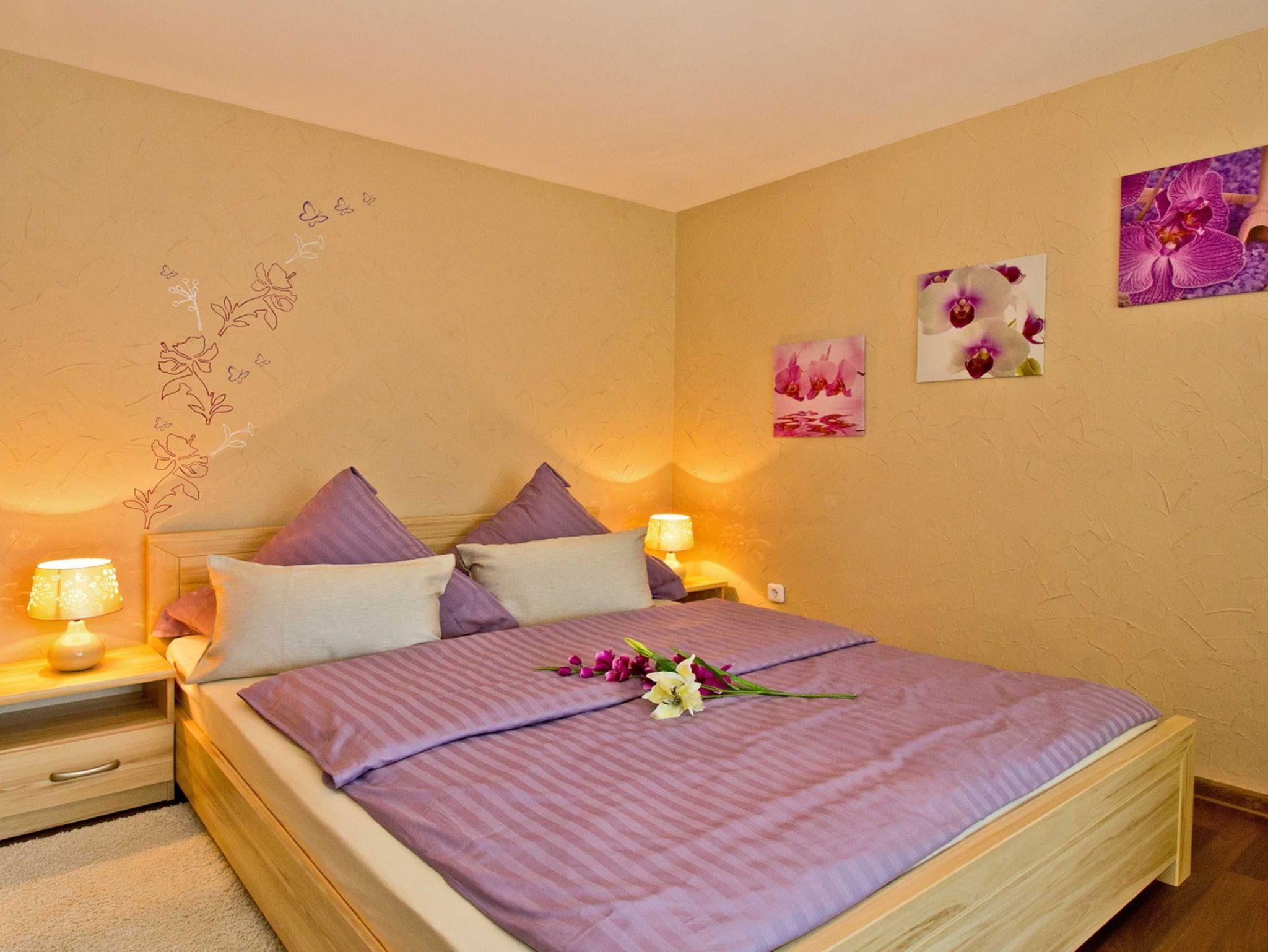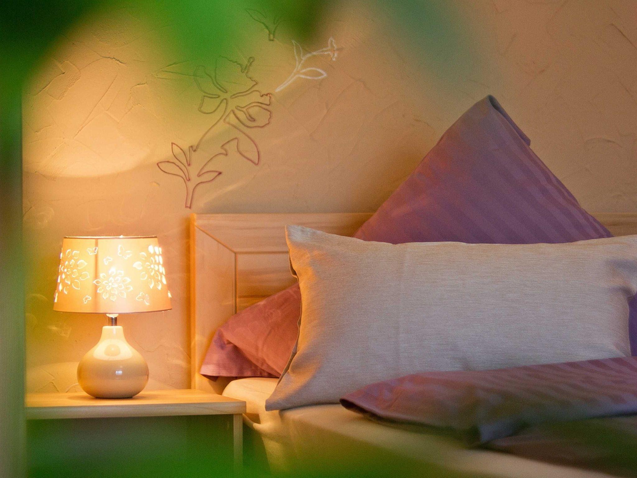 Die Ferienwohnung mit Blick auf den Hof und Garten verfügt über 2 stilvoll und modern eingerichtete Zimmer (Wohn- und Schlafzimmer), sowie ein Bad mit Dusche/WC und eine eigene Küche. Das Schlafzimmer ist mit hellen Holzmöbeln eingerichtet und verfügt über ein breites Doppelbett (Breite 160 cm), eine gemütliche Sitzecke, Kleiderschrank und Kommode. Das Wohnzimmer ist ausgestattet mit einer ausklappbaren Schlafcouch (Breite Schlaffunktion 140 cm) und einem LED Fernseher inkl. Radiofunktion. Klein, geräumig und gut ausgestattet- die Küche inkl. Sitzecke verfügt über eine Kochstelle mit 2 Herdplatten, Spüle, Kühlschrank, Toaster, Kaffeeautomat, Wasserkocher, Mikrowelle, sowie Geschirr und Kochuntensilien.