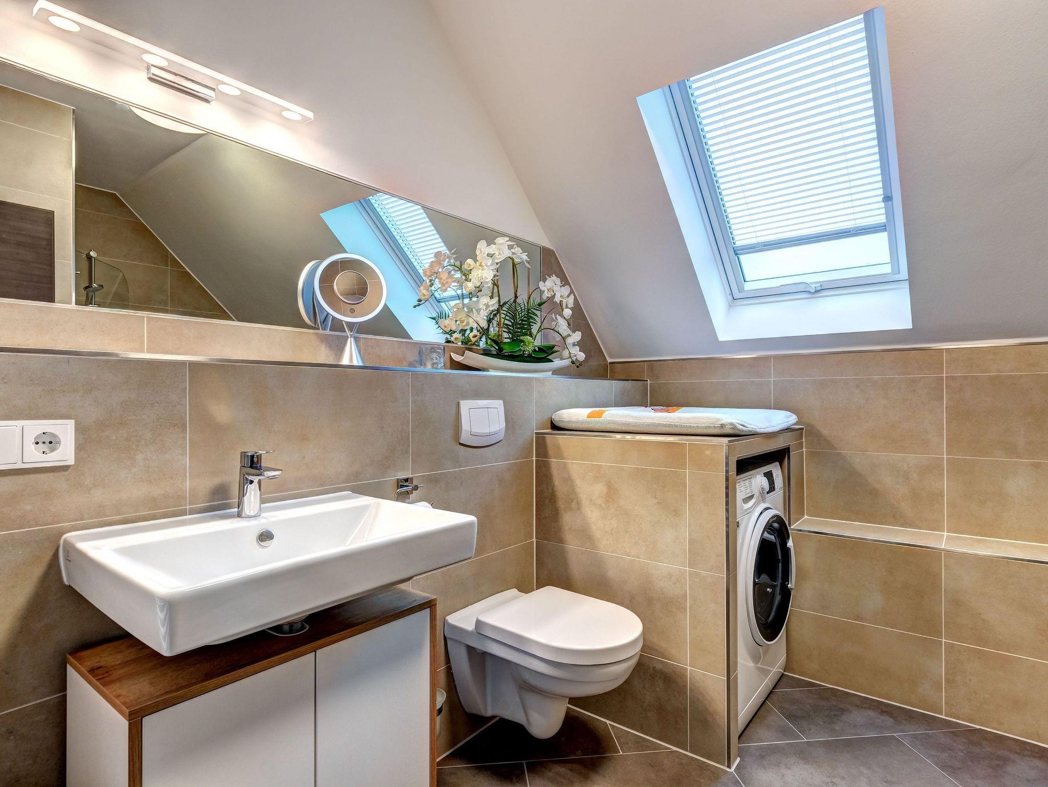 Im Obergeschoss befindet sich eines der beiden Badezimmer. Dieses ist mit einem Waschtisch, Spiegel, WC, Badewanne mit Duschmöglichkeit, Wickelauflage und einem Kombigerät Waschtrockner ausgestattet. Das Badezimmer im Erdgeschoss verfügt über einen Waschtisch, Spiegel, WC, einer bodenebenen Dusche, Erlebnis- Sauna mit Glasfront und LED-Beleuchtung.