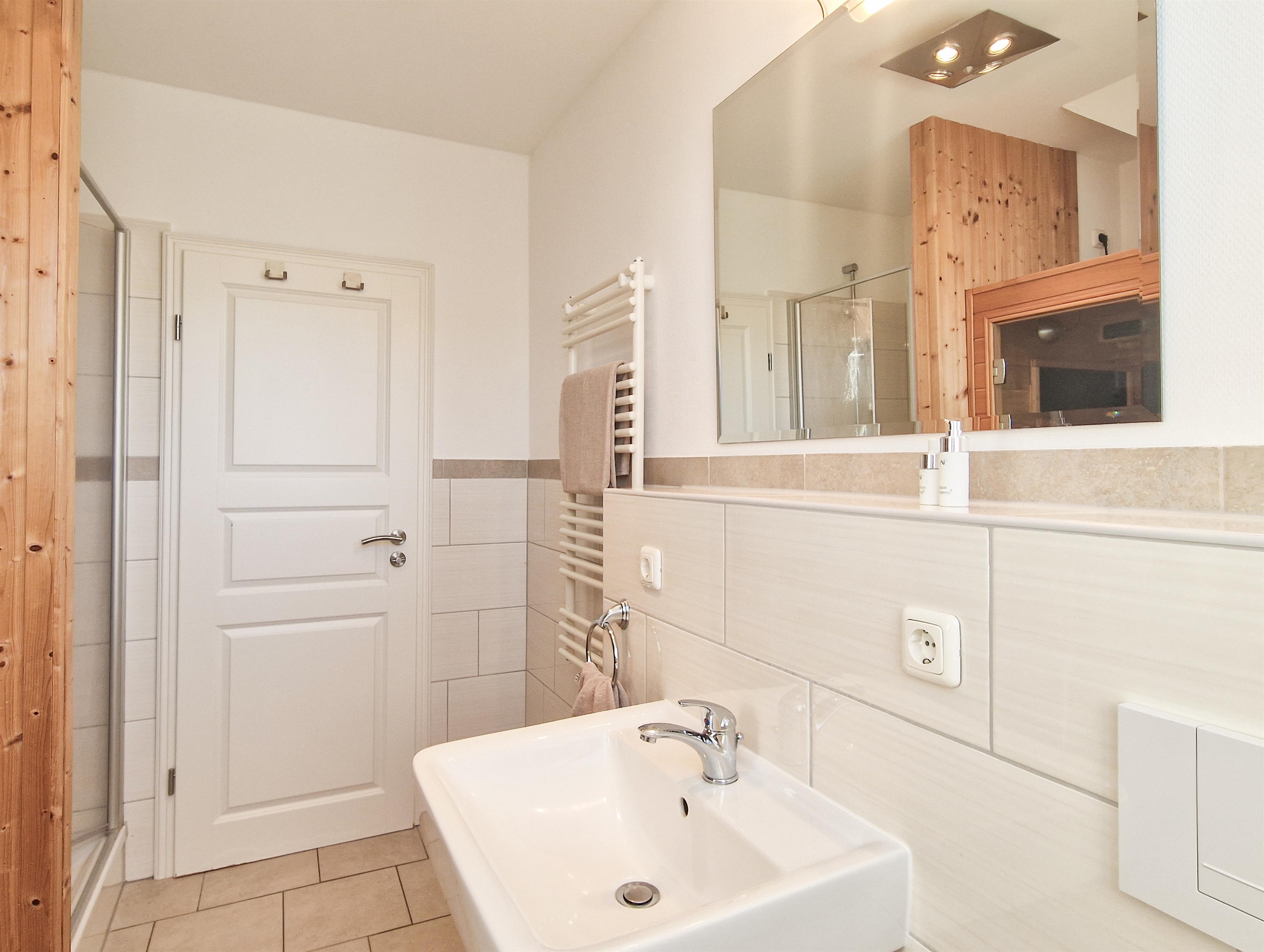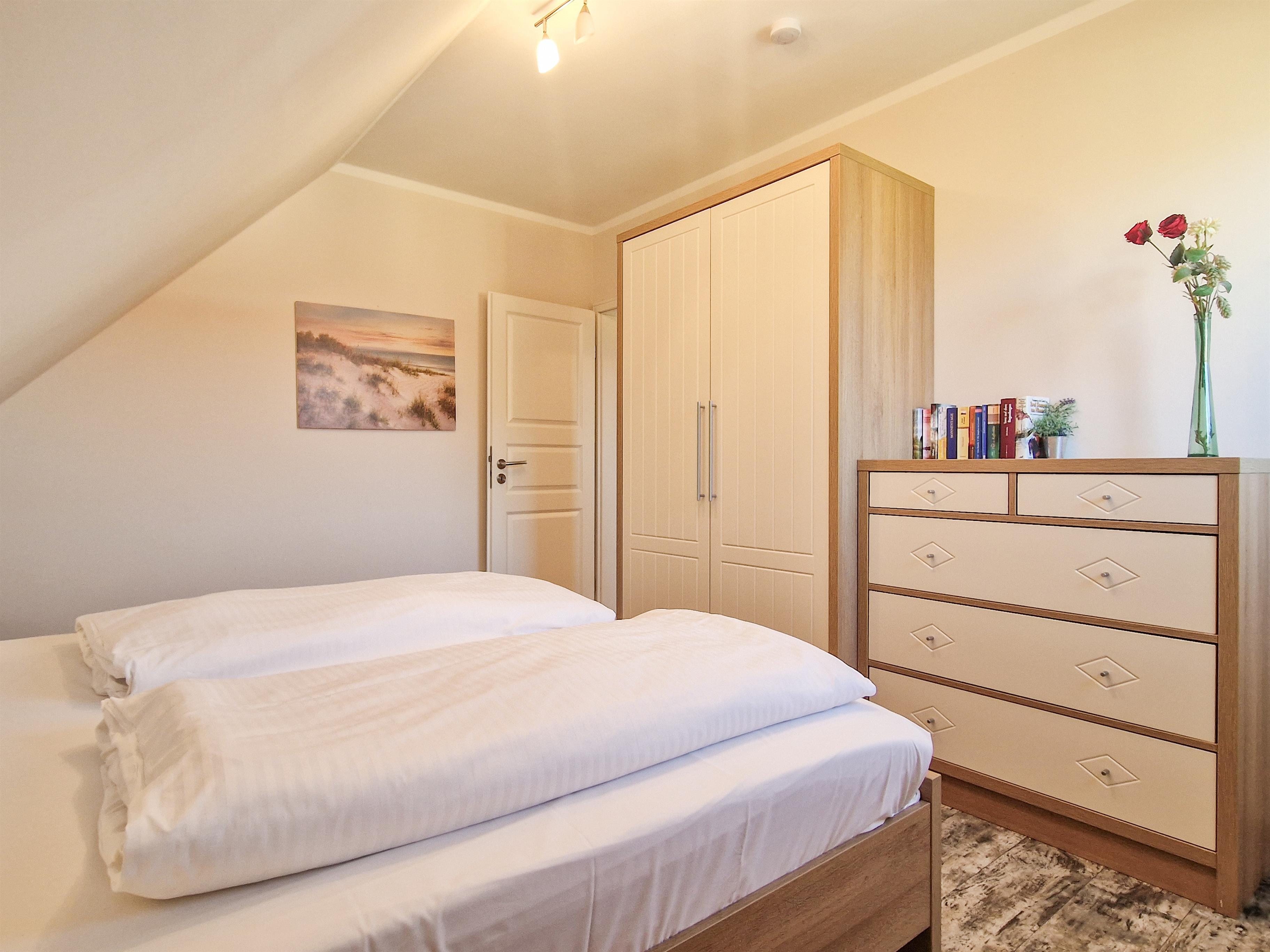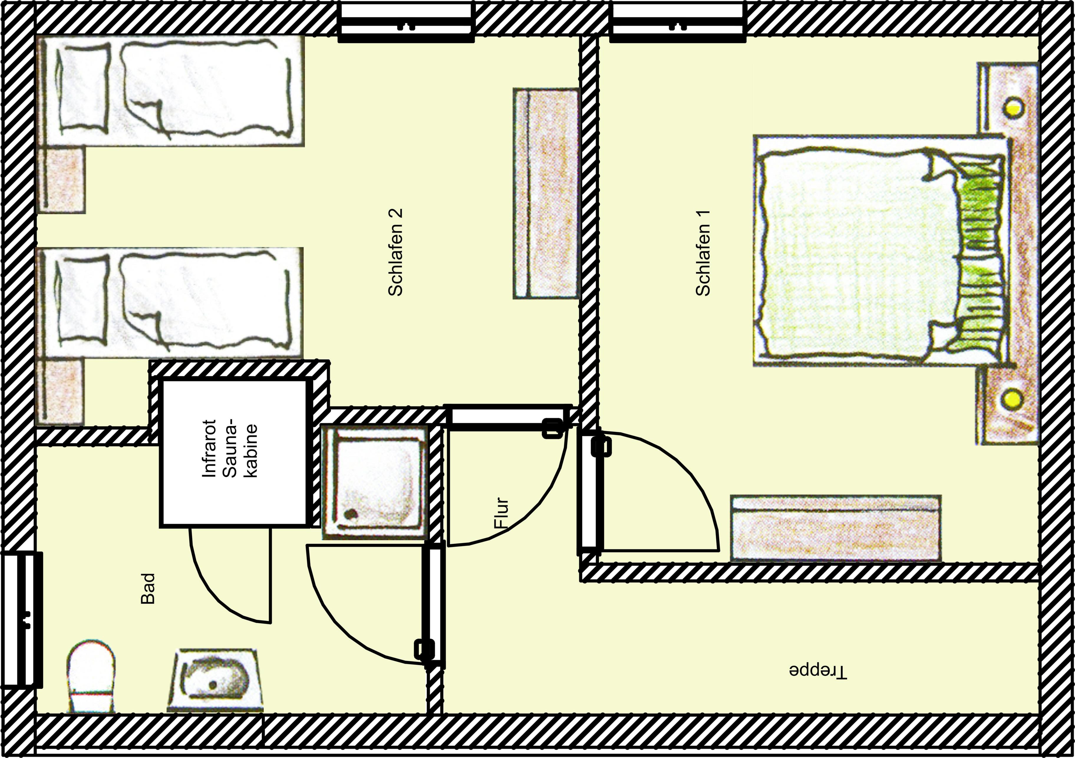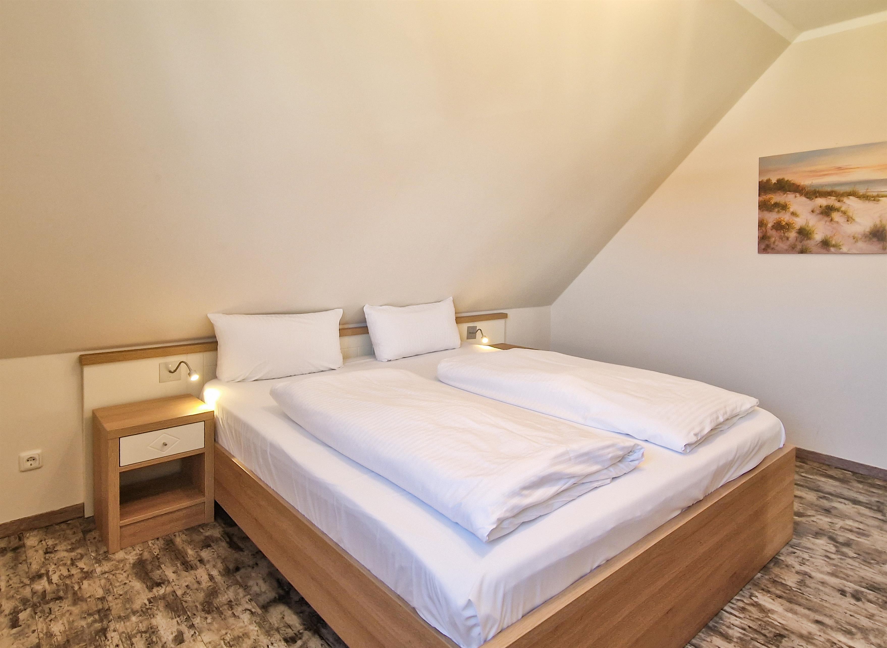Diese Ferienhaushälfte bietet mit 72 qm Platz für max. 6 Personen. Der helle Wohnraum ist mit einer gemütlichen Couchecke mit Schlaffunktion (Liegefläche 125x190) und Flat TV eingerichtet. Für wohlige Wärme an kühleren Tagen sorgt ein Kaminofen. Der Essplatz ist zusammen mit der Vollküche inkl. Geschirrspüler, Backofen, Mikrowelle, Kühlschrank inkl. Gefrierfach etc. ebenfalls im Wohnraum integriert. Sie sonnige Terrasse zum Süden ist vom Wohnraum begehbar und lädt zum Verweilen ein. Das Badezimmer im Erdgeschoss ist mit Dusche und Waschbecken/WC ausgestattet. Außerdem steht Ihnen hier eine Waschmaschine zur kostenfreien Nutzung zur Verfügung. Die beiden Schlafzimmer im Obergeschoss sind mit einem Doppelbett mit getrennten Matratzen bzw. zwei Einzelbetten (jeweils 90 x 200) und ausreichend Schrankraum eingerichtet. Das Badezimmer im Obergeschoss verwöhnt die Gäste mit einer Infrarotwärmekabine, auch hier stehen Dusche und Waschbecken/WC zur Verfügung. Ein Pkw-Stellplatz befindet sich auf dem Grundstück.