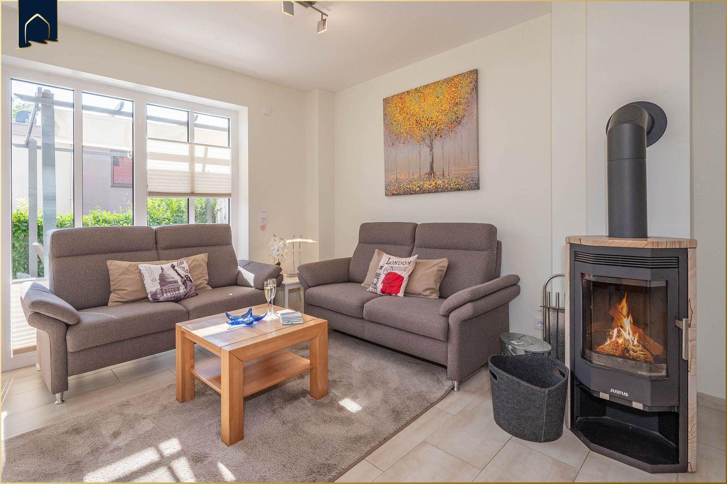 Die drei komfortablen Schlafzimmer sorgen mit hochwertigen Bodenbelägen und Sichtschutz an allen Fenstern für erholsamen Schlaf. Zwei moderne Badezimmer mit Dusche, WC und Fußbodenheizung bieten Komfort auf allen Ebenen. Für entspannte Abende stehen ein gemütlicher Wohnbereich mit Kaminofen, bequemer Sofaecke, TV-Anlage und Musikequipment (HiFi, Radio, CD- und Blu-ray-Player) bereit. Brettspiele, Bücher und DVDs machen auch Regentage unterhaltsam.