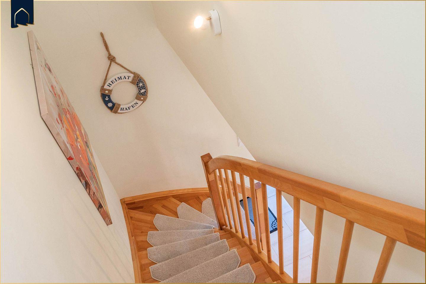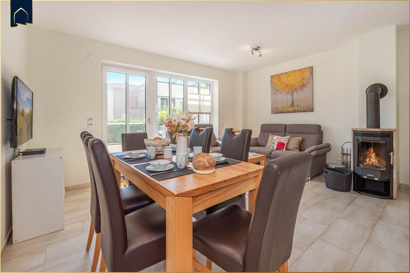 Die voll ausgestattete Küche mit Backofen, Herd, Kühlschrank, Gefrierfach, Mikrowelle, Spülmaschine, Kaffeemaschine, Toaster und Wasserkocher lässt keine Wünsche offen – ob Familienfrühstück oder festliches Abendessen. Ein Esstisch im hellen Essbereich bietet genug Platz für gemeinsame Mahlzeiten. Praktisch: Ein separater Fahrradabstellraum, Staubsauger, Wäscheständer und Steckdosensicherungen machen den Aufenthalt besonders familienfreundlich.