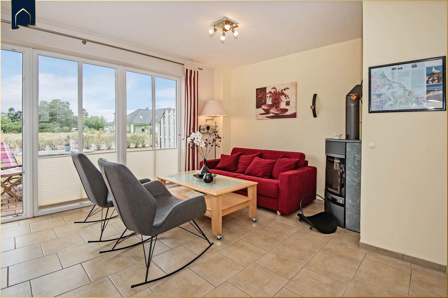 Im Inneren erwarten dich zwei gemütliche Schlafzimmer, ein offener Wohn- und Essbereich mit Kaminofen, Sofa und Essplatz sowie eine voll ausgestattete Küche mit Backofen, Mikrowelle, Kühlschrank, Gefrierfach und Kaffeemaschine (inkl. Espressomaschine). Für Unterhaltung sorgen drei Fernseher, ein Radio, CD-Spieler, Bücher und Spiele – ideal für entspannte Abende. Zwei Badezimmer – eines mit Dusche, das andere mit Badewanne – bieten Komfort für Familien oder zwei Paare. Eine Fußbodenheizung sorgt auch in der kühleren Jahreszeit für wohlige Wärme.