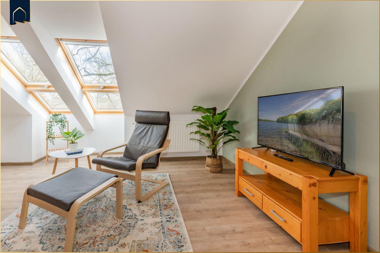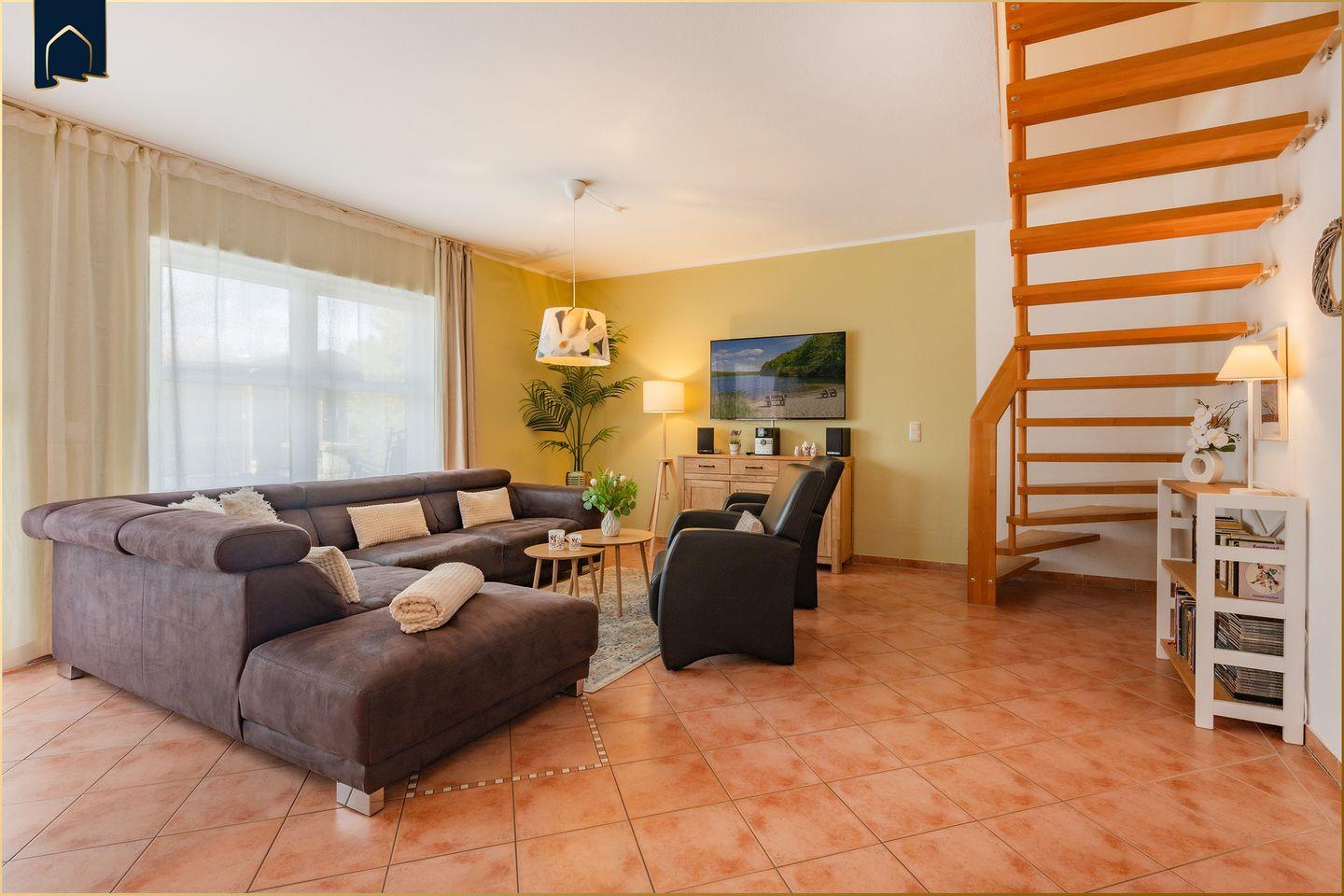 Der geschmackvoll eingerichtete Wohnbereich mit gemütlicher Sofaecke, TV und WLAN bildet das Herzstück des Hauses. Hier genießen Sie entspannte Abende oder nutzen den Arbeitsplatz für eine produktive Workation mit Blick ins Grüne. Der Essbereich mit großem Esstisch lädt zu gemeinsamen Mahlzeiten ein.