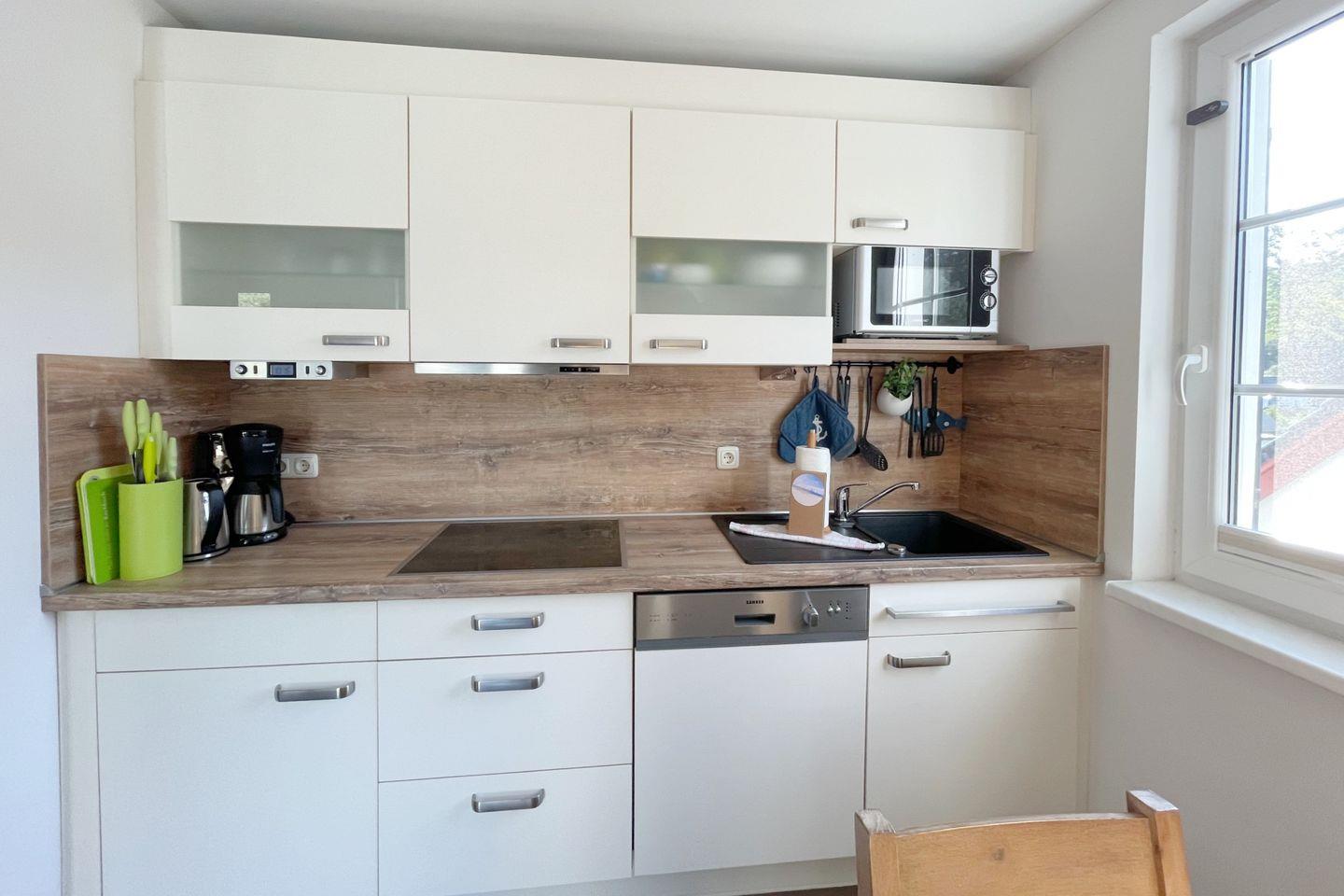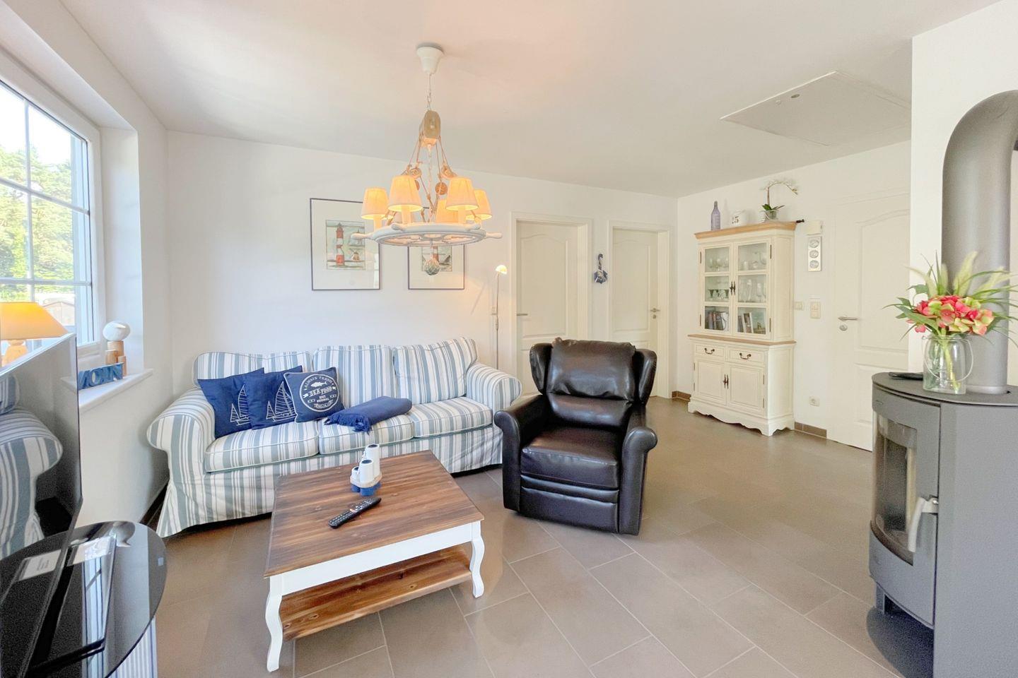 Der großzügige Balkon lädt mit seinem Blick in die grüne Umgebung zum Entspannen ein. Genießen Sie gemütliche Grillabende mit Freunden oder einfach das sanfte Licht der Abendsonne. Für die Kleinsten ist die Ferienwohnung kinderfreundlich ausgestattet, sodass sich die ganze Familie wohlfühlen kann. Die Ausstattung der „Seemöwe“ lässt keine Wünsche offen. Sie finden eine voll ausgestattete Küche mit Ceranherd, Mikrowelle mit Grillfunktion und Kühlschrank vor, sodass Sie auch während Ihres Aufenthalts kulinarischen Genüssen nachgehen können. Das Badezimmer ist mit einer ebenerdigen Dusche ausgestattet und bietet einen Ort der Erholung nach einem langen Tag am Strand. Für gemütliche Abende sorgt der Kaminofen im Wohnzimmer, der eine behagliche Atmosphäre schafft.