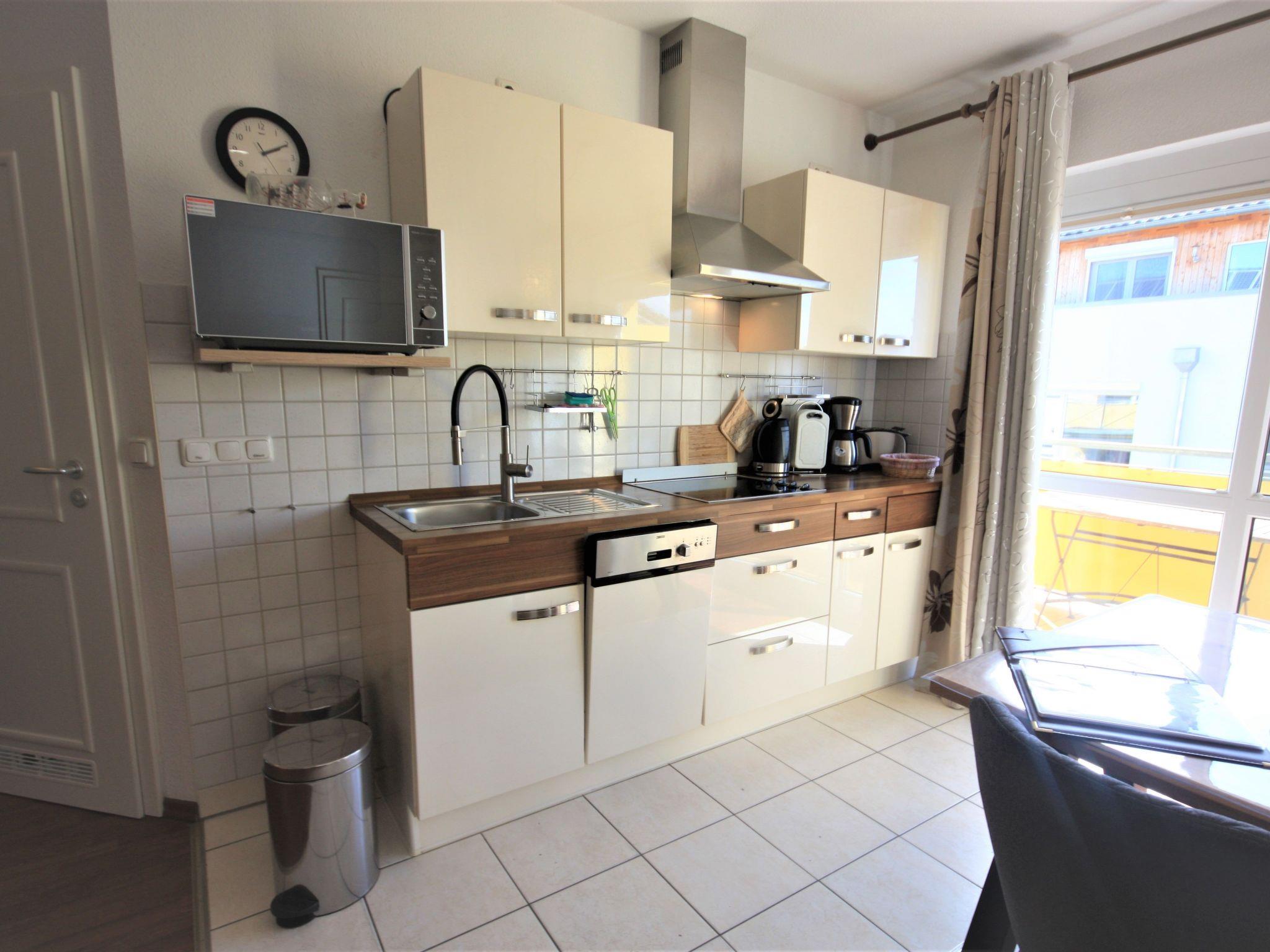 1 Küchenzeile mit 4-Ceranfeld, Mikrowelle, Geschirrspüler, Kaffeemaschine, Toaster.