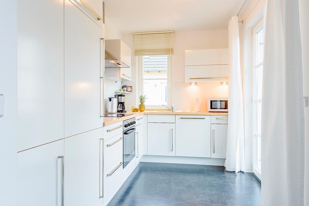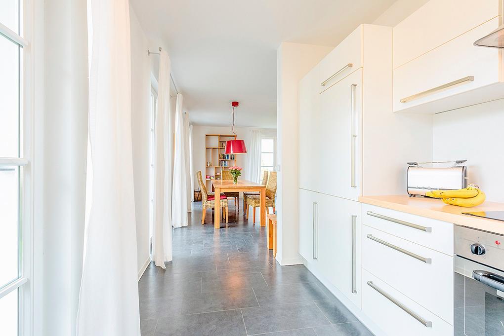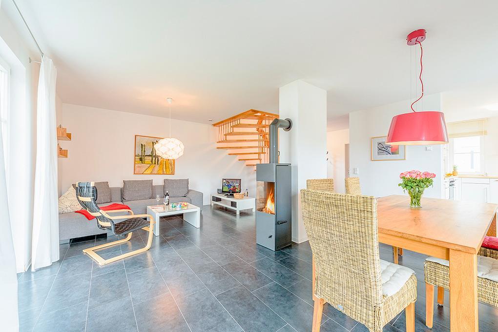 D 16.7 Ferienhaus 3-6 Pers.: 4-Zimmerhaus mit 100 qm Wohnfläche über 2 Etagen. Parterre: Heller Wohn-/Essraum mit Kaminofen, Couchgarnitur, Sat-TV, DVD, Radio/CD, Esstisch, moderner Küchenzeile (Backofen, Mikrowelle, Spülmaschine). Abstellraum. Bad/WC. 1. Etage: Zwei 2-Bettzimmer. Großes 4-Bettzimmer mit Doppelbett, Schlafcouch (2 Pers.). Bad/WC.
