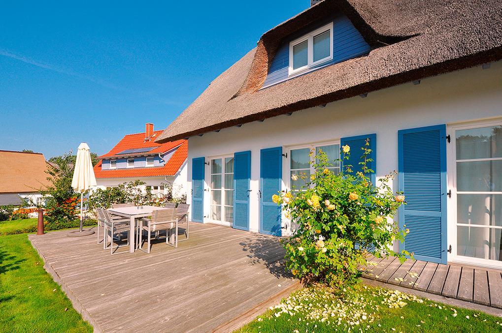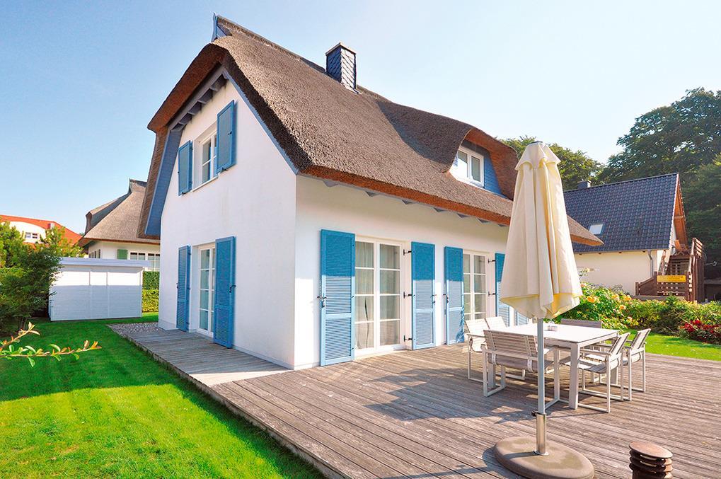 Haus: Schönes Reetdachhaus mit Kaminofen. Moderne Ausstattung, geschmackvolle Möblierung. Internet kostenlos über W-Lan. Zentral-/Fußbodenheizung. Nichtraucherhaus. Große Terrasse mit Sitzmöbeln, Elektro-Grill. Hübscher kleiner Garten. Gartenhaus für bis zu 6 Fahrräder. 2 Pkw-Stellplätze am Haus.