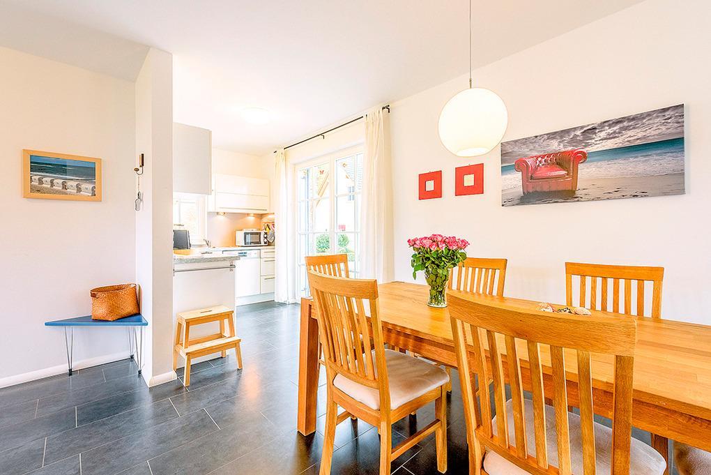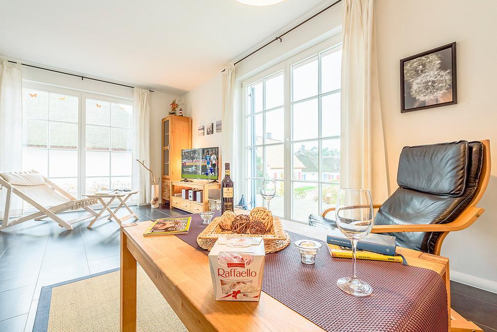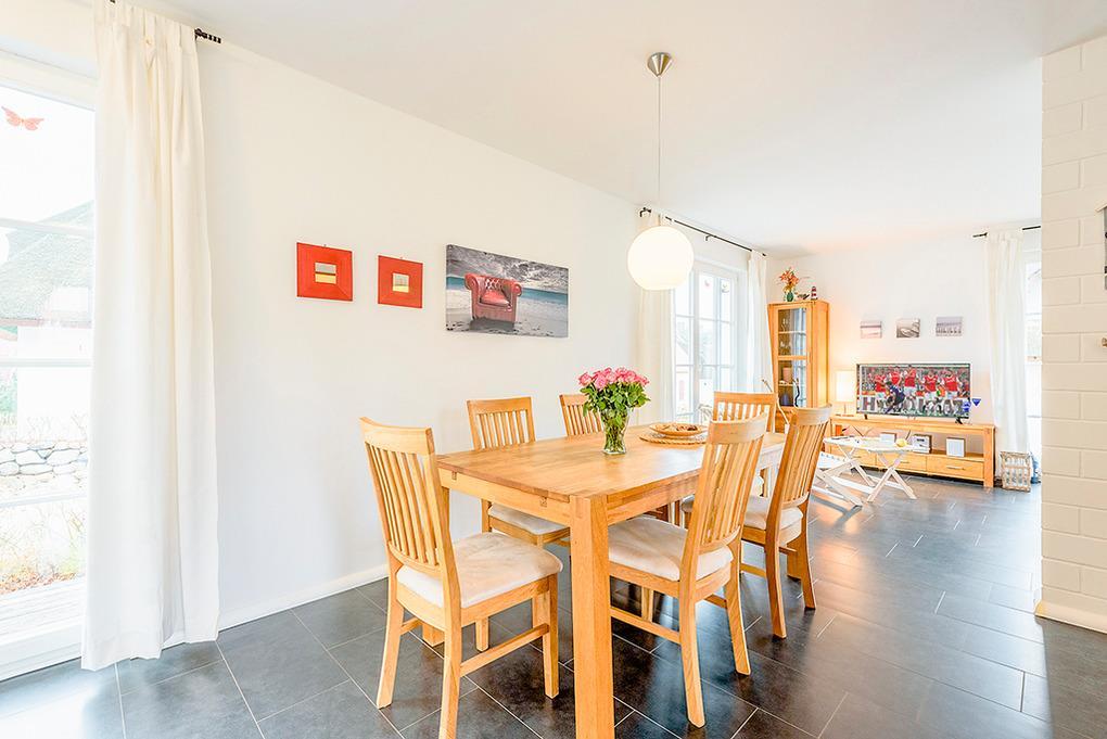 Haus: Schönes Reetdachhaus mit Kaminofen. Moderne Ausstattung, geschmackvolle Möblierung. Zentral-/Fußbodenheizung. Nichtraucherhaus. Kostenloser Internetzugang über Wlan. Große Terrasse mit Sitzmöbeln, Grillkamin. Gartenhaus für Fahrräder. 2 Pkw-Stellplätze am Haus.