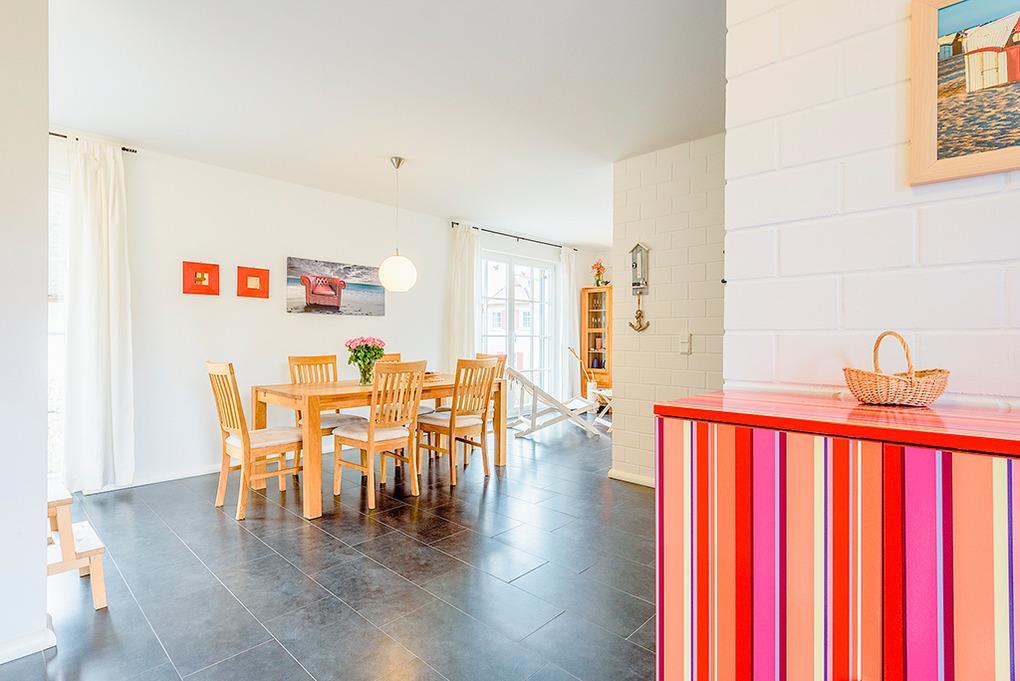 D 16.8A Ferienhaus 3-6 Pers.: 3-Zimmerhaus mit 90 qm Wohnfläche über 2 Etagen. Parterre: Heller Wohn-/Essraum mit Kaminofen, Couchgarnitur (Schlafcouch 2 Pers.), Sat-TV, Radio/CD, Esstisch, moderner Küchenzeile (Backofen, Mikrowelle, Spülmaschine). Abstellraum. Bad/WC. 1. Etage: Zwei große Doppelzimmer, davon eins mit Sat-TV. Bad/WC.