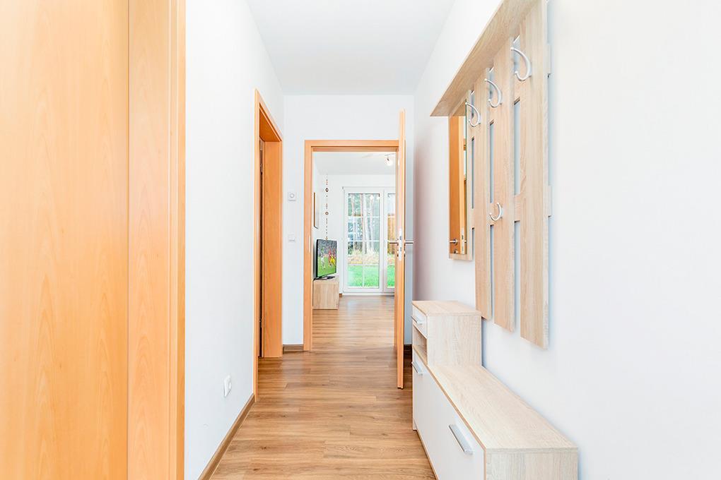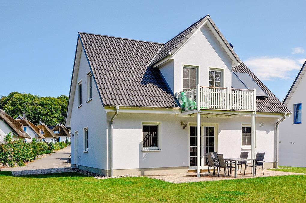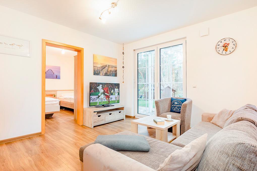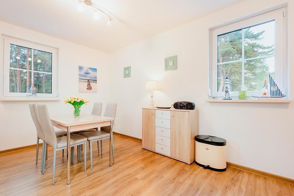 Geschmackvoll eingerichtetes Ferienhaus in Koserow mit Terrasse, Nähe Ostseestrand und Blick auf Kiefernwald.
