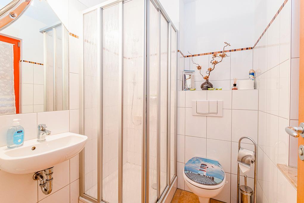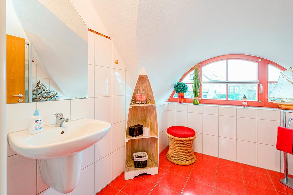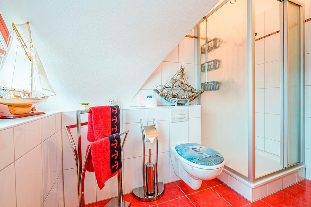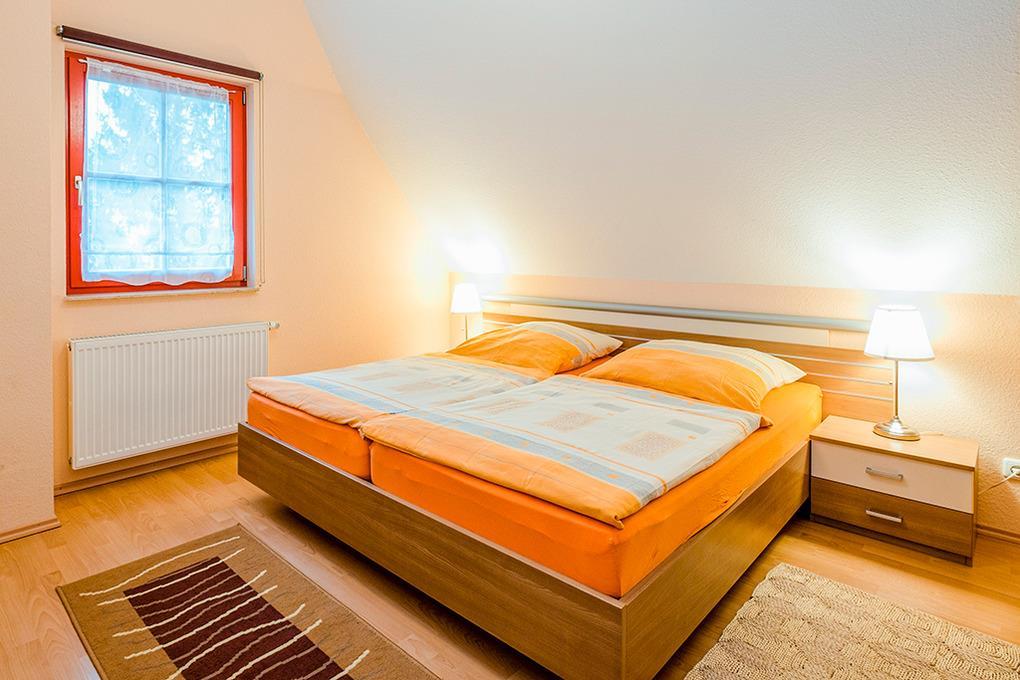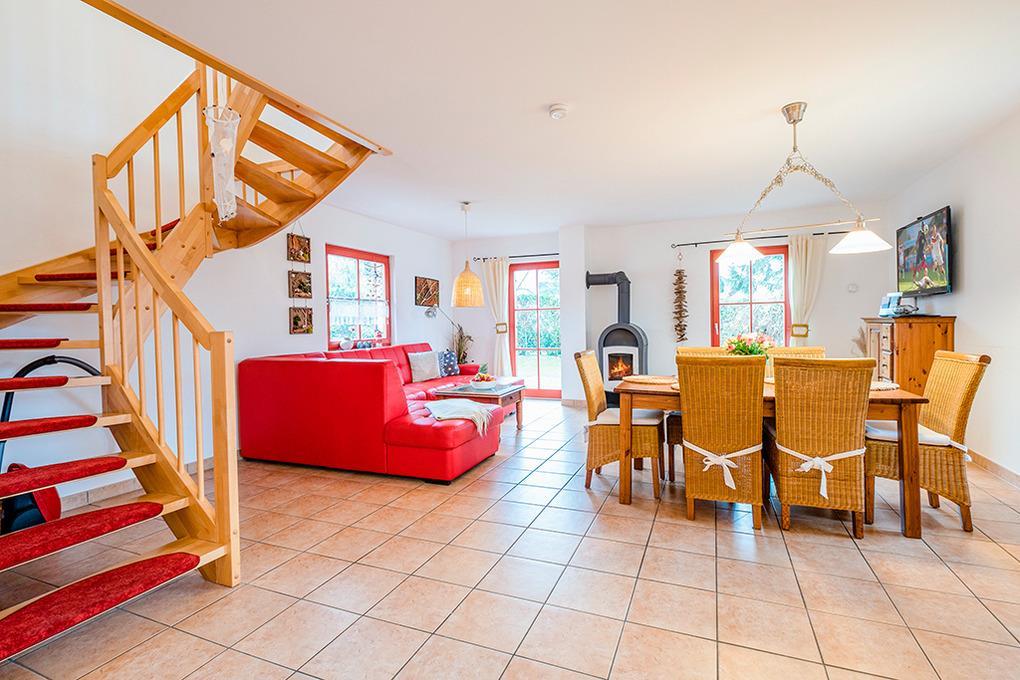 D 16.6 Ferienhaus 4-8 Pers.: Schönes 3-Zimmerhaus mit 91 qm Wohnfläche über 2 Etagen. Parterre: Gemütlicher Wohn-/Essraum mit Kaminofen, Couchgarnitur (Ausziehcouch 2 Pers.), gr. Sat-TV, Radio/CD, Esstisch, moderner Einbauküche (Backofen, Mikrowelle, Spülmaschine). Abstellraum. Bad/WC. 1. Etage: Doppelzimmer mit Sitzecke, Kinderbett (1,20 m Länge). 4-Bettzimmer mit Doppelbett, Einzelbett, Ausziehbett. Bad/WC.