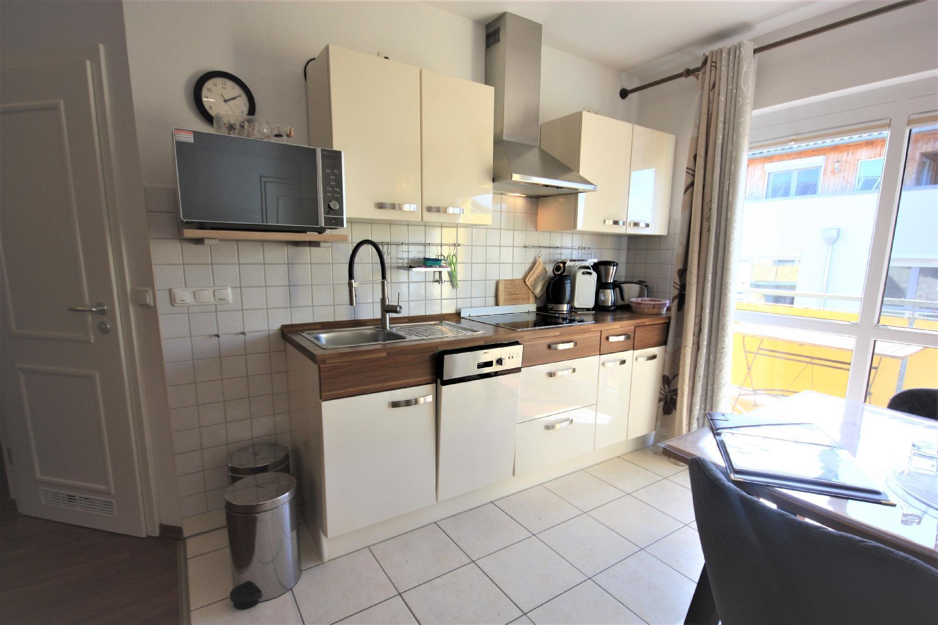 1 Küchenzeile mit 4-Ceranfeld, Mikrowelle, Geschirrspüler, Kaffeemaschine, Toaster.