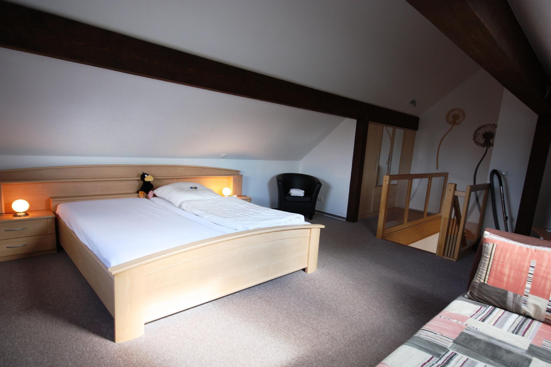 1 Maisonetteschlafzimmer mit Doppelbett (180*200), SAT-TV, Bettcouch (90*200), Kinderbett (60*120), 2 Ablagesesseln und großem Schrank