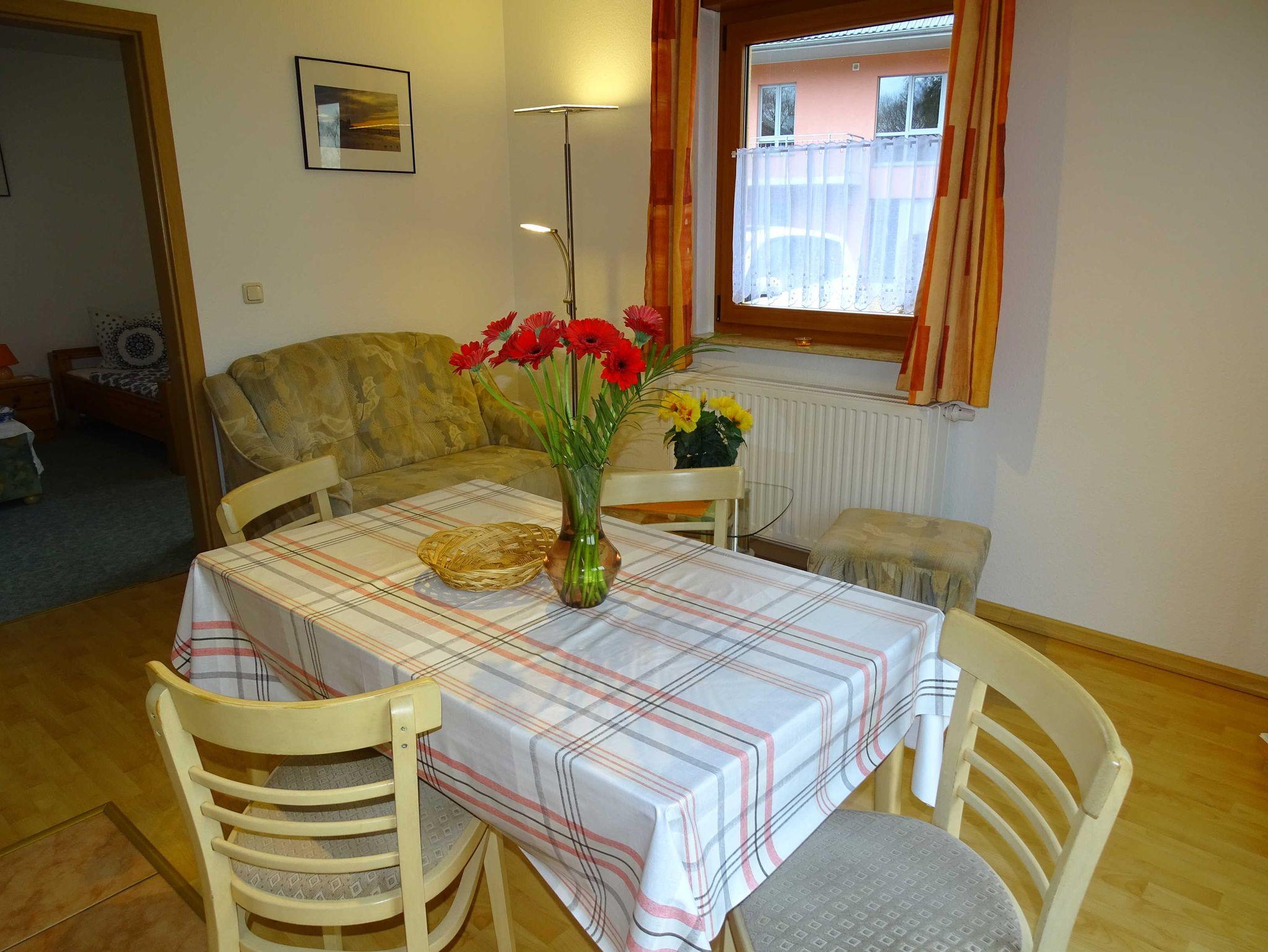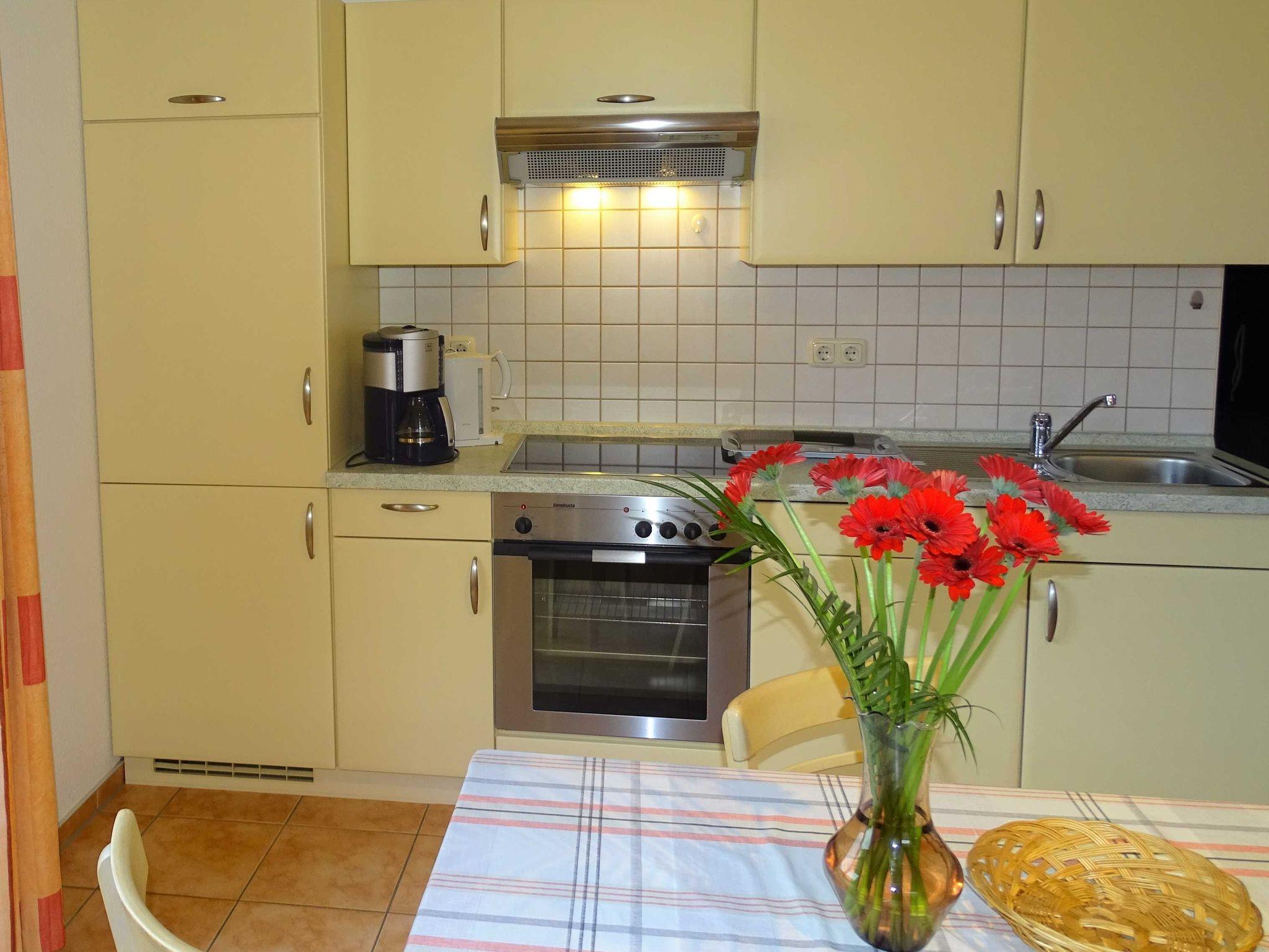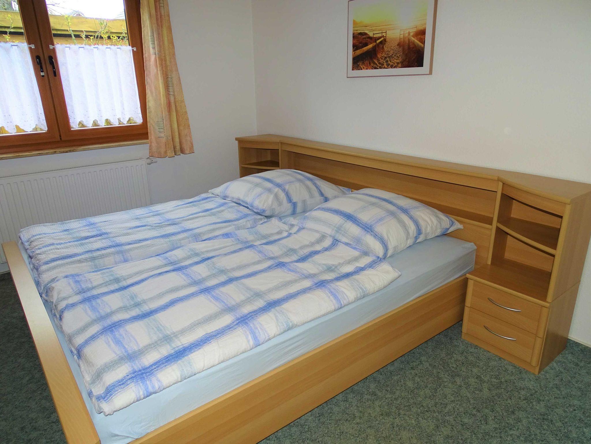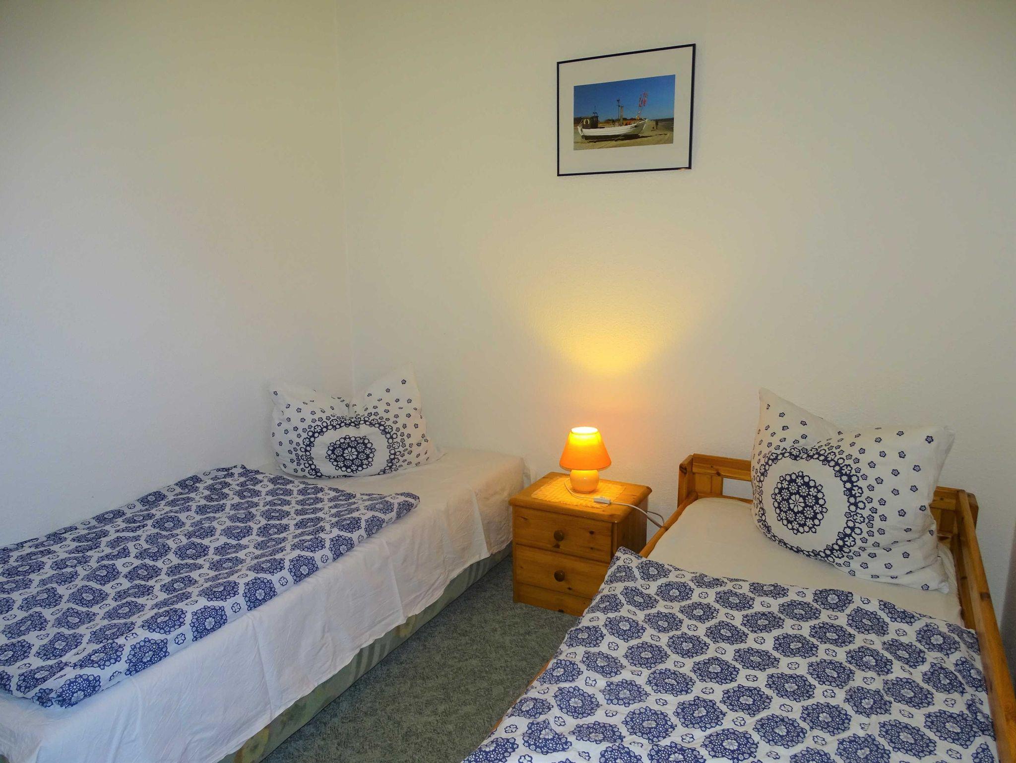 Die helle Ferienwohnung mit zwei separaten Schlafzimmern und einer möblierten Terrasse befindet sich im Erdgeschoß des Ferienhauses mit vier Partien. Im Wohnraum befindet sich eine gemütliche Couchecke und neben der gut ausgestatteten Küchenzeile auch ein Esstisch für vier Personen. In einem Schlafzimmer finden Sie ein Doppelbett und in dem anderen zwei Einzelbetten. Ein PKW-Stellplatz steht auf dem Grundstück zur Verfügung. Die Erstausstattung Bettwäsche ist inklusive, Handtücher können Sie für 5,00 Euro/Person dazu buchen.