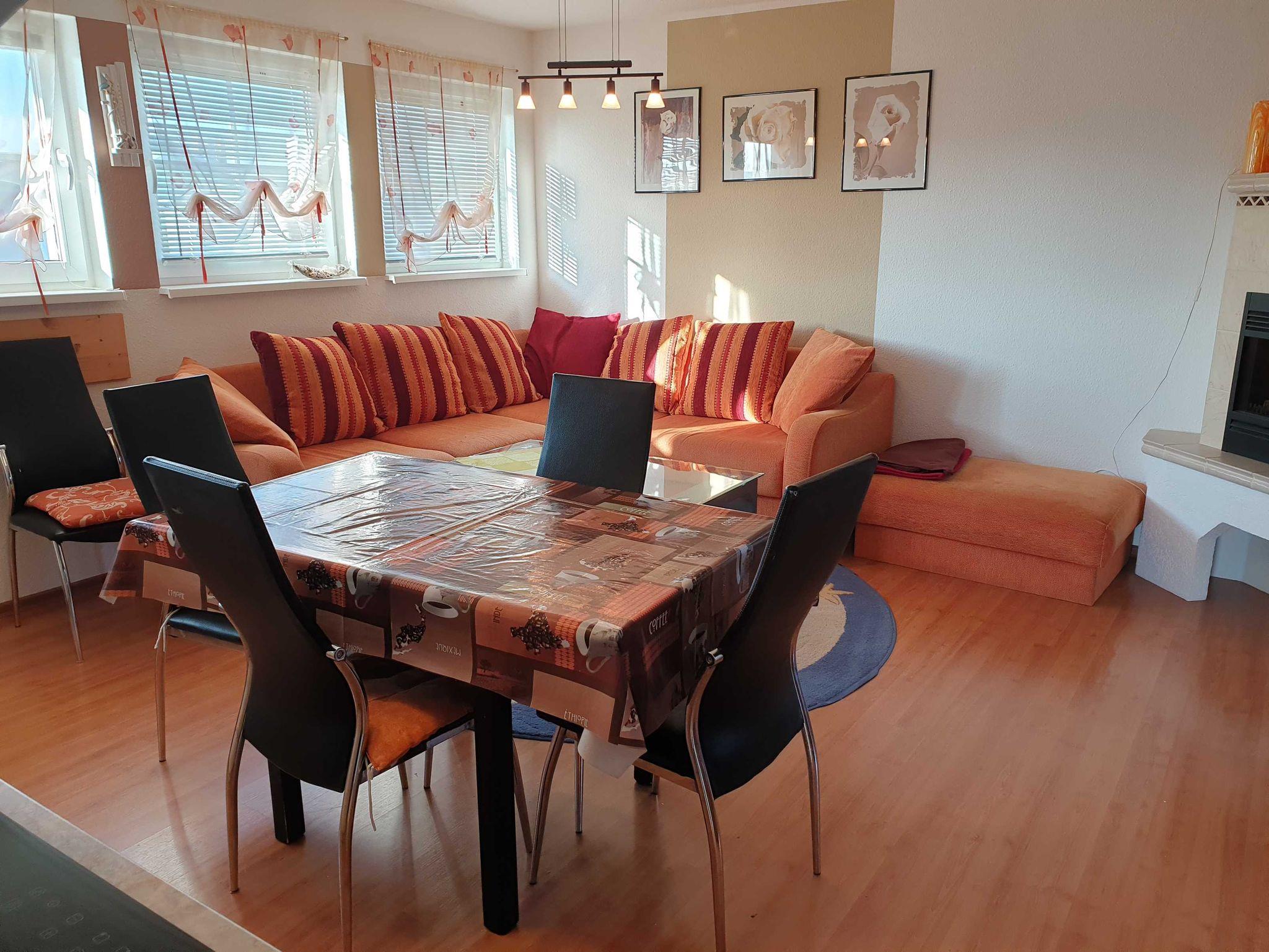 Wohnraum mit Eck-/Schlafcouch, Esstisch, elektrischem Kamin, in allen Räumen Elektroheizung.