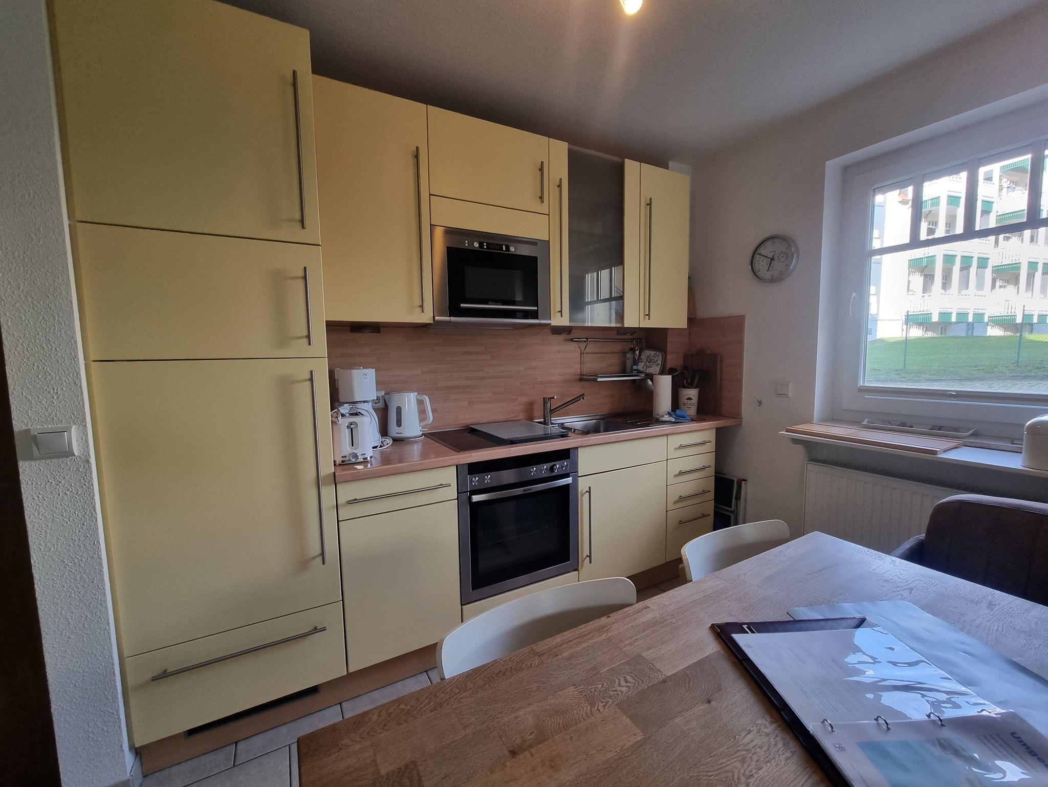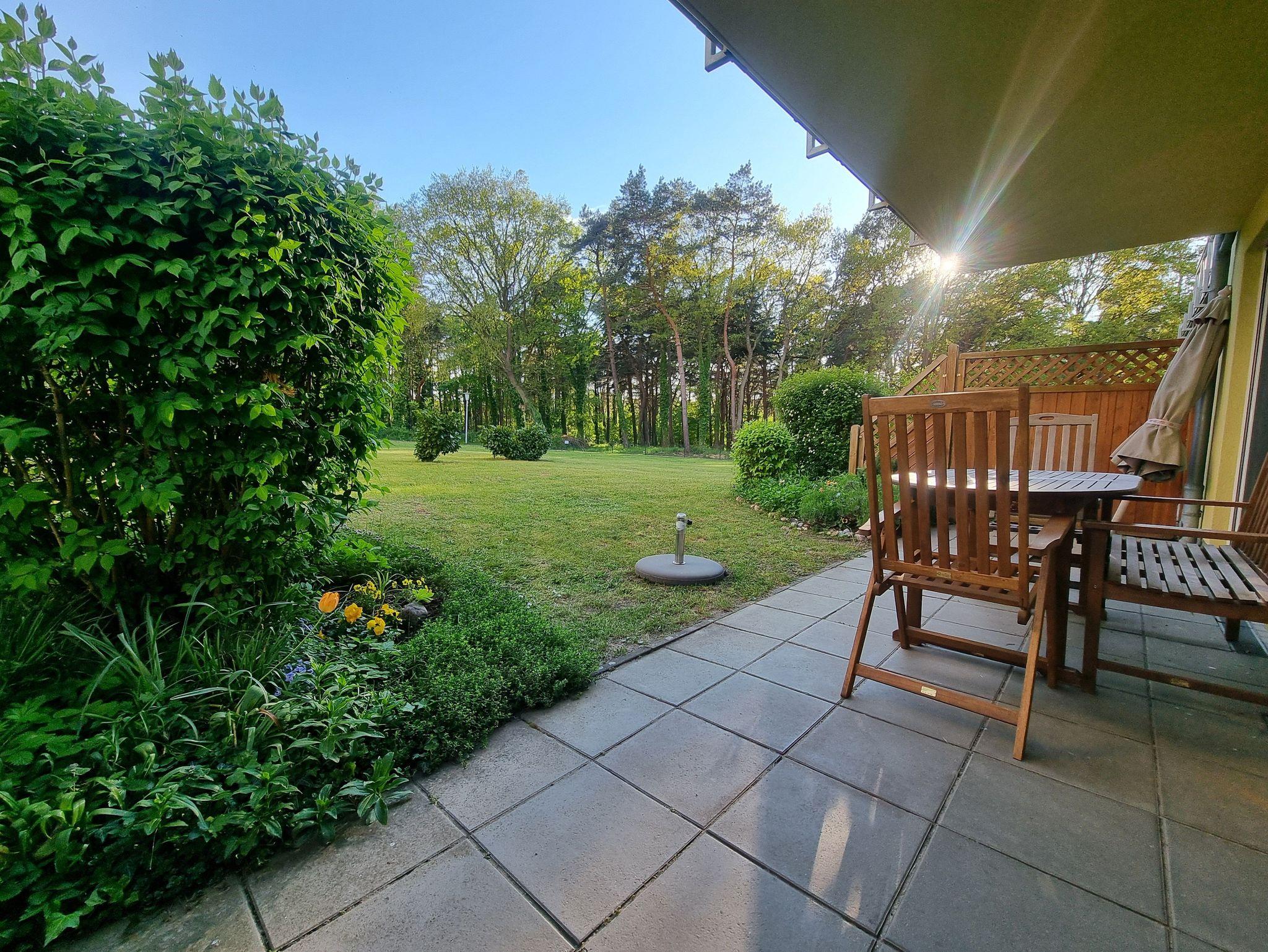 Die Ferienwohnung liegt im Erdgeschoß des Ferienhauses. Sie besteht aus Wohnzimmer, kompl. ausgestatteter Küche, Schlafzimmer und Tageslichtbad. Die Ausstattung der Einbauküche ist neuwertig funktional und qualitativ hochwertig unter anderem mit Toaster, Kaffeemaschine, Backofen mit Heißluft, Kochfeld, Geschirrspüler, Gefrierfach. Große Süd-Terrasse mit Blick auf den Küstenwald, große Spielwiese. Grillplatz