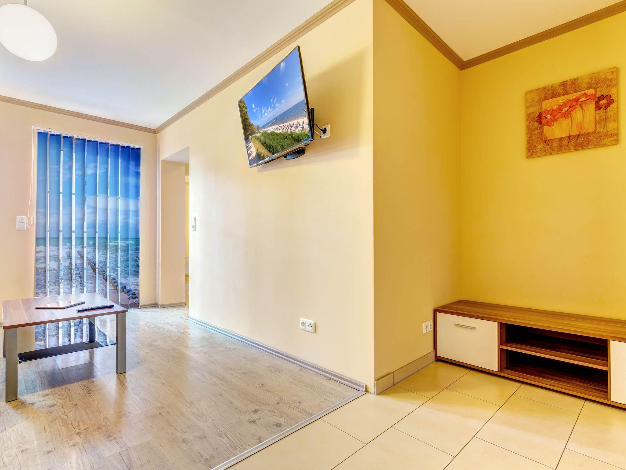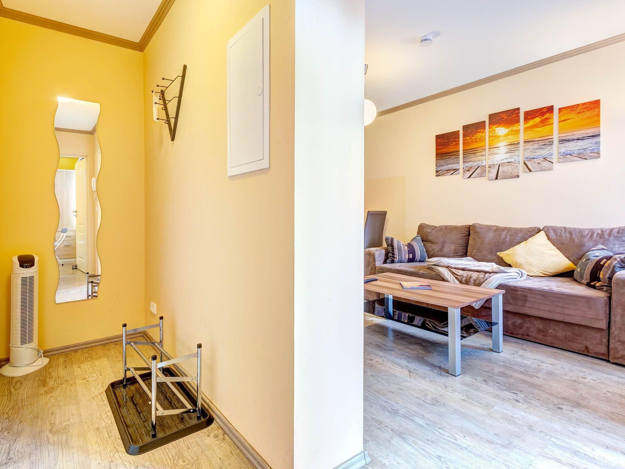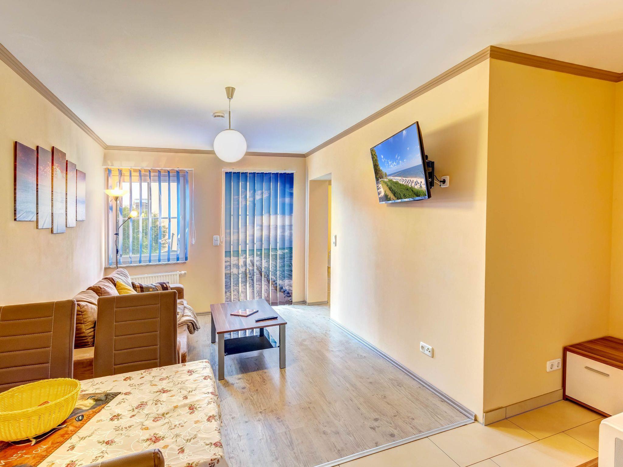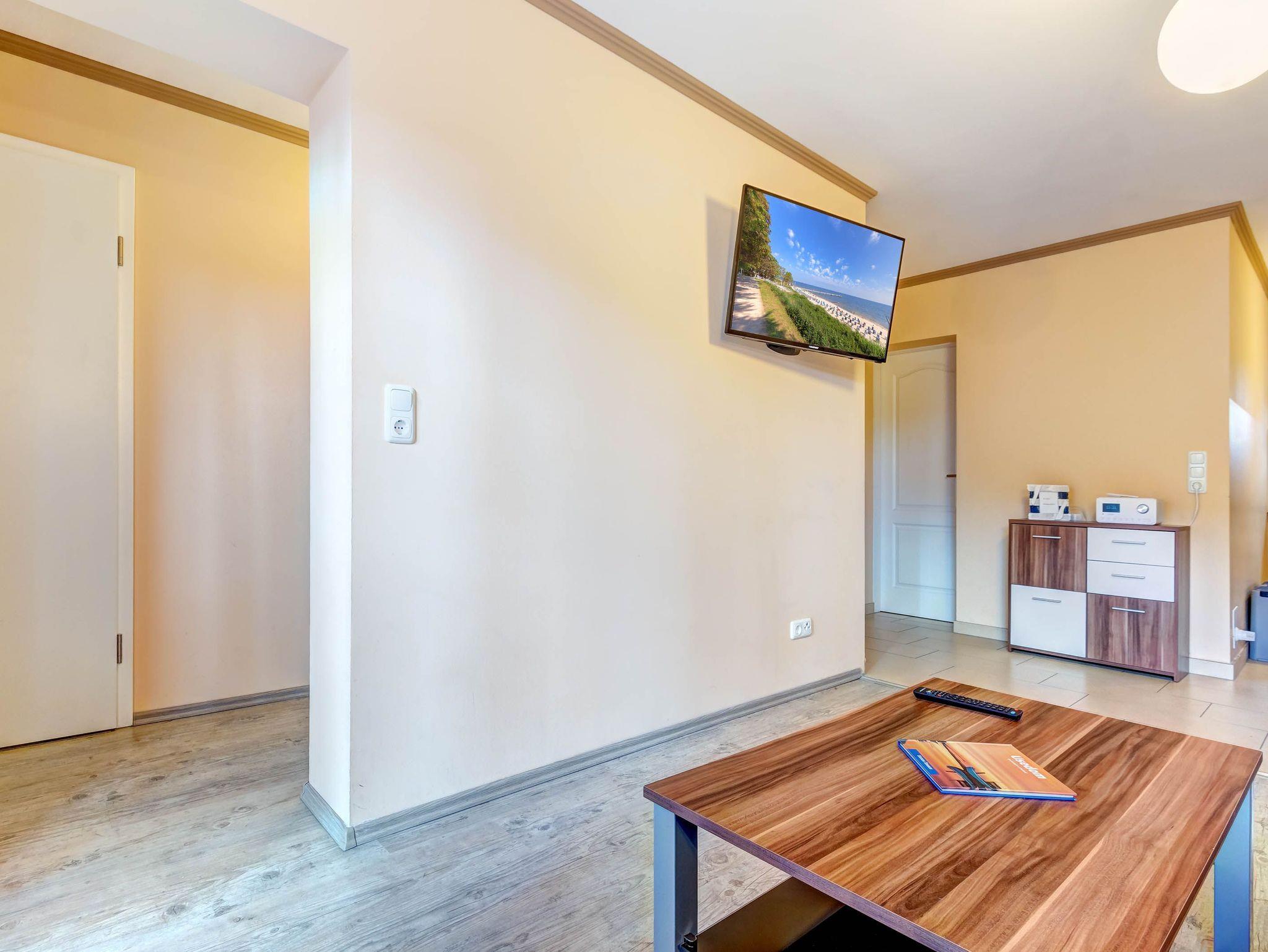 Die gemütliche 2-Raumwohnung für bis zu 4 Personen (plus ein Kleinkind bis 2 Jahre) ist modern eingerichtet und verfügt über ein großes Doppelbett im Schlafzimmer. Bettwäsche und Handtücher können selbst mitgebracht oder gegen Gebühr hinzugebucht werden. Bei Buchung des Wäschepakets sind die Betten bereits bezogen.