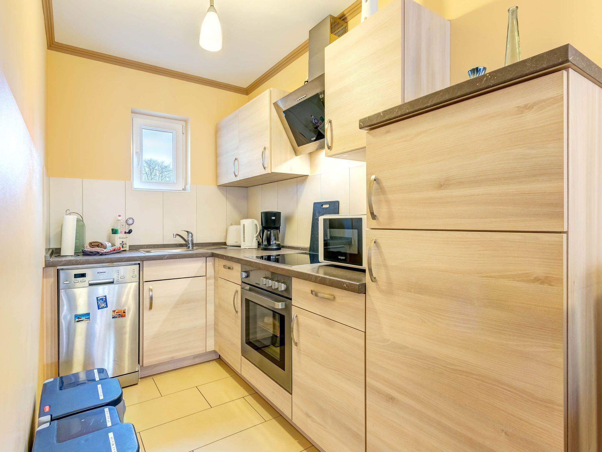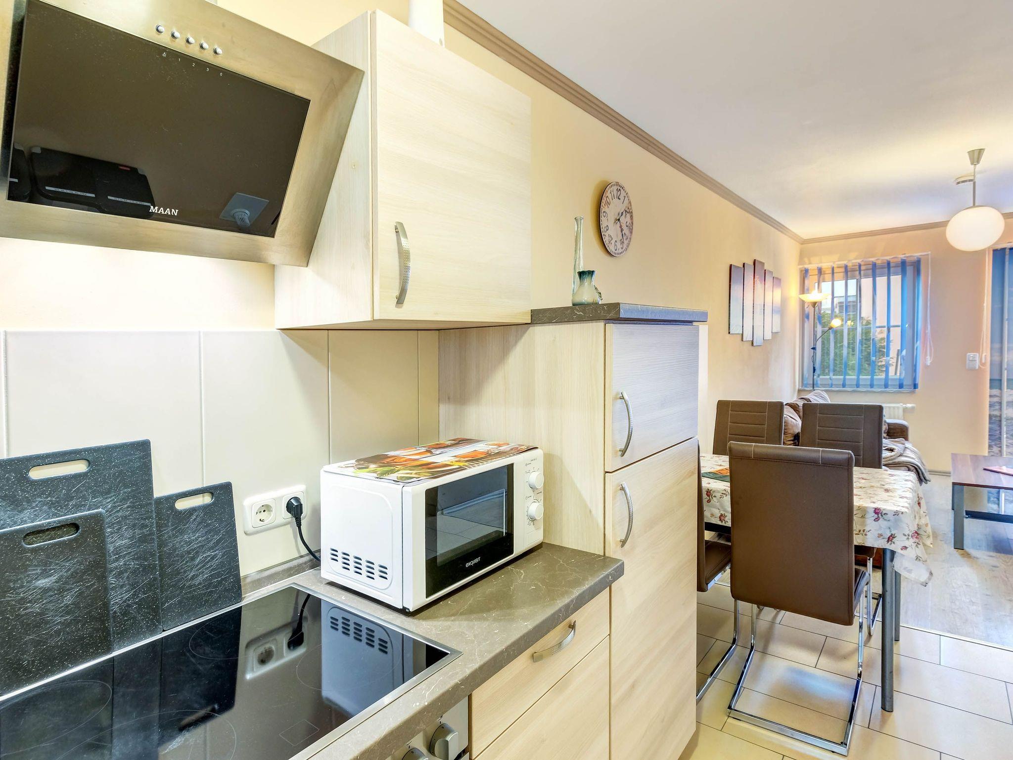 Ein Kinderbett und Hochstuhl stehen kostenfrei zur Verfügung. Die Wohnung ist mit einer Küchenzeile, einer hochwertigen Sitzgarnitur (die auch als Bett genutzt werden kann) sowie modernen Geräten wie Herd, Kühlschrank, Mikrowelle, Toaster, Wasserkocher und Kaffeemaschine ausgestattet.