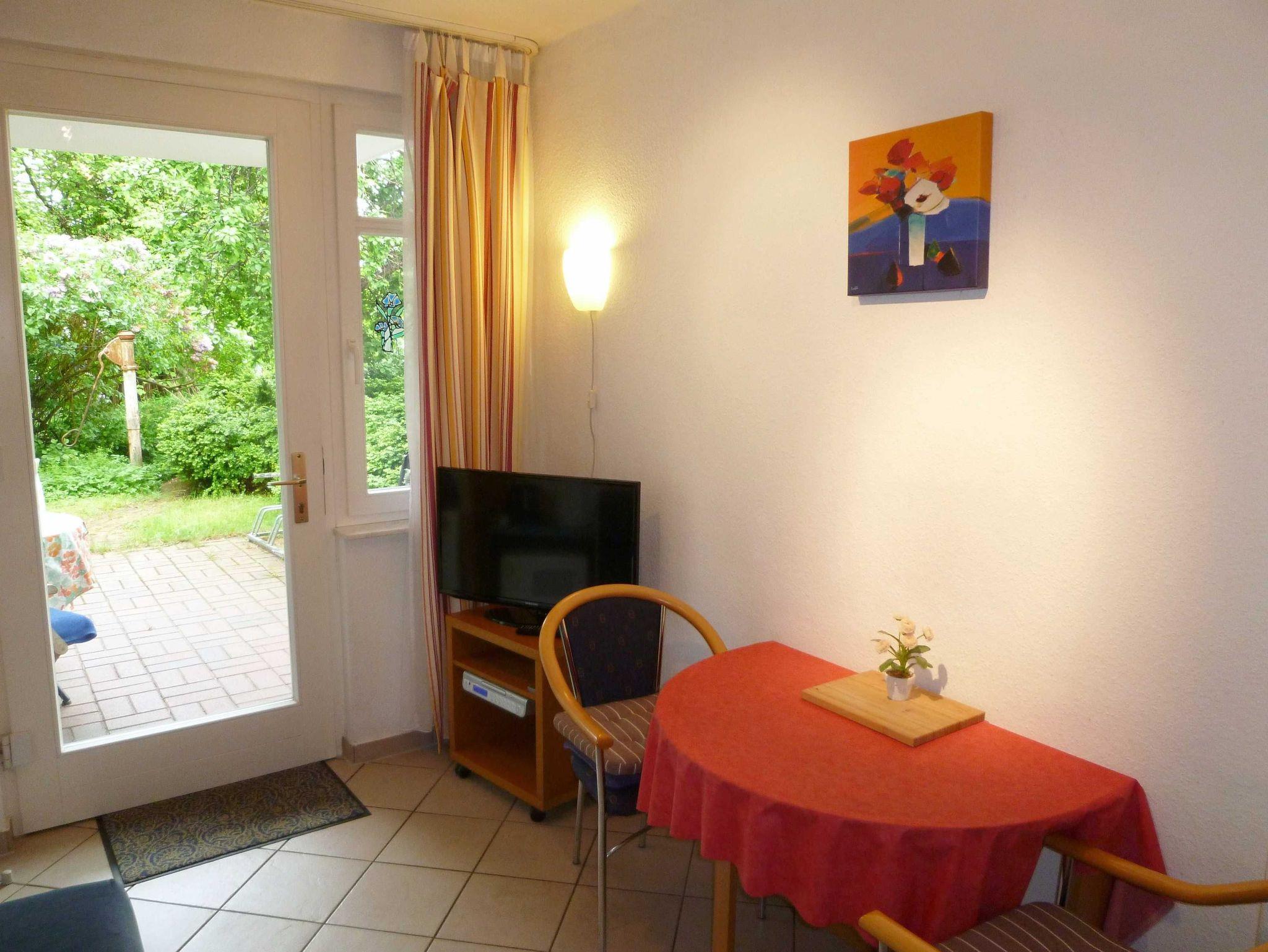 1-Raum-Appartement mit separatem Eingang für 1 bis 2 Personen, kombiniertes Wohn-/Schlafzimmer mit Schlafcouch, hochwertige Miniküche im Wohnraum mit Cerankochfeld und Kühlschrank (4-Sterne Eisfach). Modern ausgestattet, schöner Fliesenboden. Modernes Bad mit Dusche und WC. Große, möblierte Terrasse nach Süden und Westen orientiert, teilweise überdacht (2,40 m) mit zwei Rollliegen und Strandkorb. 32 LCD-Fernseher, Sat-TV, Radio mit CD-Player, Kaffeemaschine, Mikrowelle mit Grill.