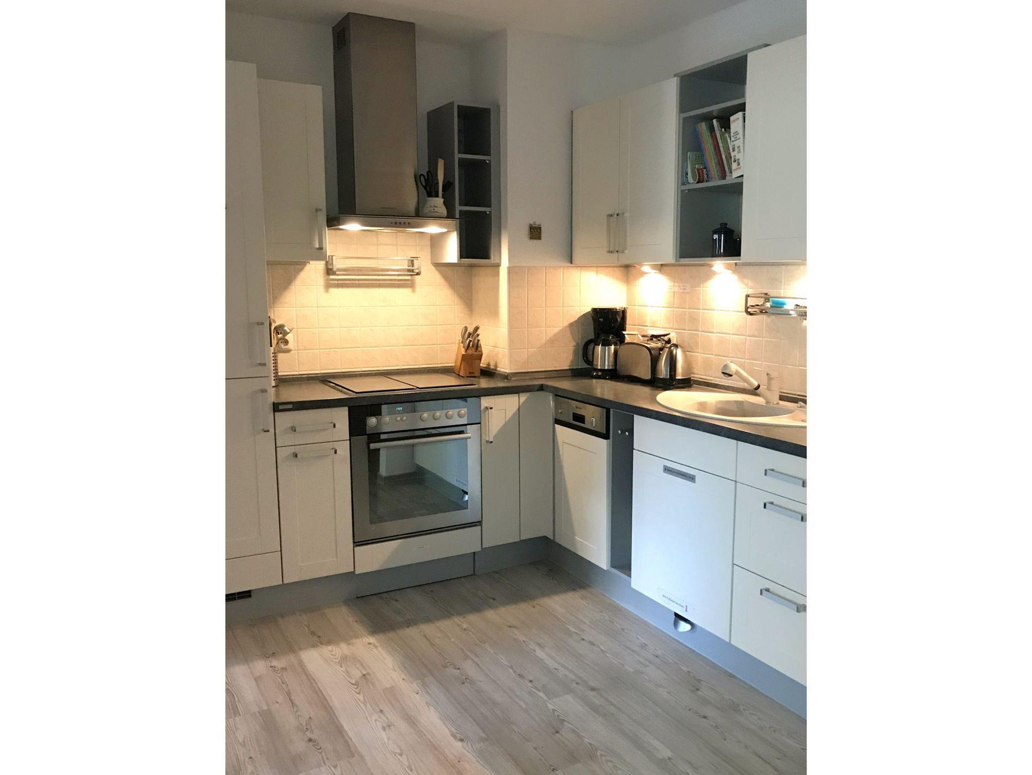 • ein offener Küchenbereich mit Spülmaschine, Ceranfeld, Backofen, Toaster, Wasserkocher, Kaffemaschine, Saftpresse, Kühlschrank, Tiefkühlschrank und viele Kleinigkeiten, die ein entspanntes Handling im Rahmen der Selbstverpflegung ermöglichen und sich damit vom üblichen Standard abheben