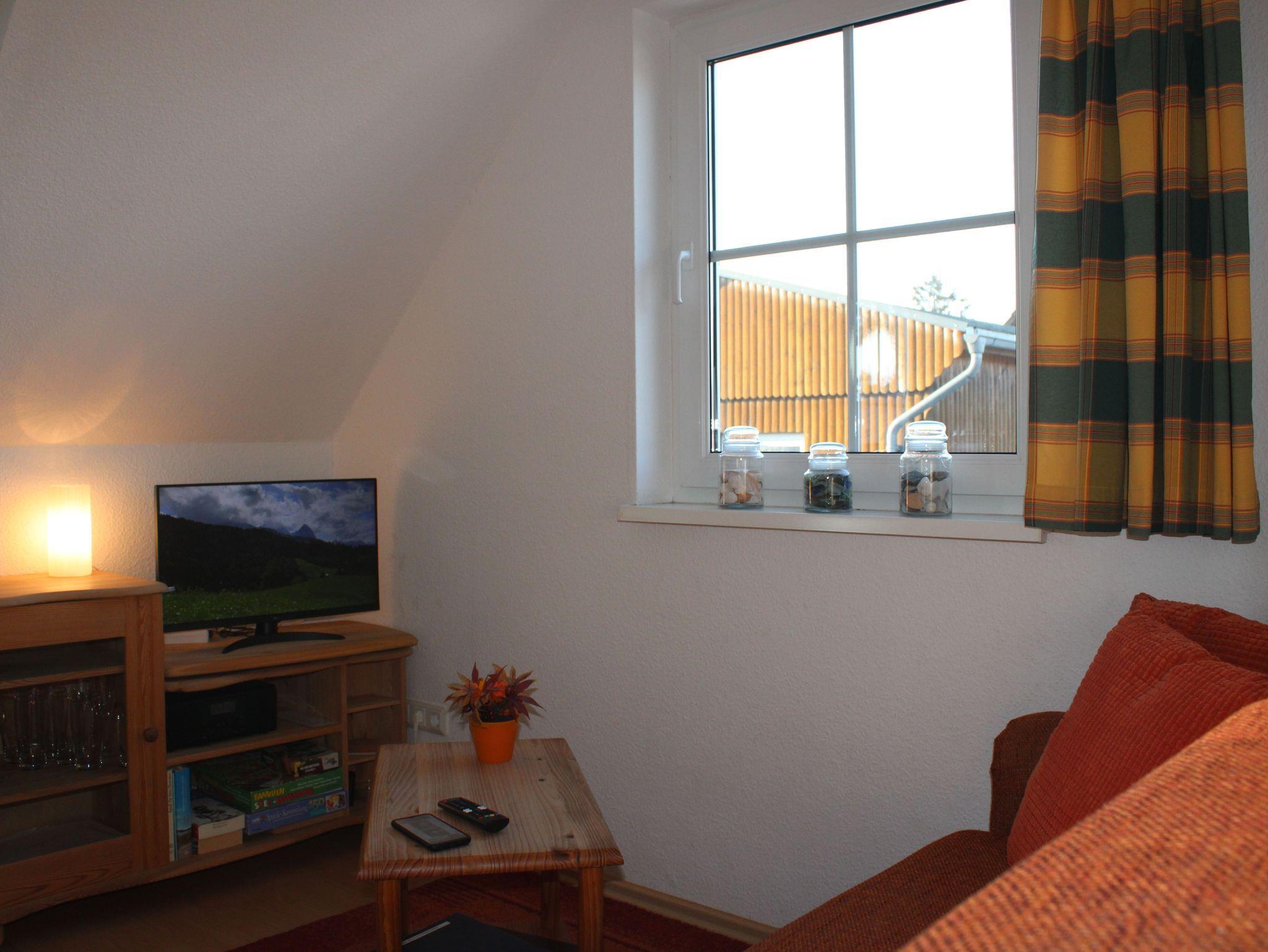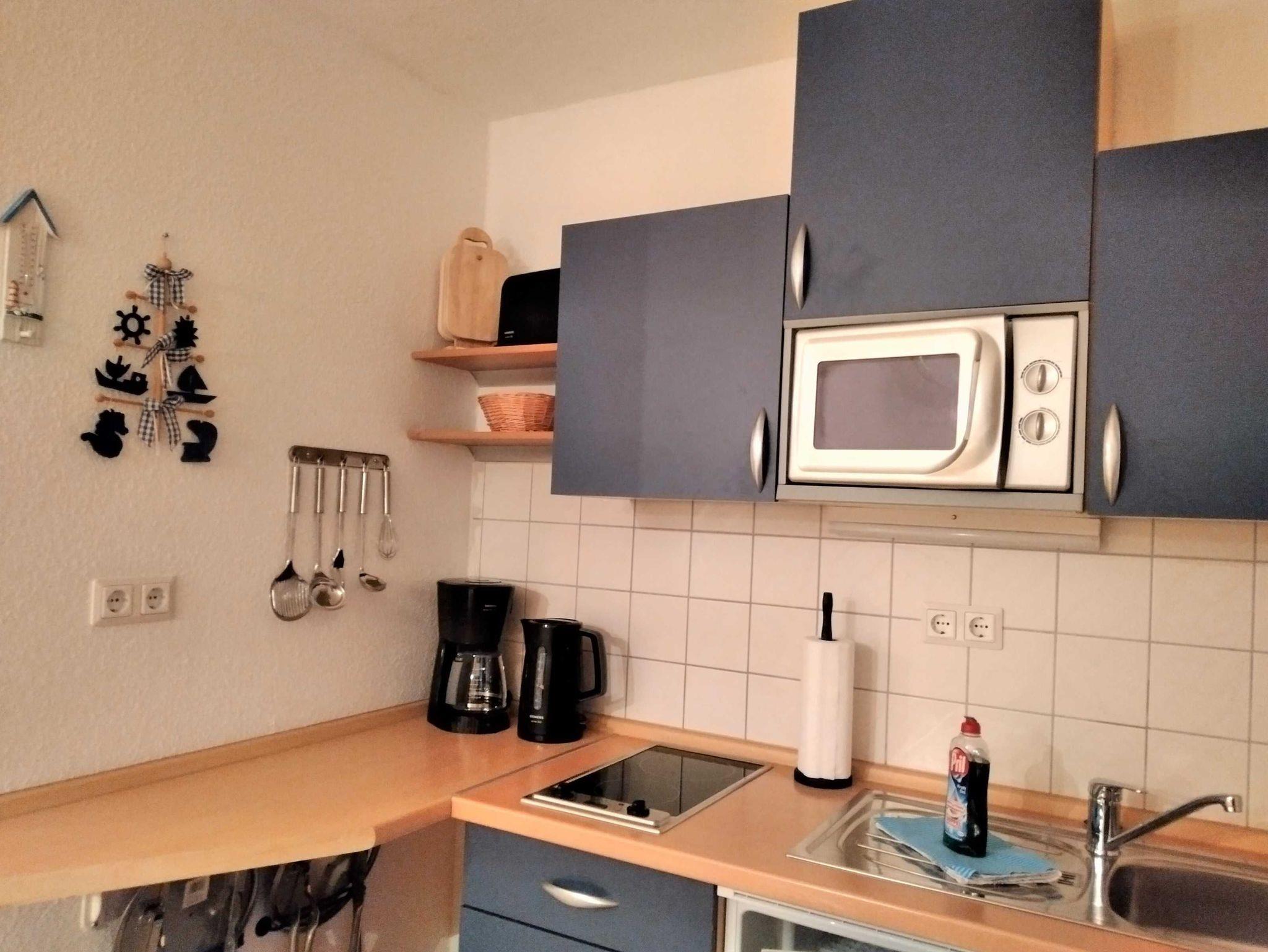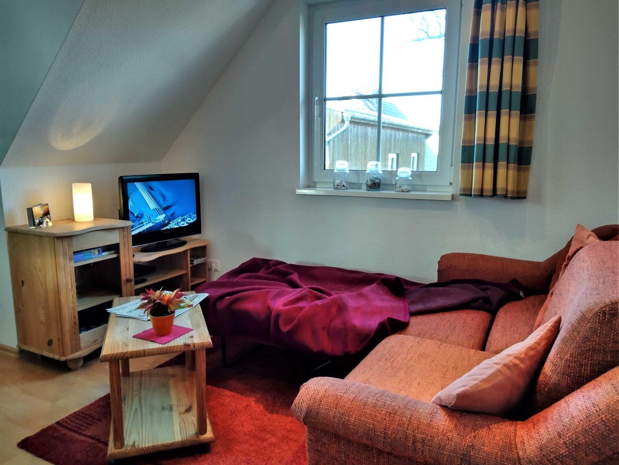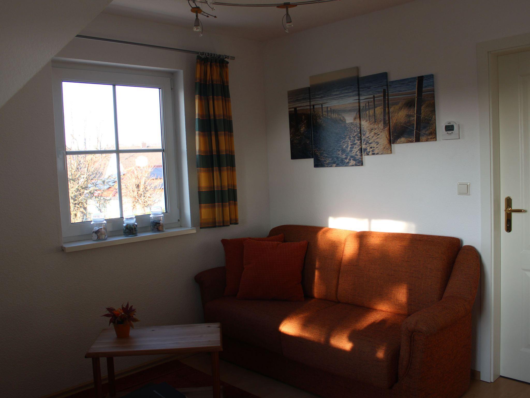Schöne 2-Zimmer Ferienwohnung im 1. Obergeschoss. Geschmackvoll und zweckmäßig eingerichtet sind der Schlafraum mit Doppelbett und ein kombinierter Wohn- Schlafraum, mit einer Couch mit Schlaffunktion (3. Person) mit TFT- LCD Fernsehgerät und Radio. Zur Wohnung gehört ein Bad mit DU/WC und eine offene Küche im Wohnbereich.