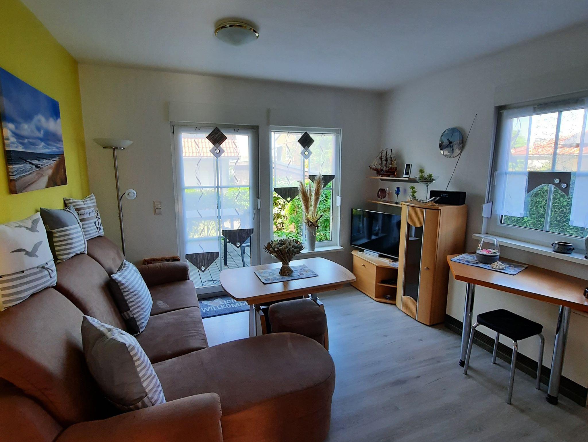 Schöne 3-Zimmer Ferienwohnung in einer freundlich angelegten Ferienanlage. Die Ferienwohnung ist im Wohnbereich ausgestattet mit einer gemütlichen Couch und einer offenen Küche mit Essbereich.