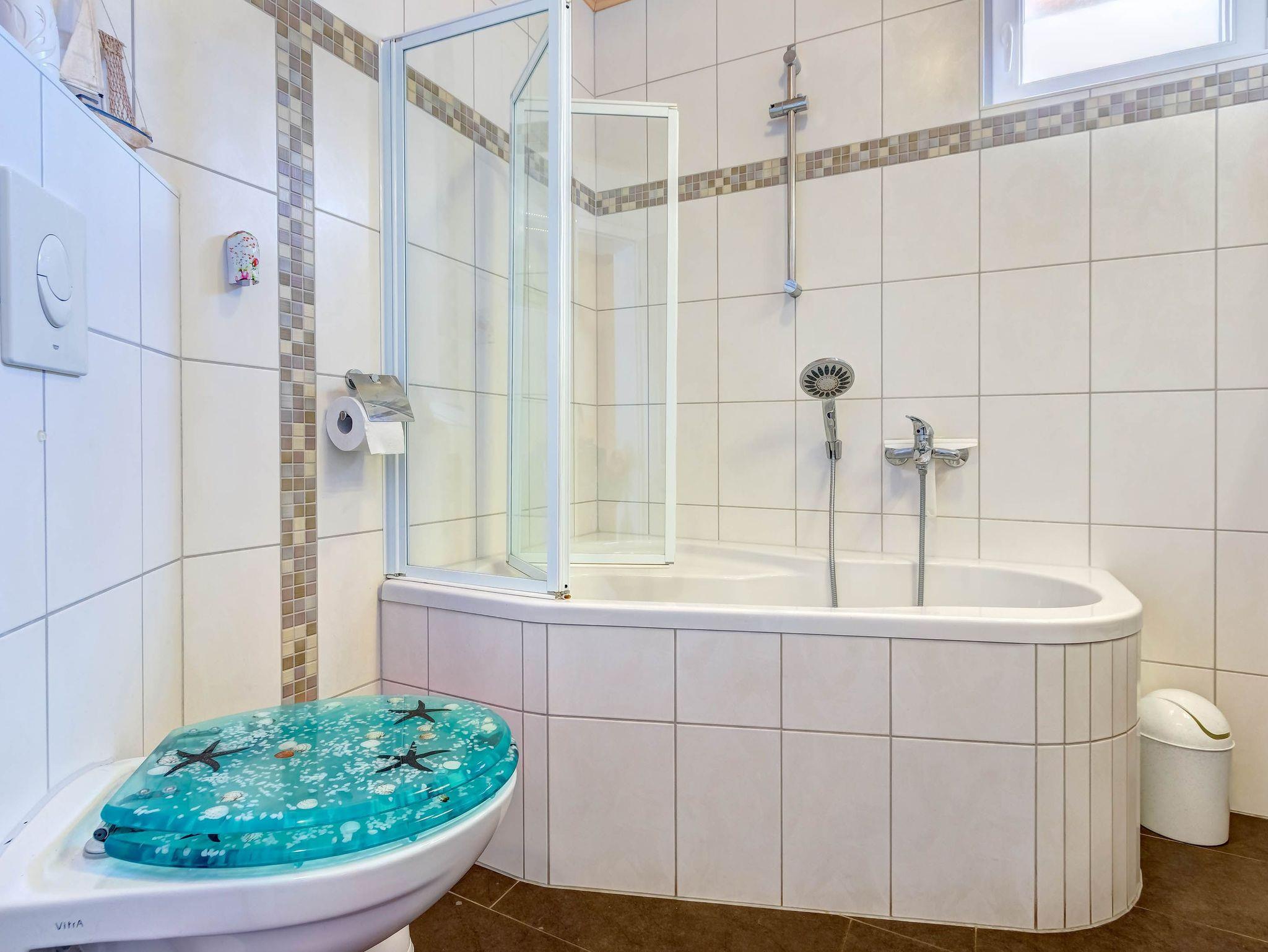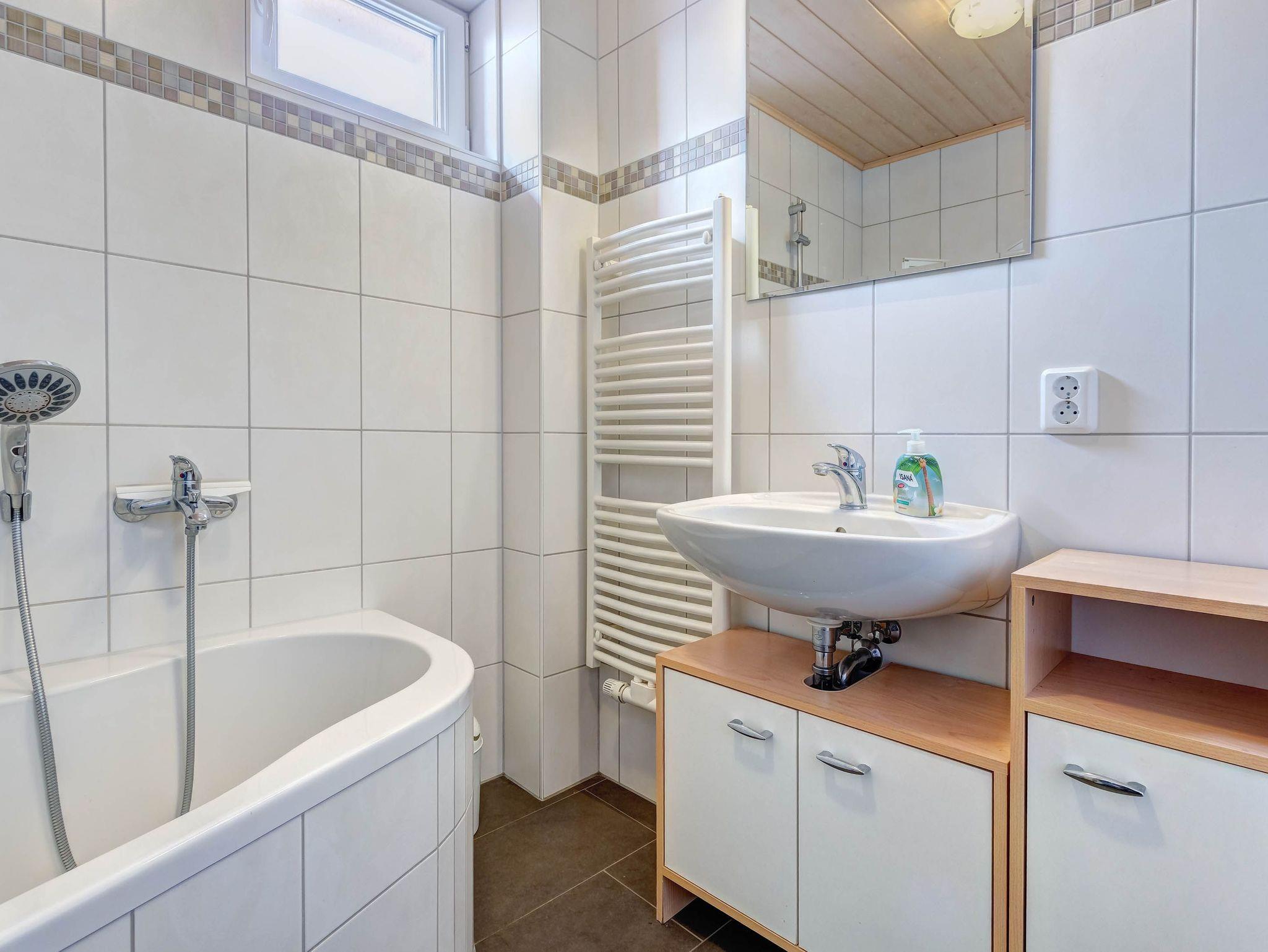 Das Badezimmer, mit kleinem Fenster, verfügt über eine Dusch-Badewanne, ein WC, ein Waschbecken, sowie reichlich Ablagefläche und zwei kleine Schränke.