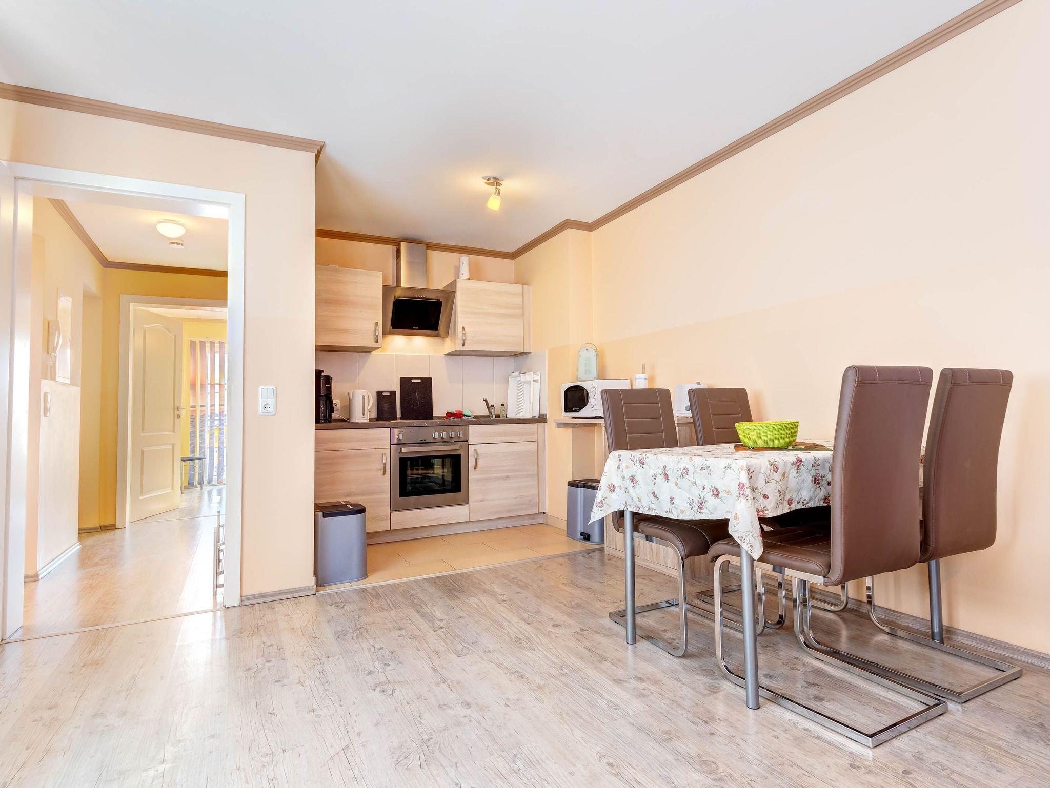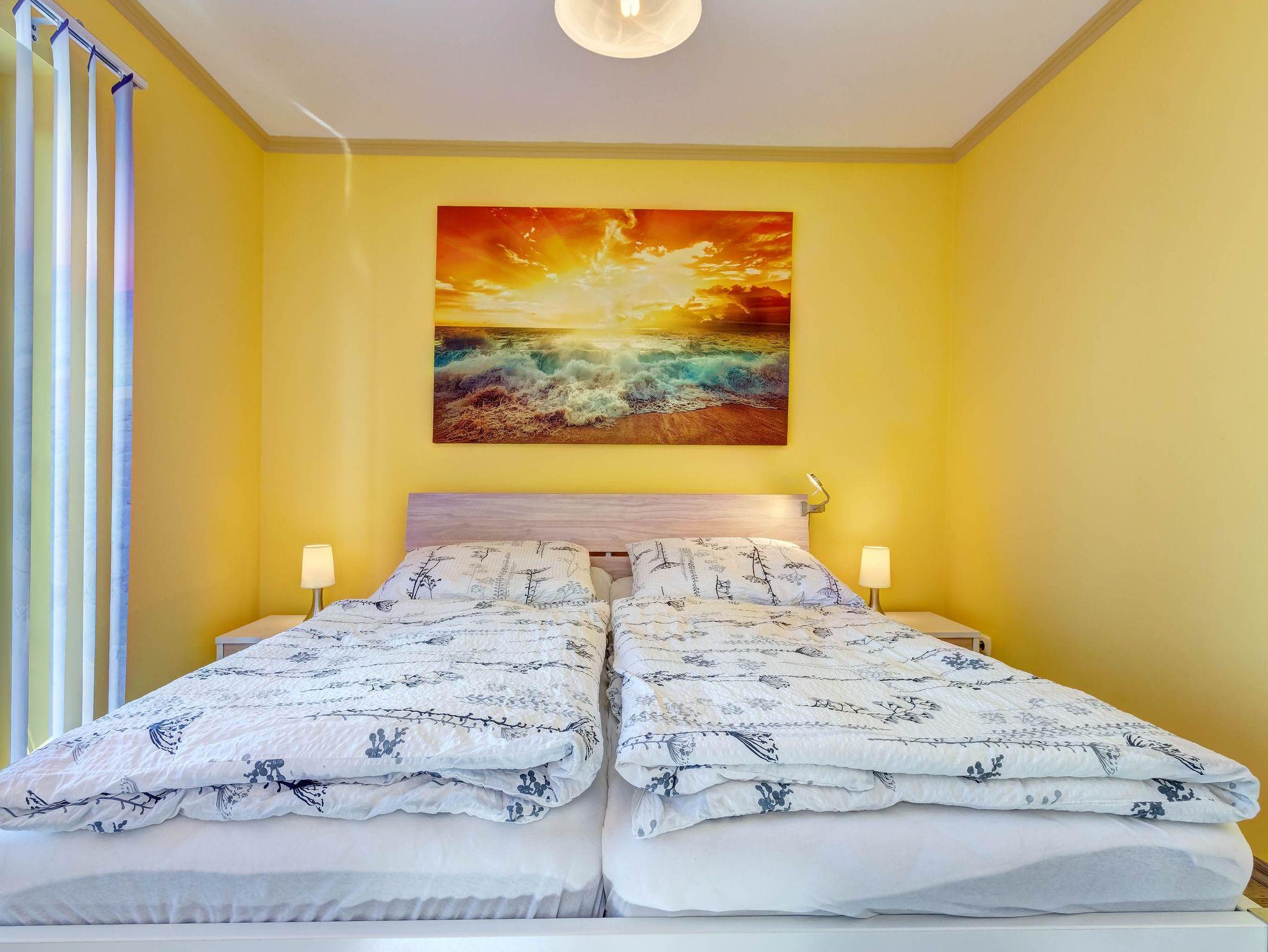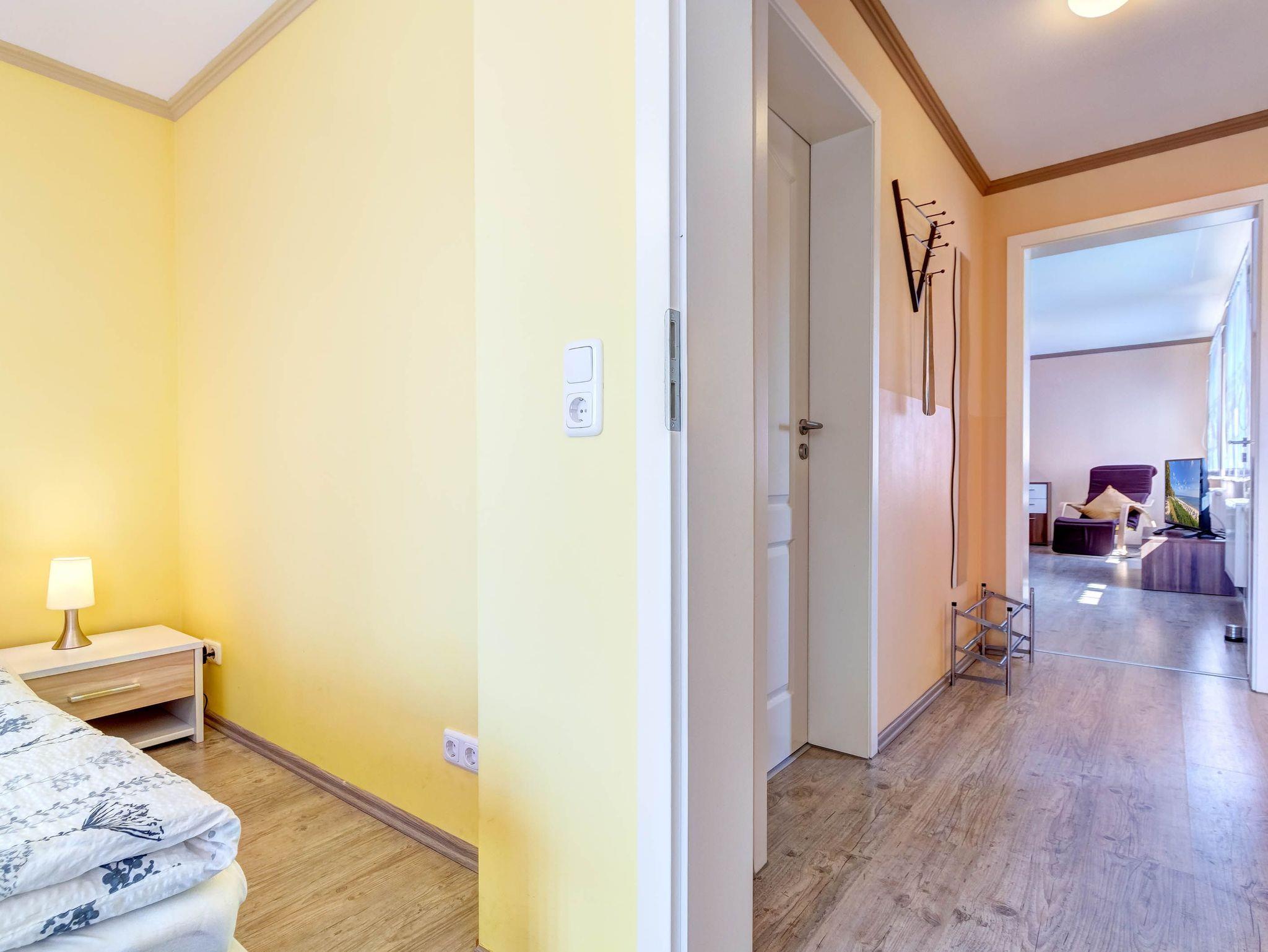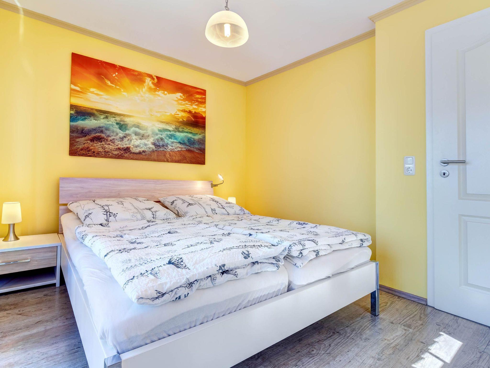 Die gemütliche 2-Raumwohnung für bis zu 4 Personen (plus ein Kleinkind bis 2 Jahre) ist modern eingerichtet und verfügt über ein großes Doppelbett im Schlafzimmer. Bettwäsche und Handtücher können selbst mitgebracht oder gegen Gebühr hinzugebucht werden. Bei Buchung des Wäschepakets sind die Betten bereits bezogen.