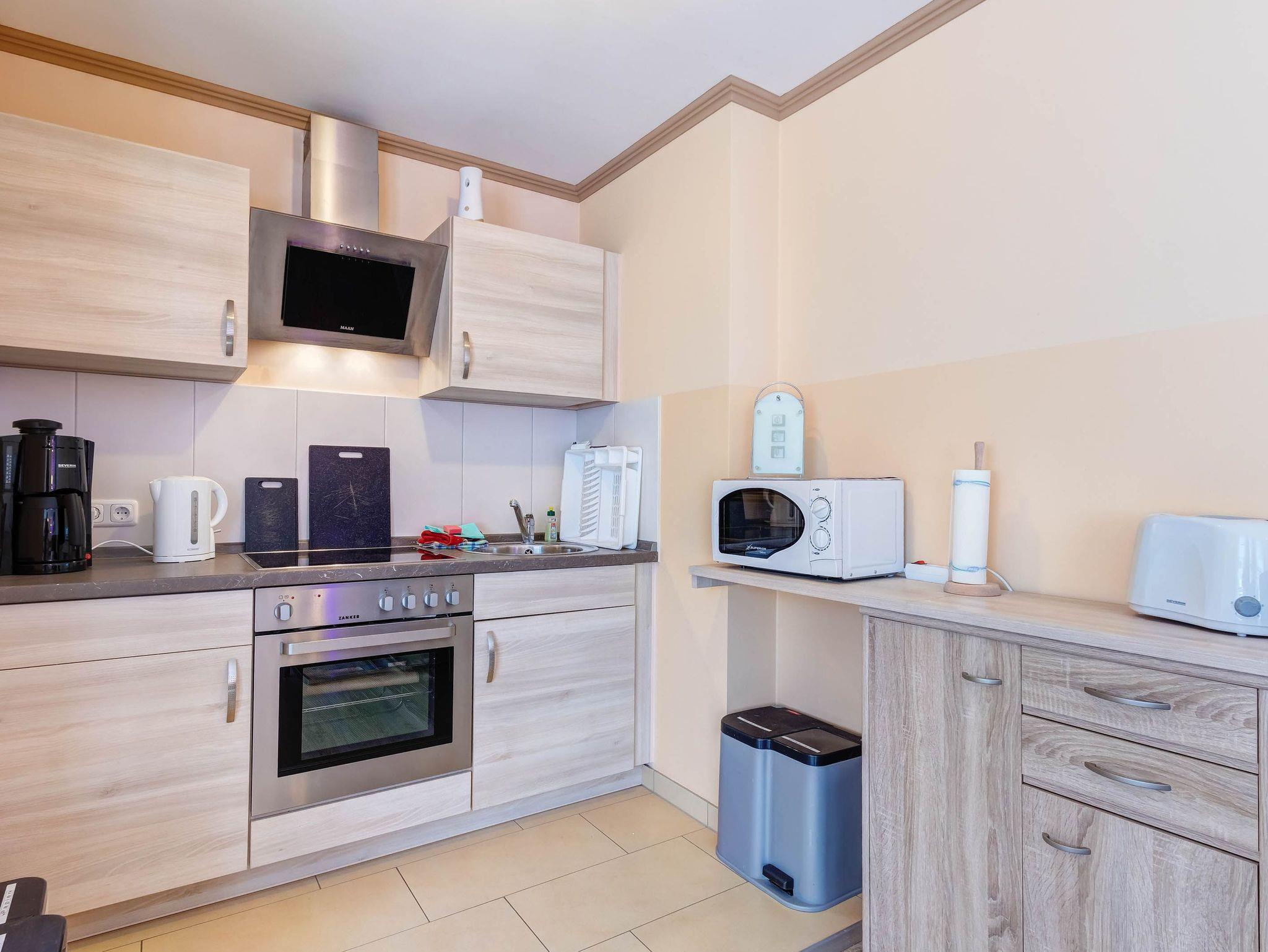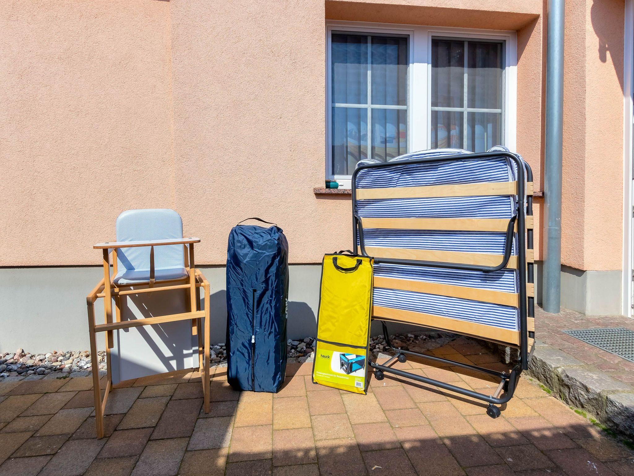 Ein Kinderbett und Hochstuhl stehen kostenfrei zur Verfügung. Die Wohnung ist mit einer Küchenzeile, einer hochwertigen Sitzgarnitur (die auch als Bett genutzt werden kann) sowie modernen Geräten wie Herd, Kühlschrank, Mikrowelle, Toaster, Wasserkocher und Kaffeemaschine ausgestattet.