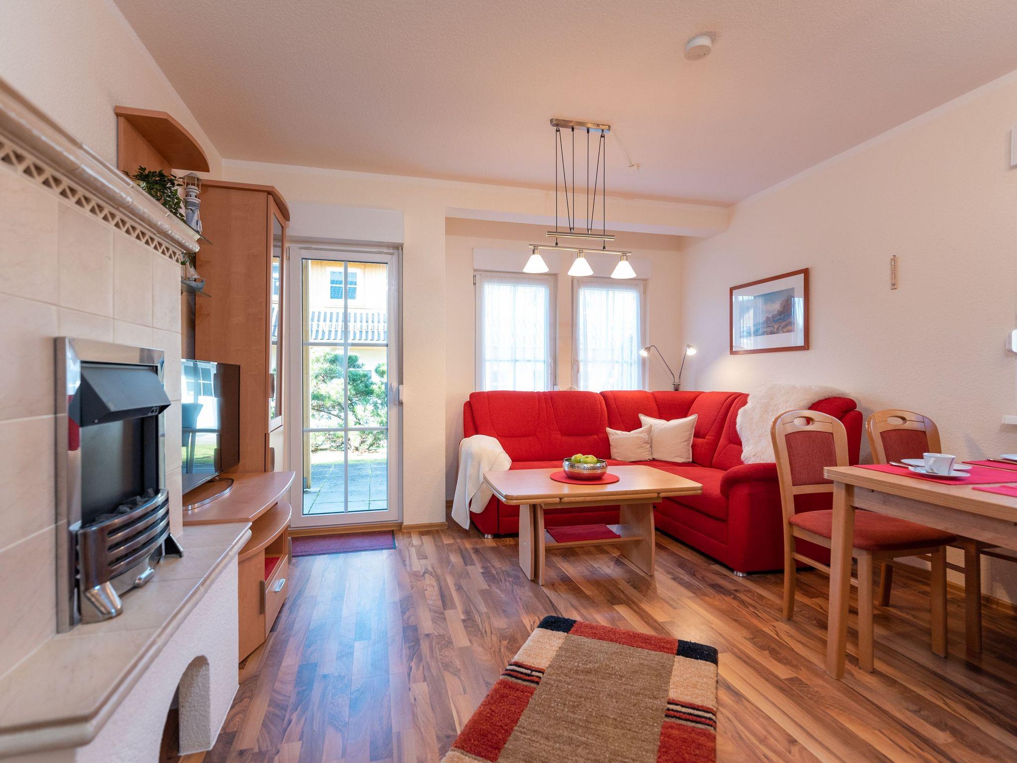 • Wohnraum: Bietet eine geräumige, neue Eck-Couch und einen Esstisch für vier Personen. Ein Elektro-Kamin sorgt für eine behagliche Atmosphäre, ergänzt durch modernes Entertainment mit Flachbild-TV, DVD-Player und Radio.