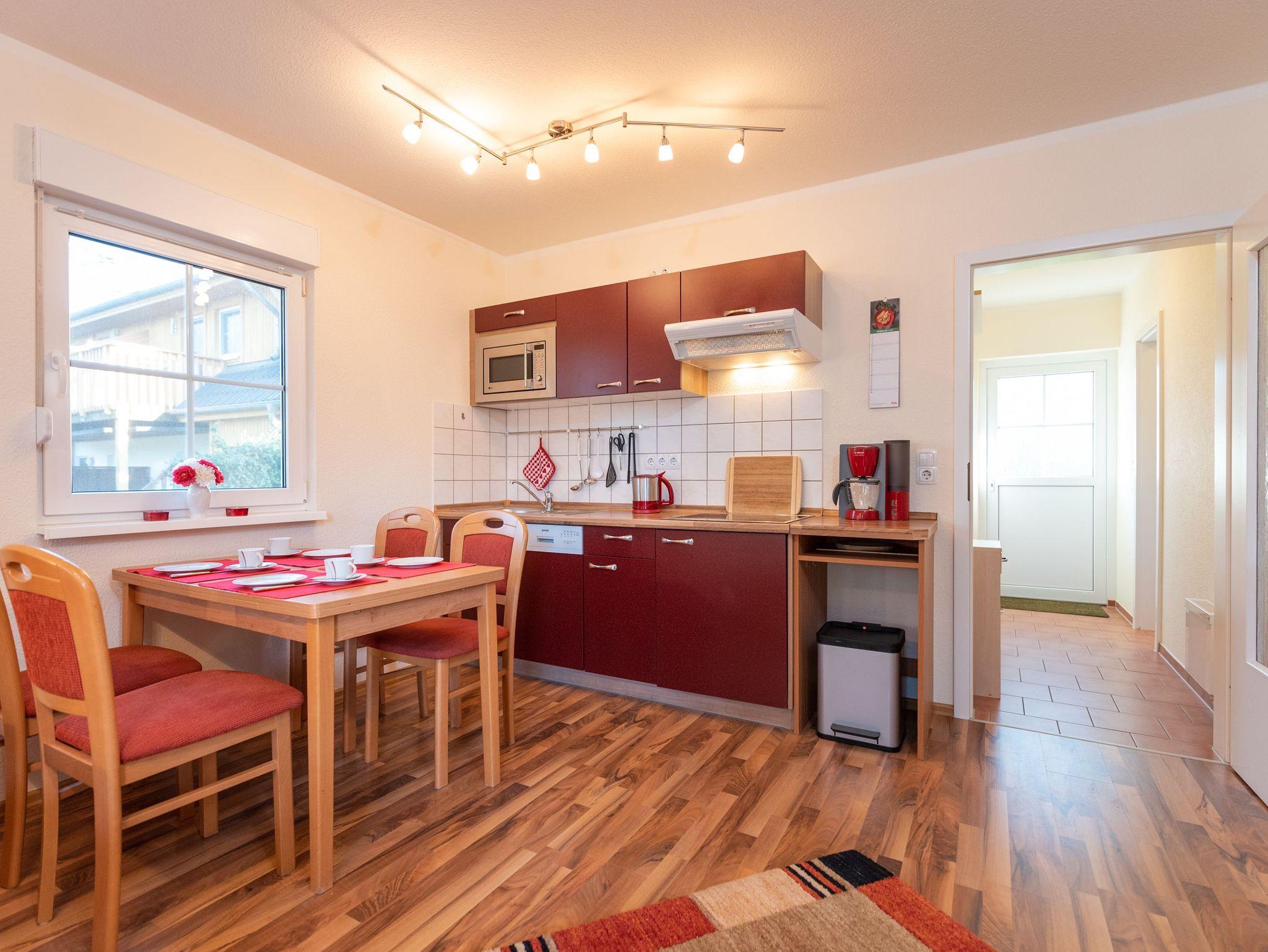 Die Ferienwohnung 6, gelegen im Erdgeschoss von Haus 2, erstreckt sich über 46 m² und bietet Gästen eine ruhige Oase mit einer großzügigen Terrasse, die malerische Ausblicke auf die gepflegte Anlage und die umliegenden Wiesen ermöglicht.