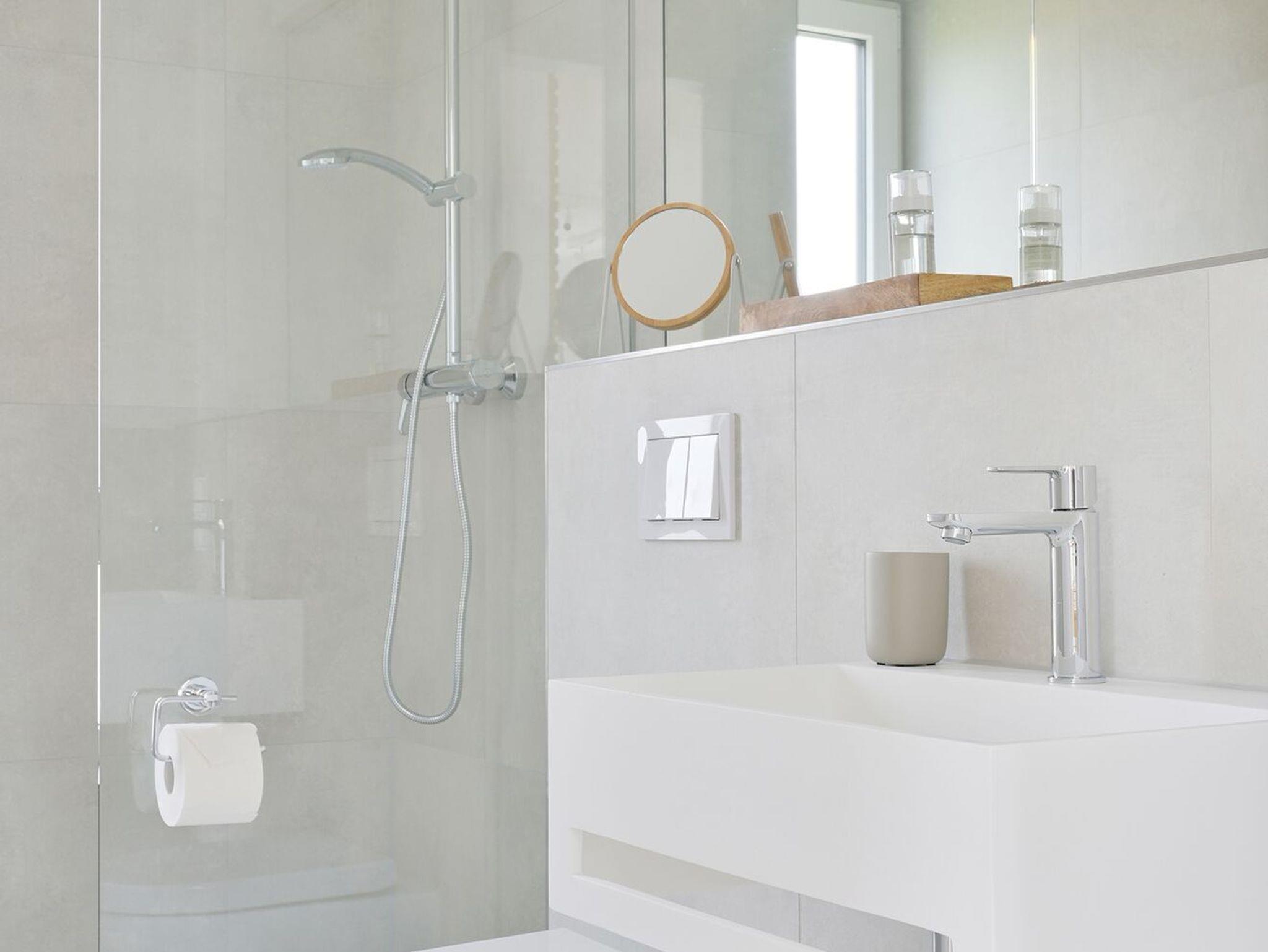 Das Badezimmer ist mit einer bodengleichen Dusche mit Regendusche ausgestattet.