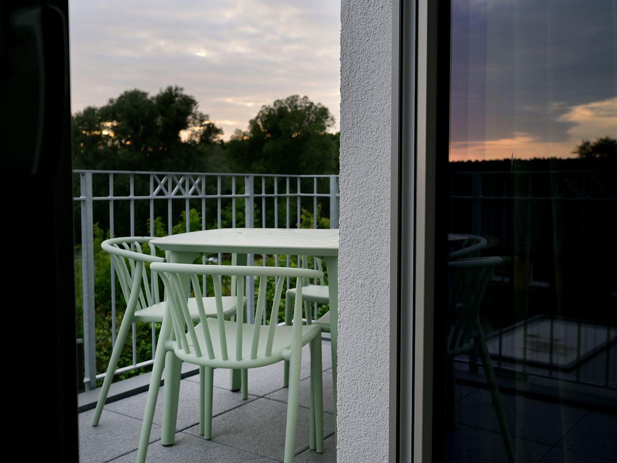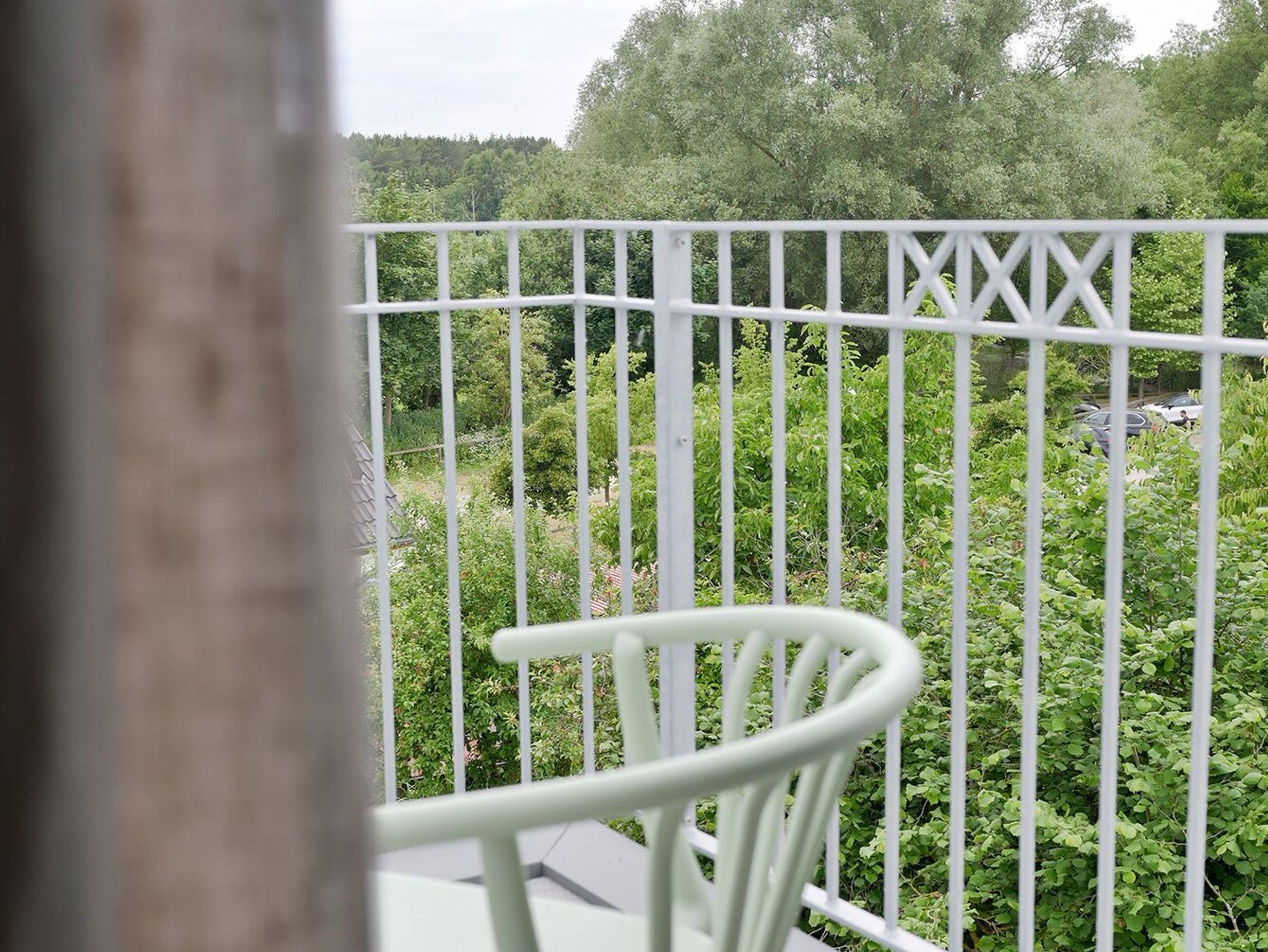 Bodentiefe Fenster ermöglichen einen direkten Zugang zum Balkon, welcher mit Gartenmöbeln ausgestattet ist. Ausgewählte Möbel und hochwertige Böden, schaffen Gemütlichkeit und ein ruhiges Raumgefühl.