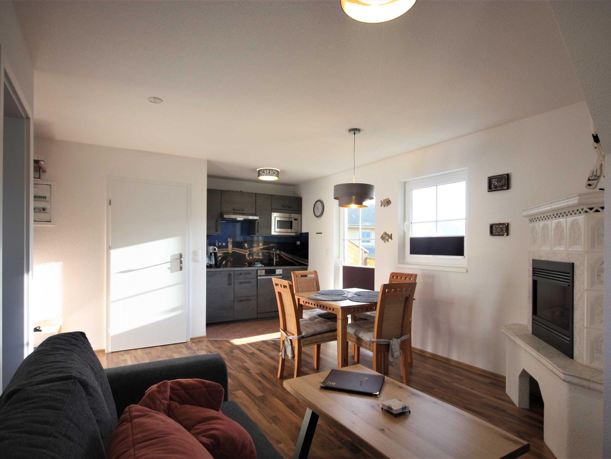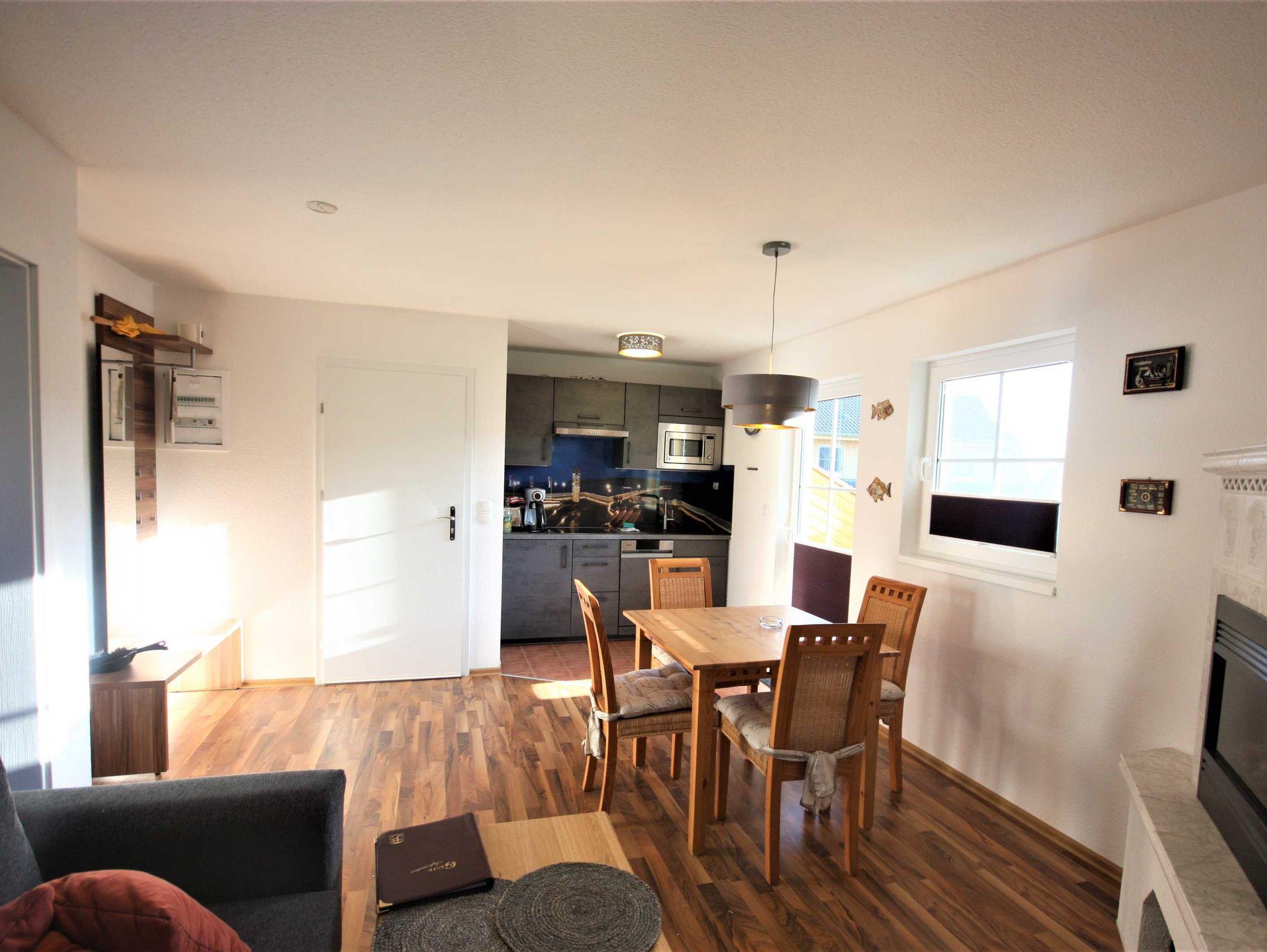 Die Ferienwohnung liegt im Obergeschoß des Ferienhauses. Sie besteht aus Wohnzimmer, offener Küche, Schlafzimmer und Tageslichtbad. Die Ausstattung der holzfarbenen Einbauküche ist neuwertig funktional und qualitativ hochwertig unter anderem mit Toaster, Kaffeemaschine, Mikrowelle mit Grill, 4-fach Kochfeld, Geschirrspüler, Gefrierfach. Großer südwest Balkon.