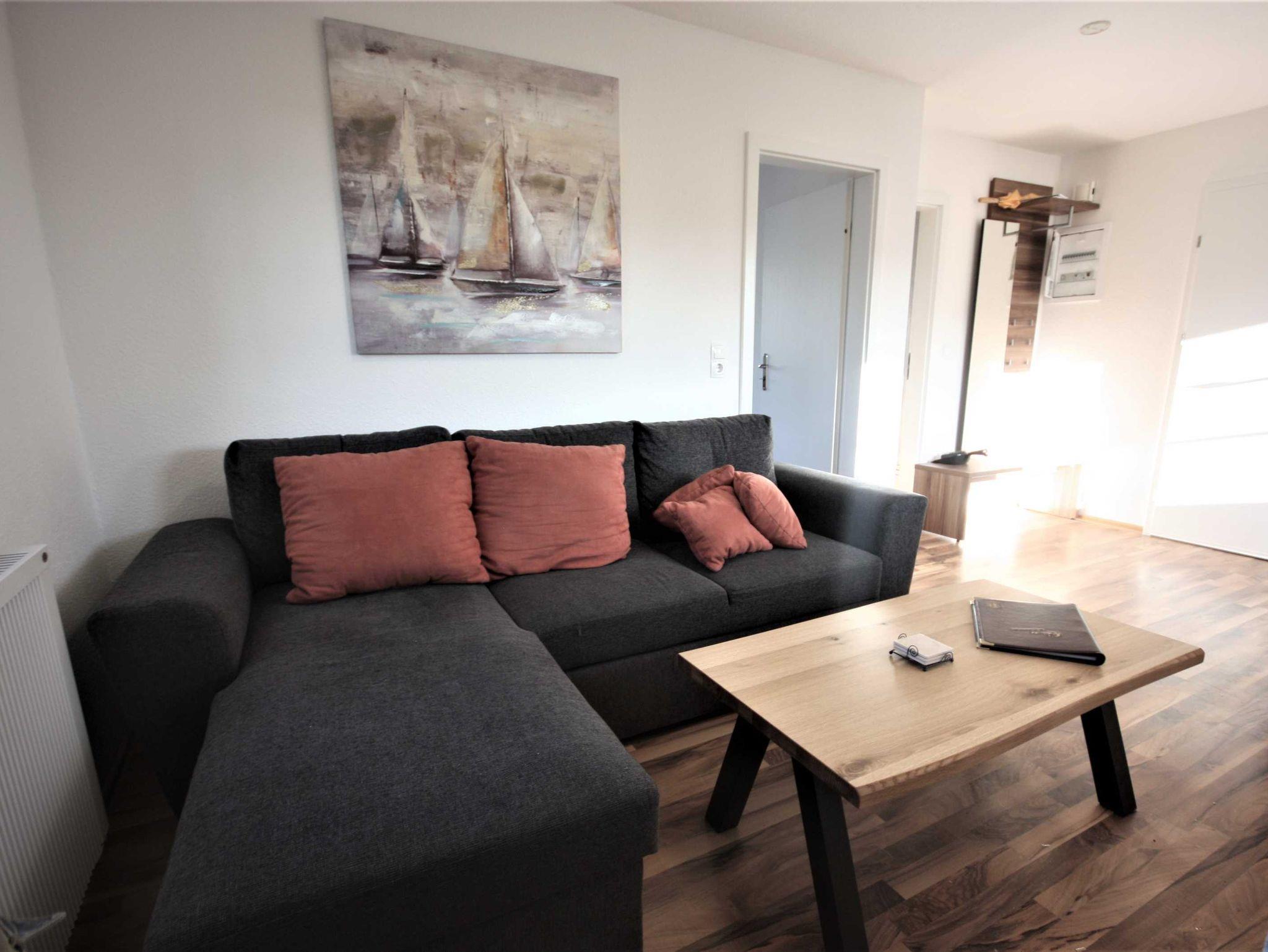 Die Wohnung ist im modernen Landhausstil mit Laminatboden und rot/brauner Möblierung gehalten. Die Wohnung verfügt über ein Schlafzimmer mit Doppelbett und ein Schlafsofa im Wohnzimmer. Die Wohnung ist ideal geeignet für Paare, Einzelreisende und junge Familien. Im Schlafzimmer kann ein Kinderbett aufgestellt werden.