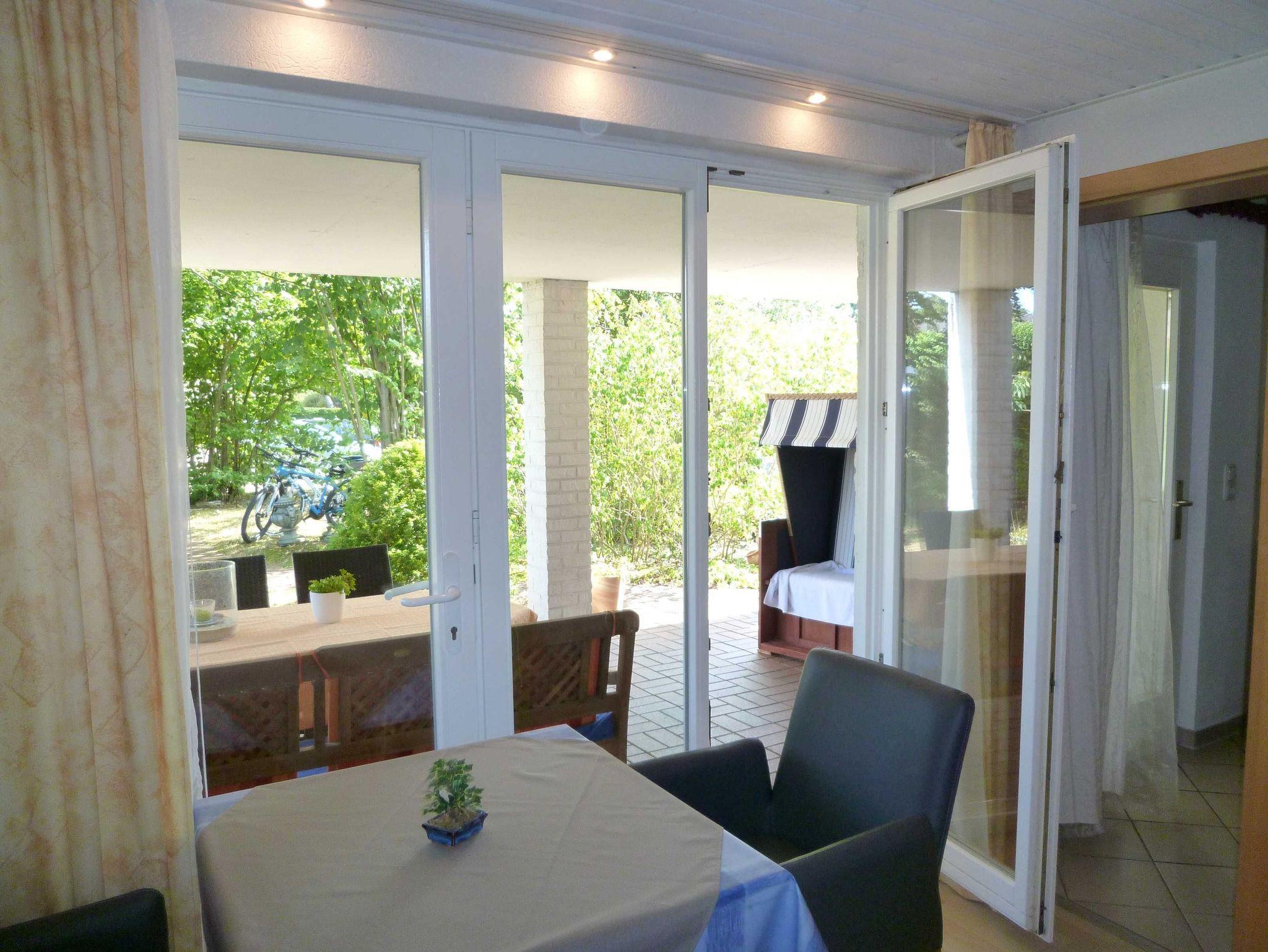 2-Raum-Wohnung mit separatem Eingang ca. 50 m² + 20 m² überdachte Terrasse für bis zu 3 Personen. Wohnzimmer und Schlafzimmer komplett verglast zur Terrasse. Anspruchsvolle und komfortable Ausstattung. Ein Fernsehsessel lädt im Wohnzimmer zum gemütlichen Entspannen ein. An die Terrasse angrenzend herrlicher Garten mit Grillmöglichkeit. Die möblierte Terrasse mit 2 Rollliegen ist ein toller Platz zum Erholen im Grünen. Die Wohnung wird durch eine separate Küche mit Essbereich abgerundet. Sie wohnen in ruhiger Lage nur 2 Gehminuten zum feinsandigen Ostseestrand.