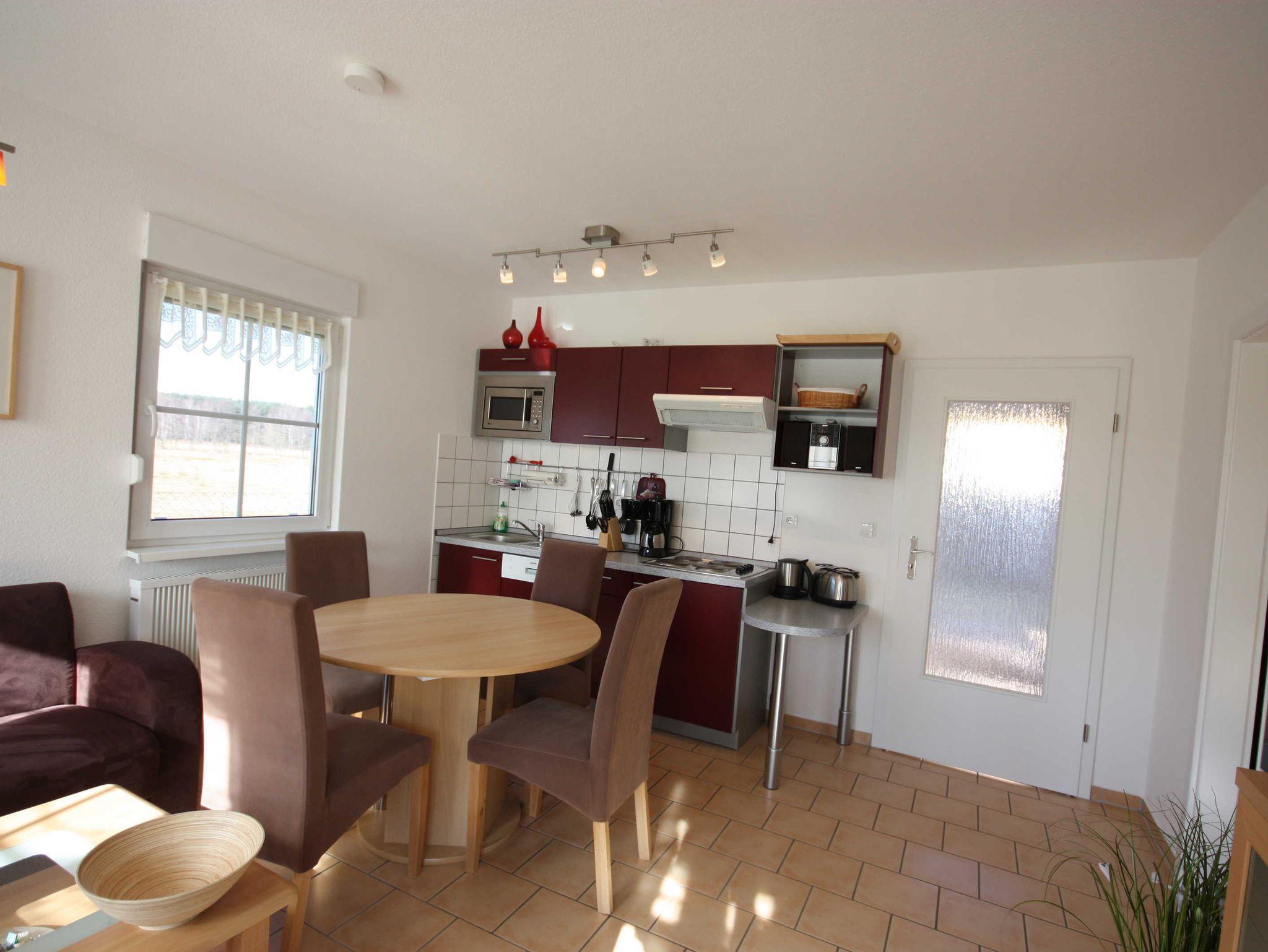 Die Ferienwohnung liegt im Erdgeschoß des Ferienhauses. Sie besteht aus Wohnzimmer, kompl. ausgestatteter Küche, Schlafzimmer und Tageslichtbad mit Waschmaschine. Die Ausstattung der bordeauxfarbenen Einbauküche ist funktional und qualitativ hochwertig unter anderem mit Toaster, Kaffeemaschine, Mikrowelle mit Grill, 4-fach Kochfeld, Geschirrspüler, Gefrierfach. Von der großen Süd-Terrasse und aus dem Küchenfenster hat man einen fantastischen Blick auf die Wiesen Richtung Achterwasser. Sie verfügt über einen kleinen Elektroedelstahleffektkamin.