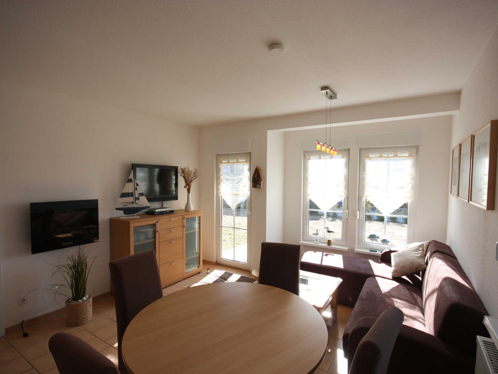 Die Wohnung ist im modernen Landhausstil mit Laminatboden und weiß/brauner Möblierung gehalten. Die Inneneinrichtung wurde 2014 komplett renoviert. Die Wohnung verfügt über ein Schlafzimmer mit Doppelbett und ein Schlafzimmer mit Etagenbett. Die Wohnung ist ideal geeignet für Familien und Hundeliebhaber.