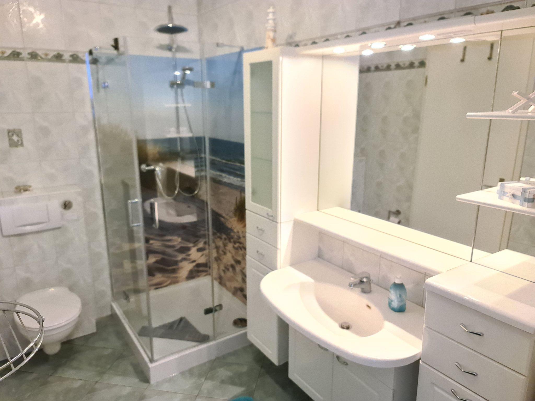 In der Ferienwohnung Schmittchen ( für 4 Personen + 1 Kleinkind im zusätzlichen Reisebett) können Sie gleich im Flur Ihre Schuhe und alltägliche Garderobe ablegen. Das Bad ist mit Dusche und WC ausgestattet. Die nebenliegende Küche bietet Ihnen eine Küchenzeile mit Backofen und Ceranfeld, einen Dunstabzug, einen Kühlschrank, eine Mikrowelle, einen Geschirrspüler, Kaffeemaschine, Toaster und mehrere Abstellmöglichkeiten und Schränke mit Geschirr/Kochgeschirr sowie Haushaltsutensilien. Zur Unterhaltung haben Sie hier ein Radio. Im angrenzenden Schlafzimmer mit Doppelbett finden Sie genügend Platz für Ihre Garderobe. Zum Entspannen ist das geräumige Wohnzimmer nebenan. Hier können Sie ungestört Radio hören, TV-Sendungen sehen oder einfach relaxen und ein spannendes Buch lesen. Die Aufbettung für 2 Personen erfolgt auf der ausklappbaren Schlafcouch. Für Sonnenhungrige steht die Terrasse offen, ausgestattet (Mai-Oktober) mit Tisch und Stühlen, Sonnenschirm, einem Strandkorb und einem Holzkohlegrill.