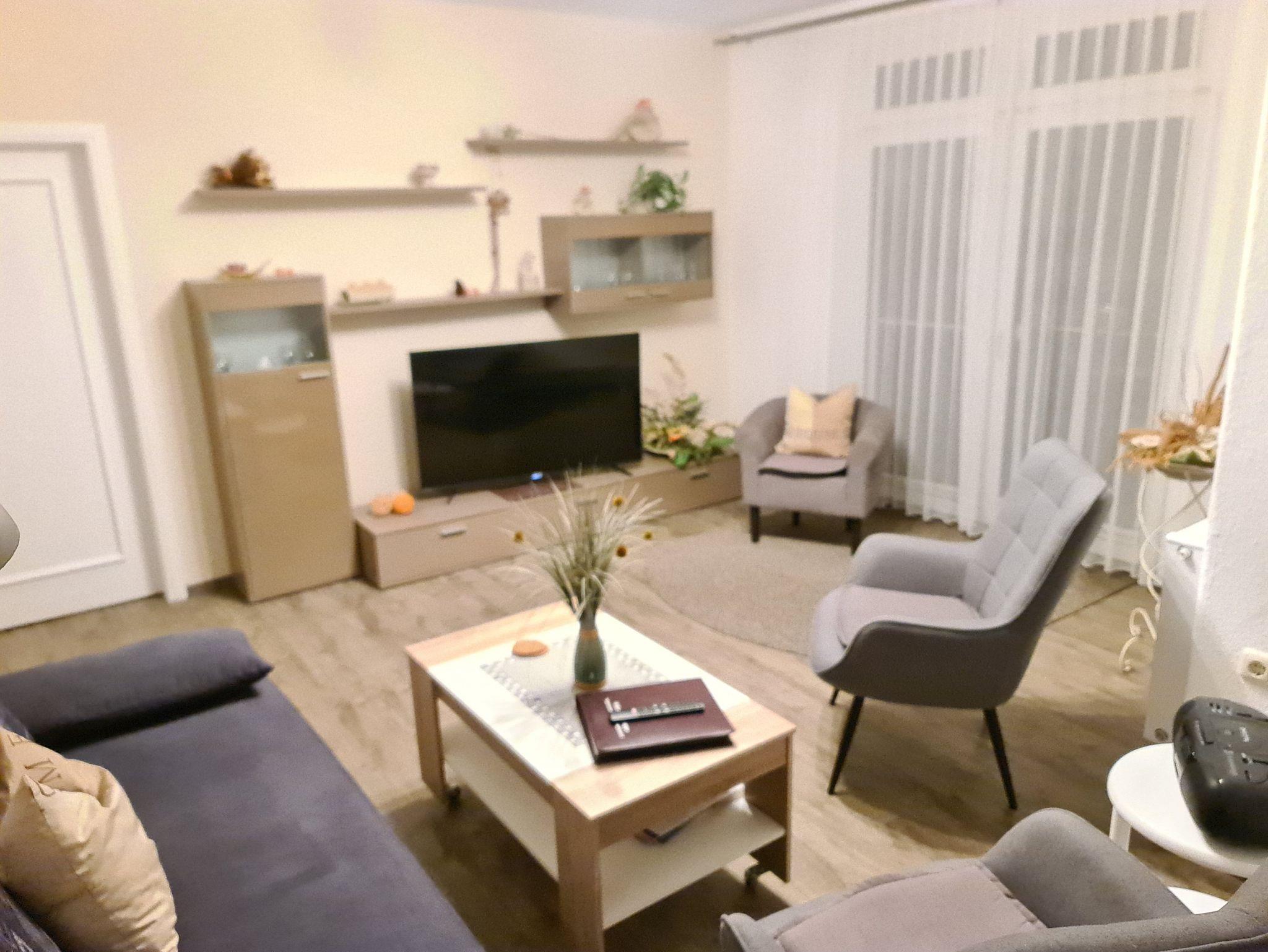 • 1 geräumiges Wohnzimmer mit ausklappbarer Schlafcouch (ca. 1,60m x 2,00m), Sessel und Flat-TV sowie Zugang zur Terrasse
